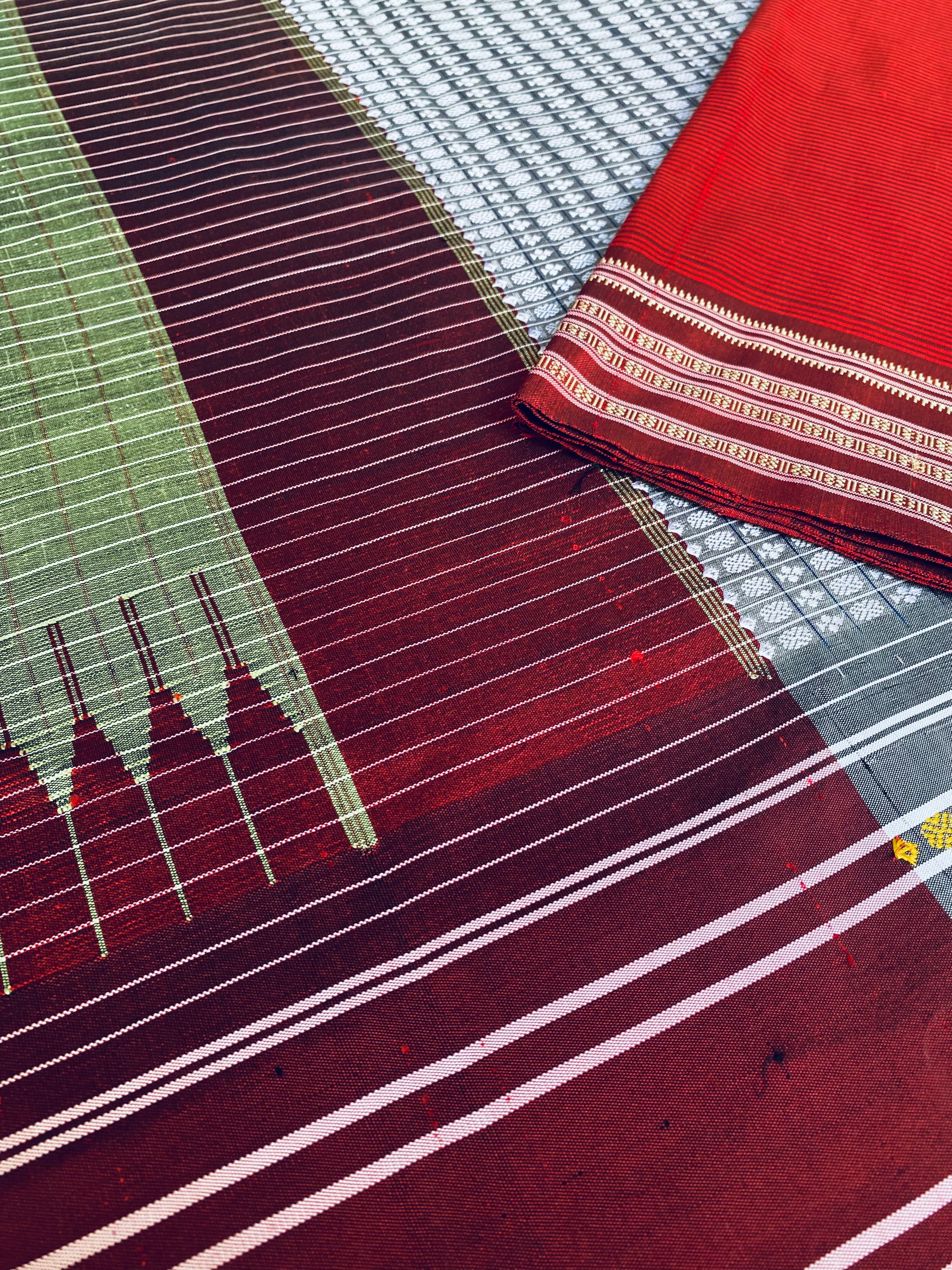Aparanji. The traditional borders of our ‘Aparanji’ series. ‘Aparanji’, meaning pure gold, the making of something brilliant. From the mind of the designer to the hands of the weavers and finally to the hearts of those who possess this thing of beauty. As close as it can get to it’s purest, most traditional form as a saree, this piece of art is truly stunning. Some with colours of old, the original. Some reinterpreted with colours that make your eyes look upon this saree with pure satisfaction.