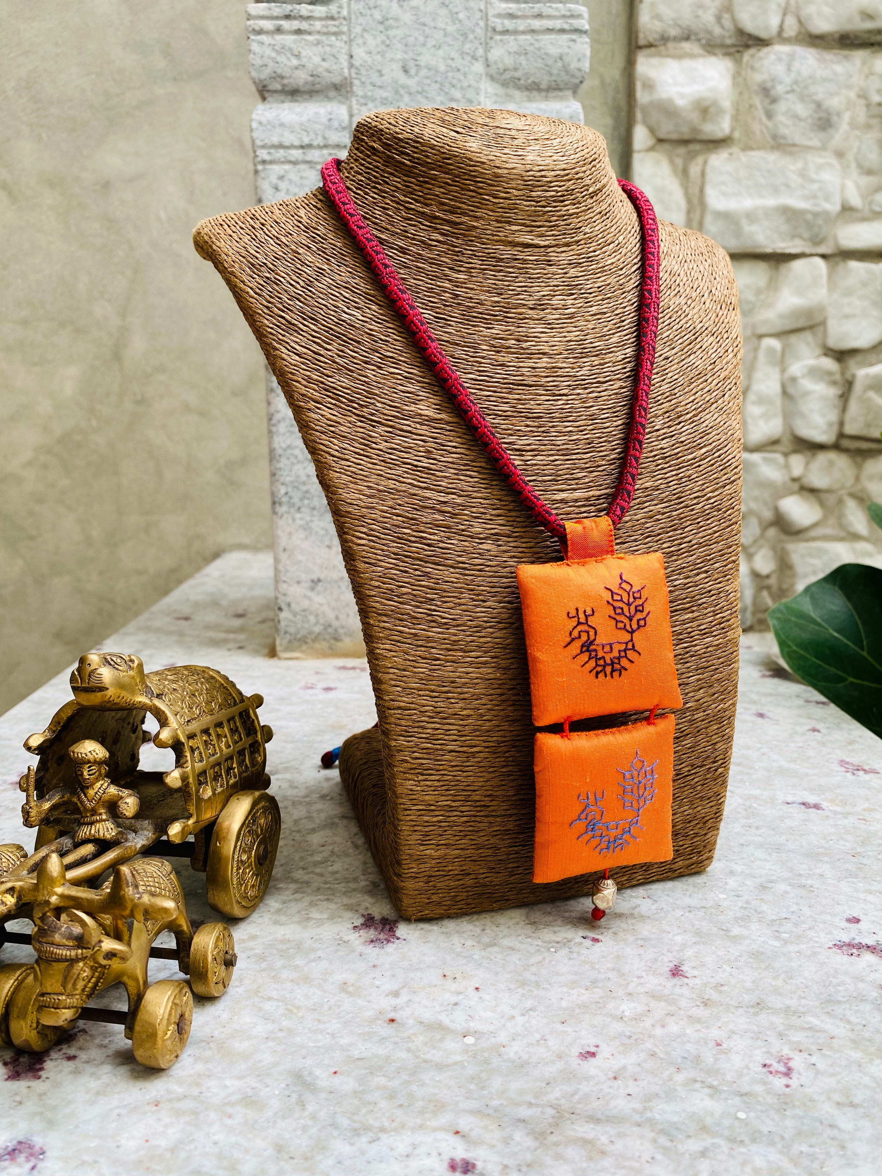 Dwiti, dual, a beautiful twosome. The pendant here is created by stringing two silk potlis bearing elegant hand Kasuti, to each other, each potli in tones of orange, brought together aesthetically. The delicate attachment made with precision thread work so that they elegantly swing, separate yet together.