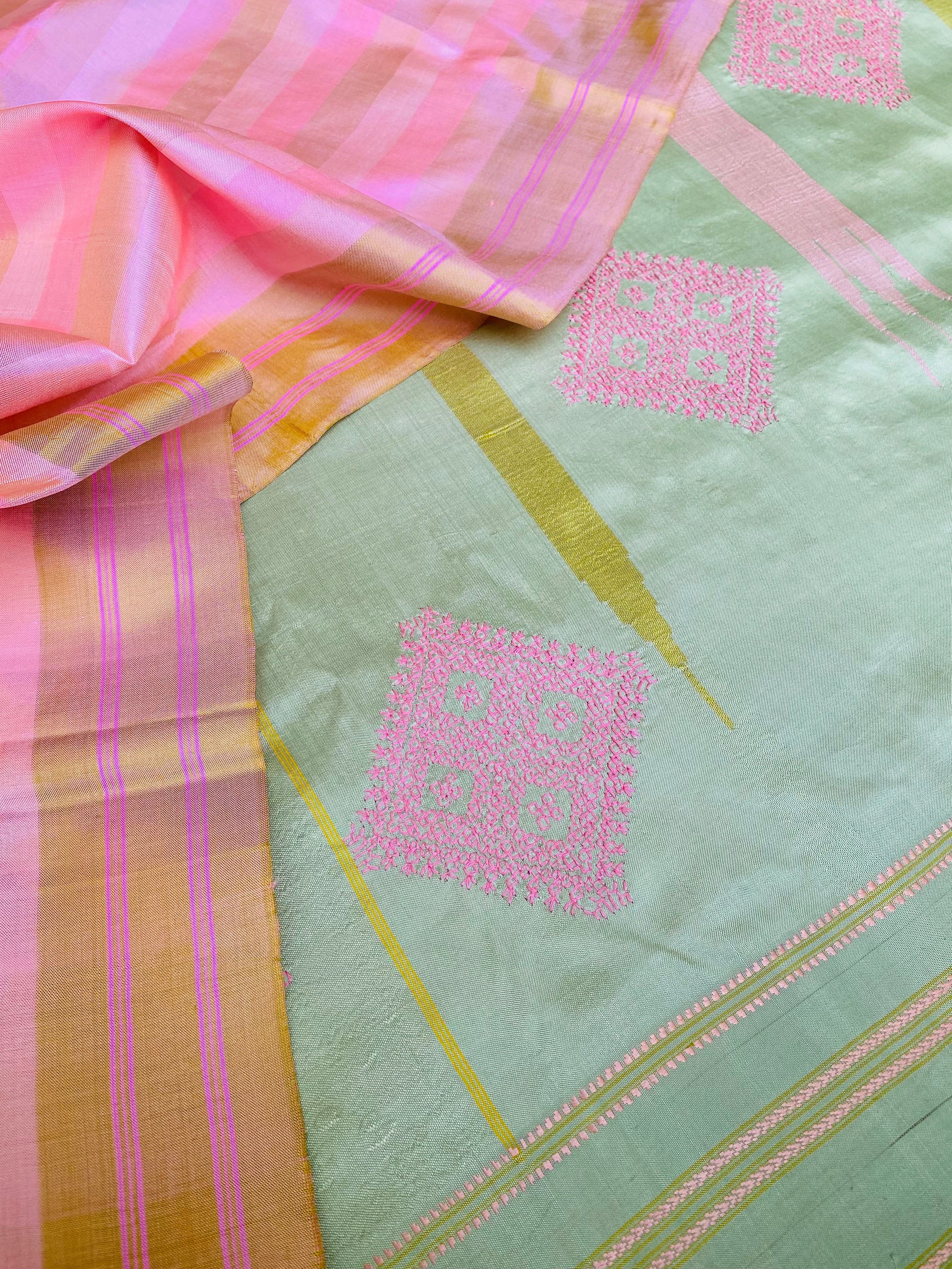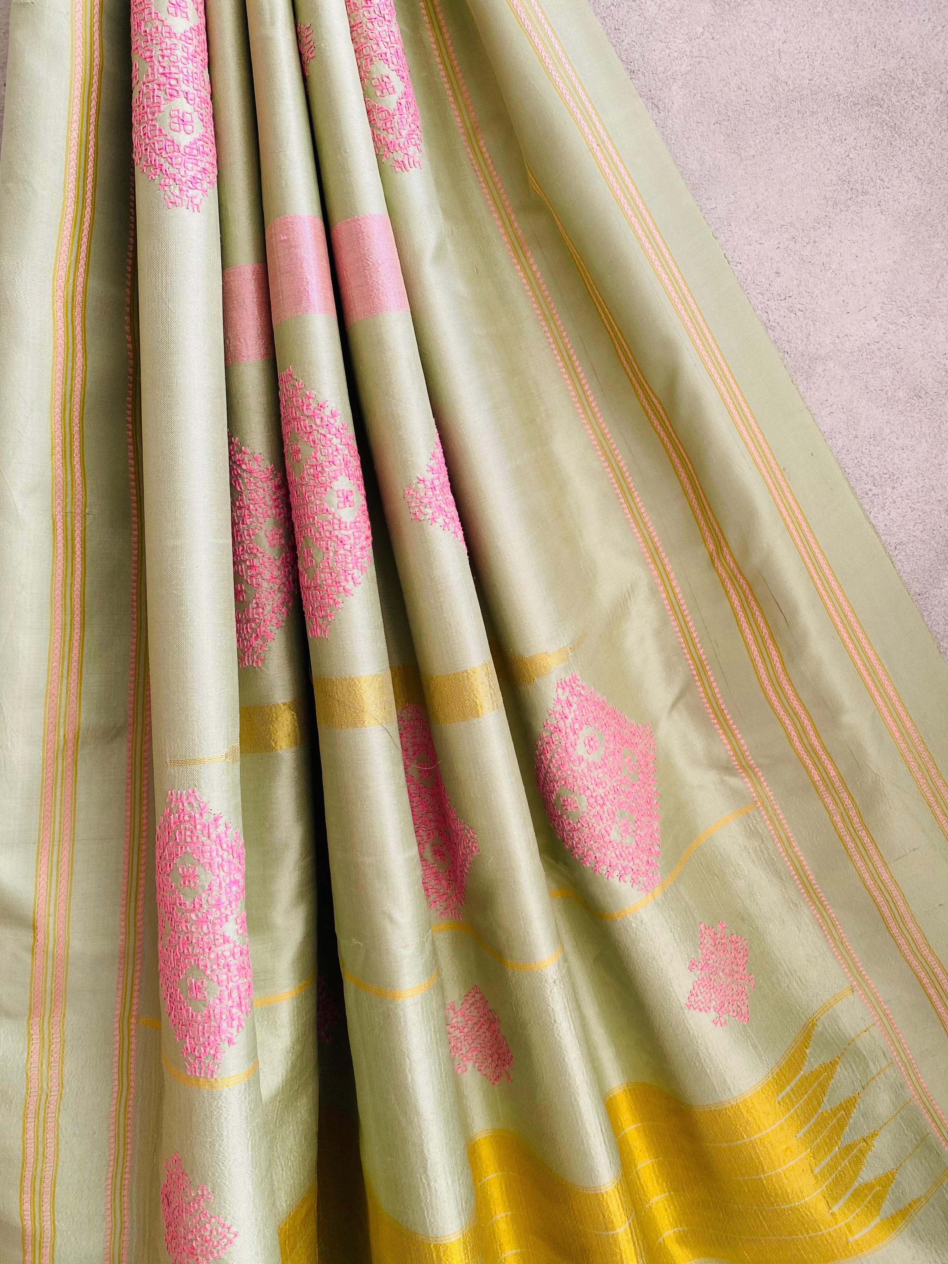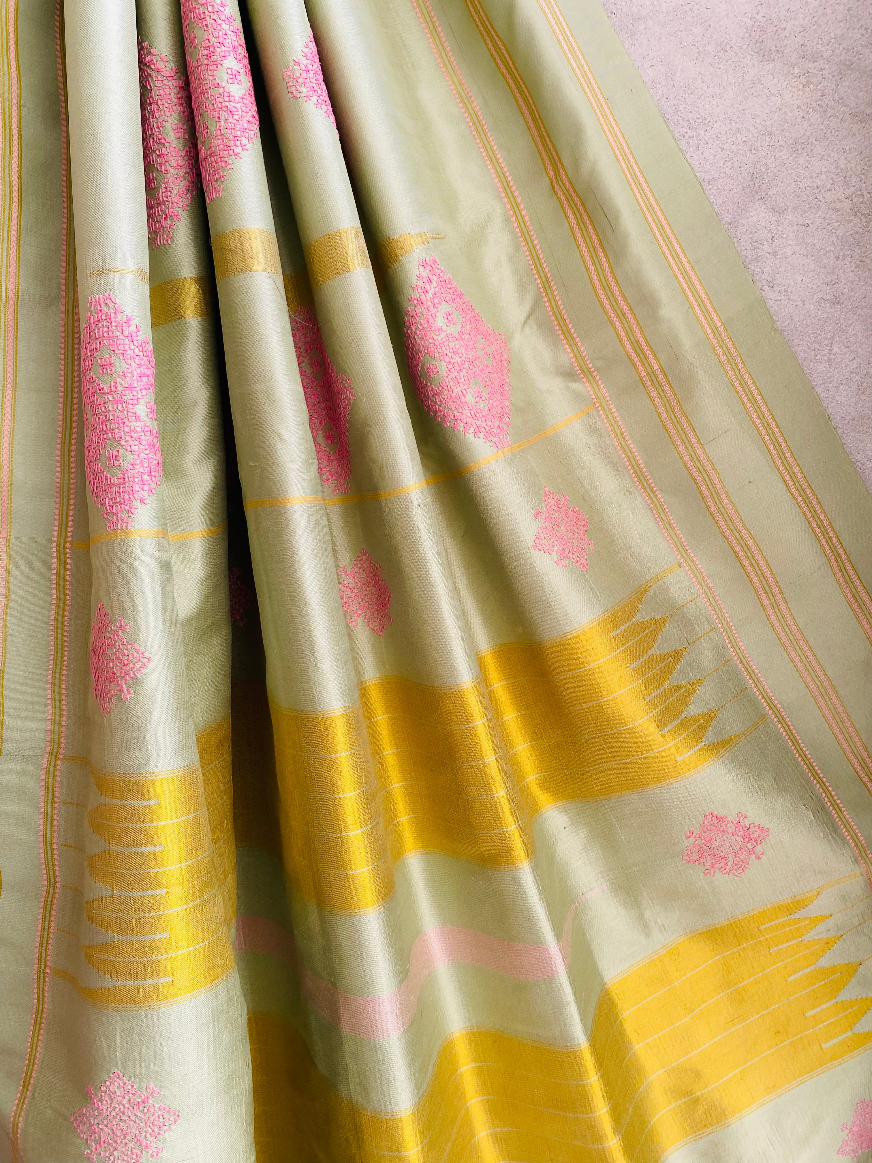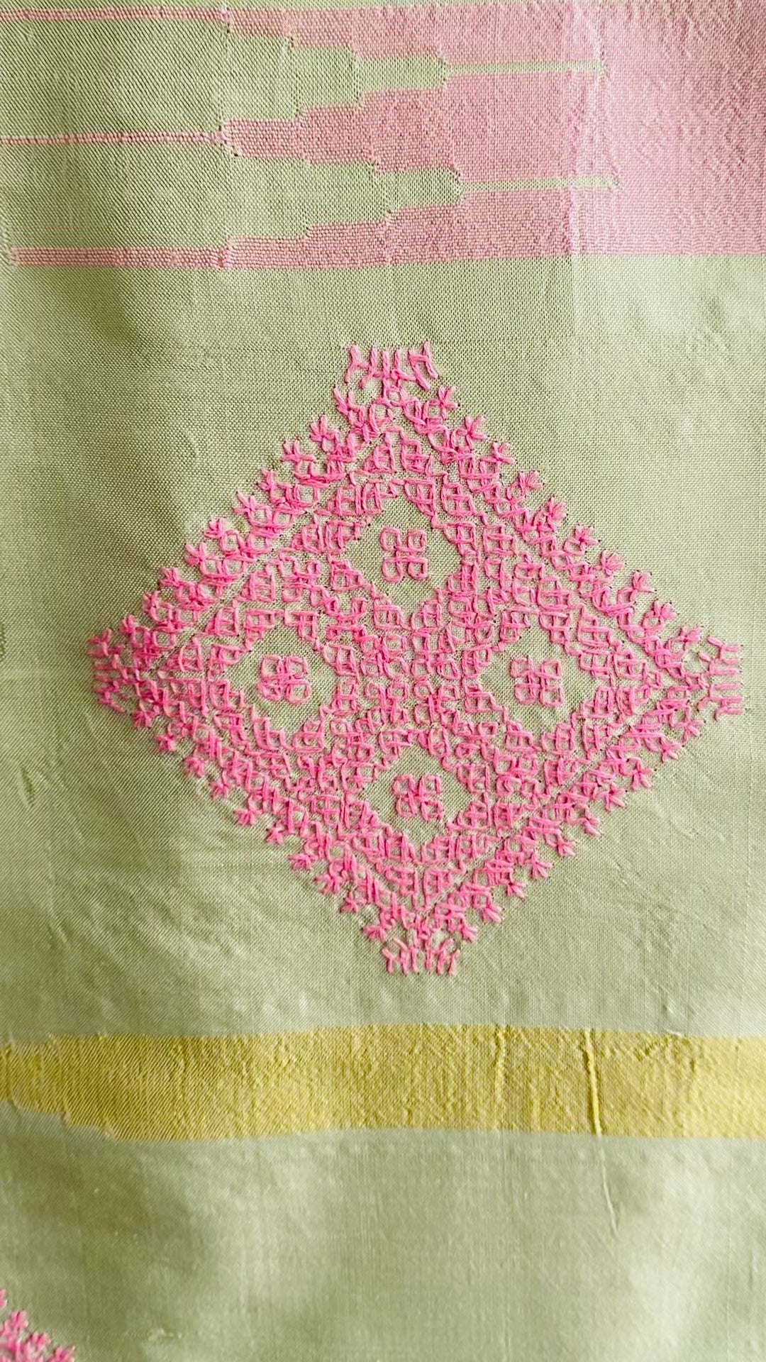 So easy to wear and so light, this unique piece is woven on handloom (pitloom) and made of 100% mulberry silk, this saree sports a Gadi-Dadi border and quintessential tope teni pallu. To make this all the more brilliant, you will find stunningly done Kasuti hand embroidery through the body of the saree. KaleNele works hand in hand with a NGO based on Dharward to train women from distressed backgrounds on Kasuti and provide them an opportunity to a sustainable livelihood to build their lives onwards and upwards. This comes with a coordinated pure mulberry silk Ilkal blouse fabric of 1 meter.