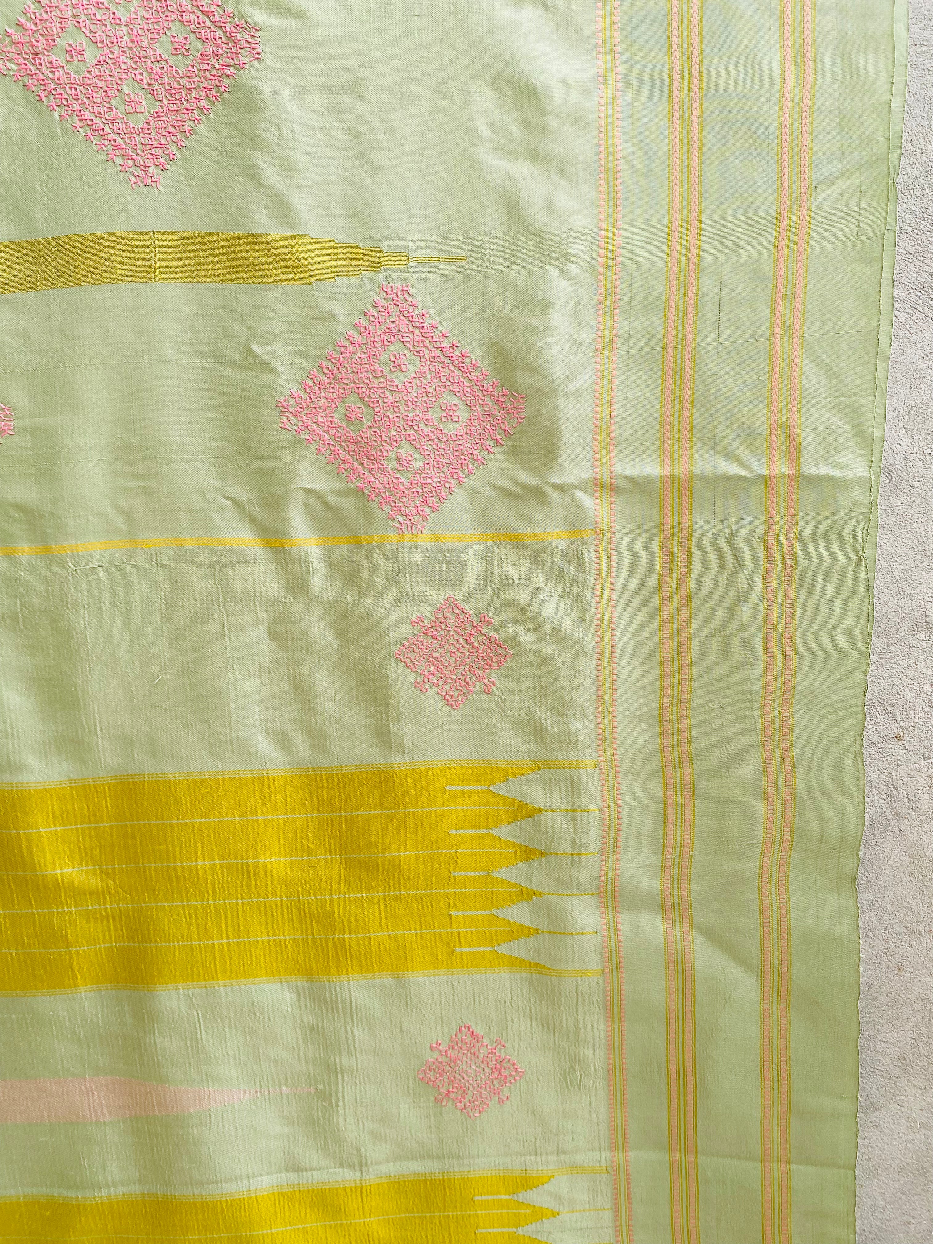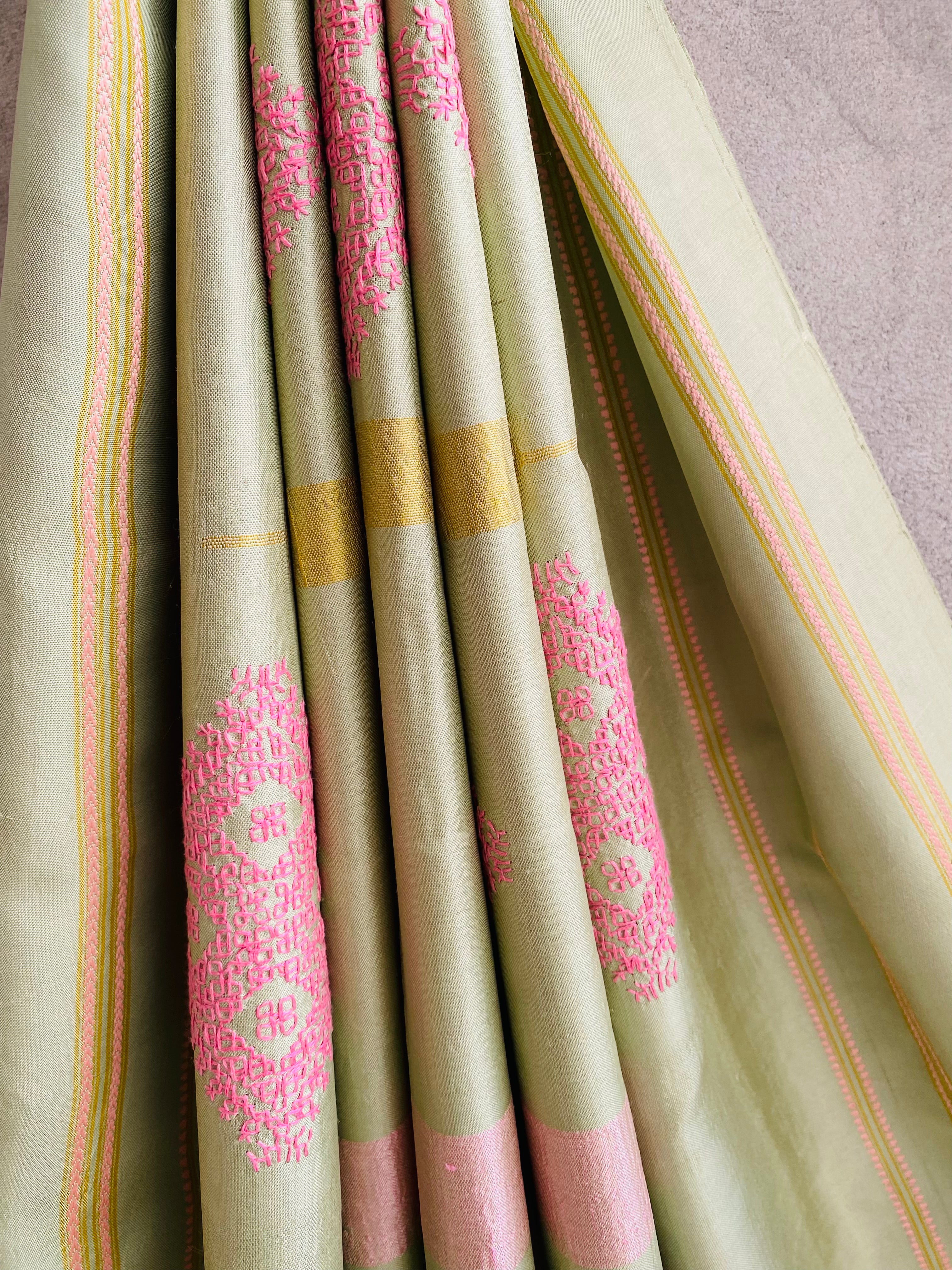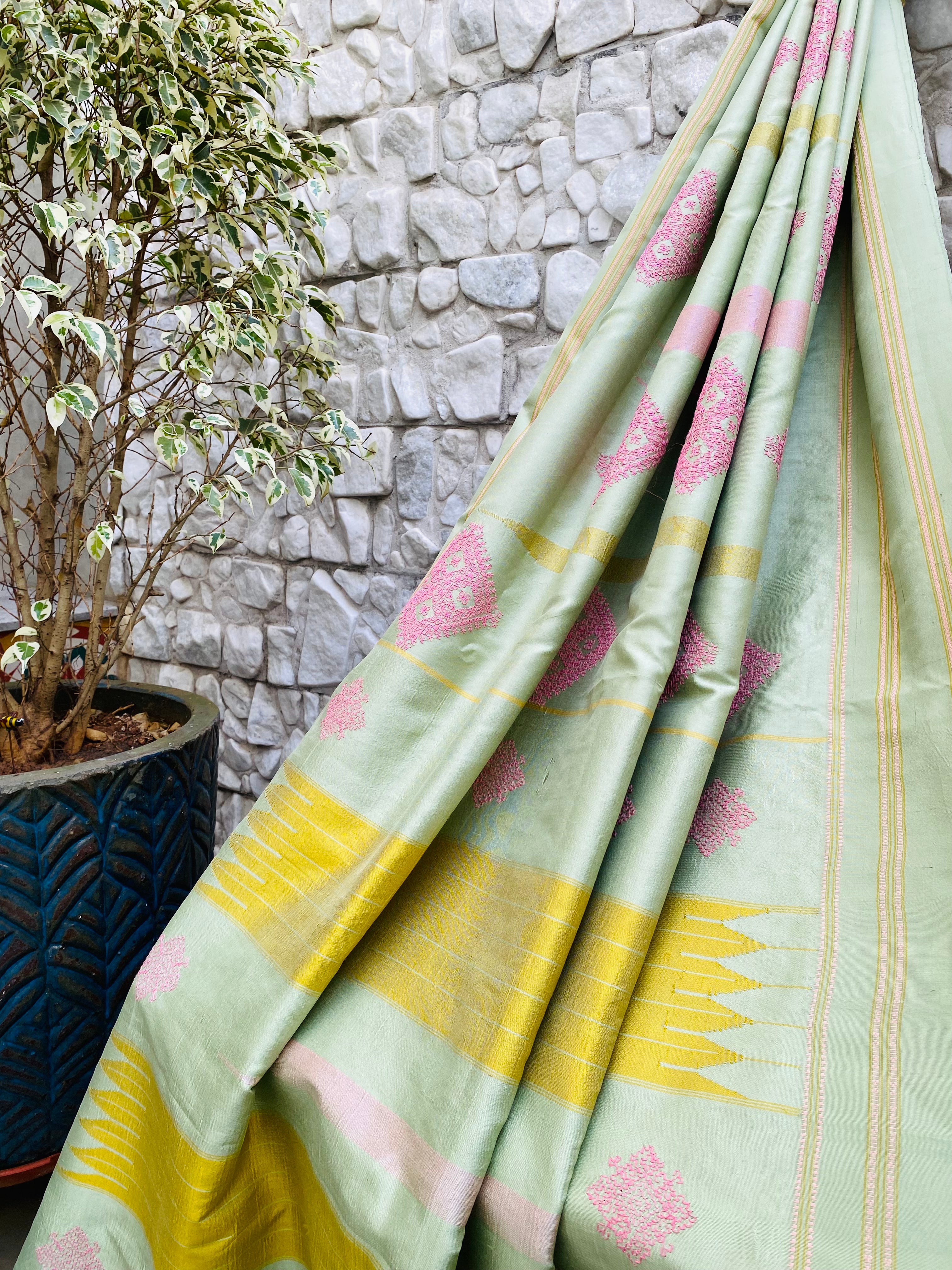 So easy to wear and so light, this unique piece is woven on handloom (pitloom) and made of 100% mulberry silk, this saree sports a Gadi-Dadi border and quintessential tope teni pallu. To make this all the more brilliant, you will find stunningly done Kasuti hand embroidery through the body of the saree. KaleNele works hand in hand with a NGO based on Dharward to train women from distressed backgrounds on Kasuti and provide them an opportunity to a sustainable livelihood to build their lives onwards and upwards. This comes with a coordinated pure mulberry silk Ilkal blouse fabric of 1 meter.