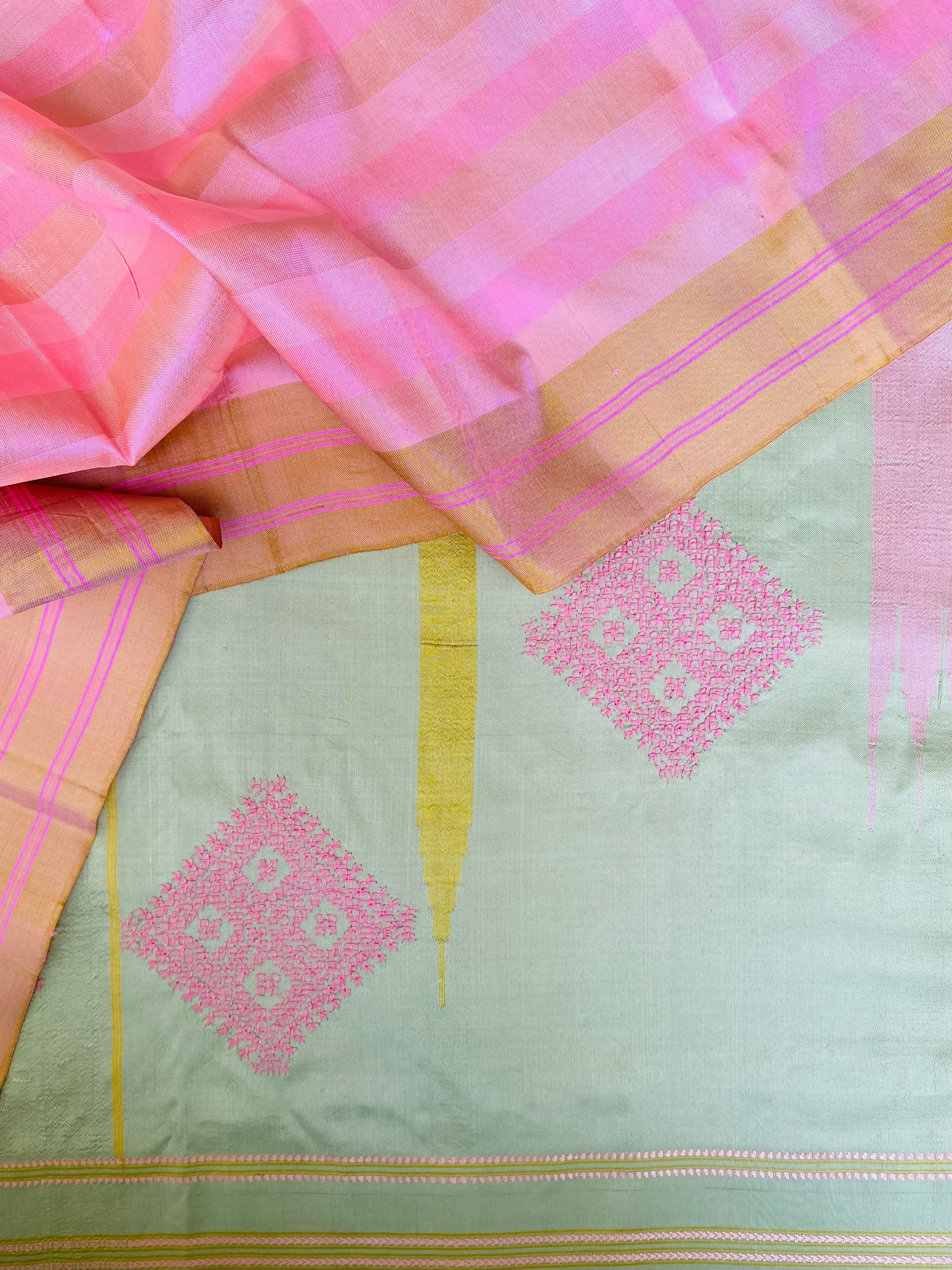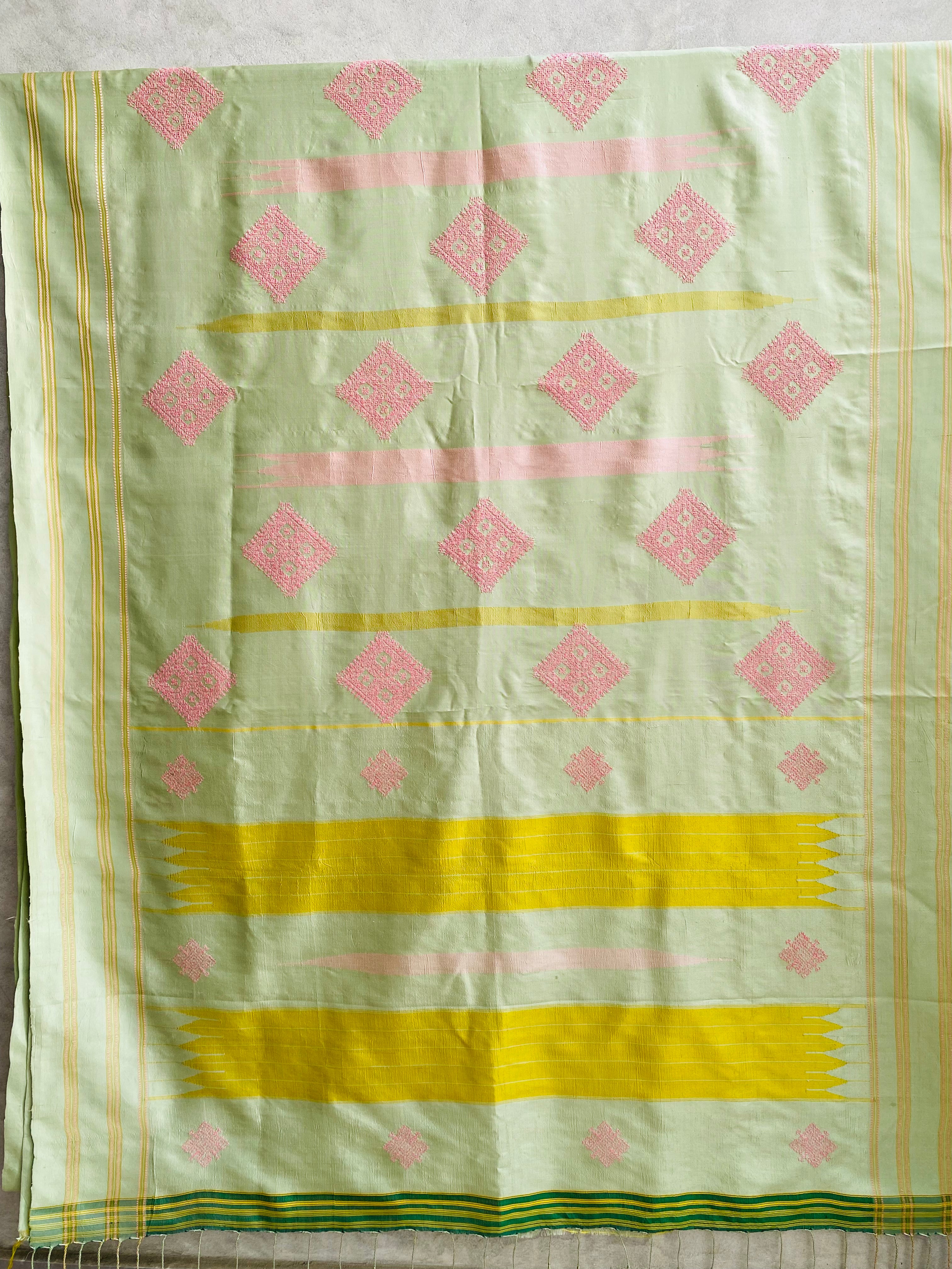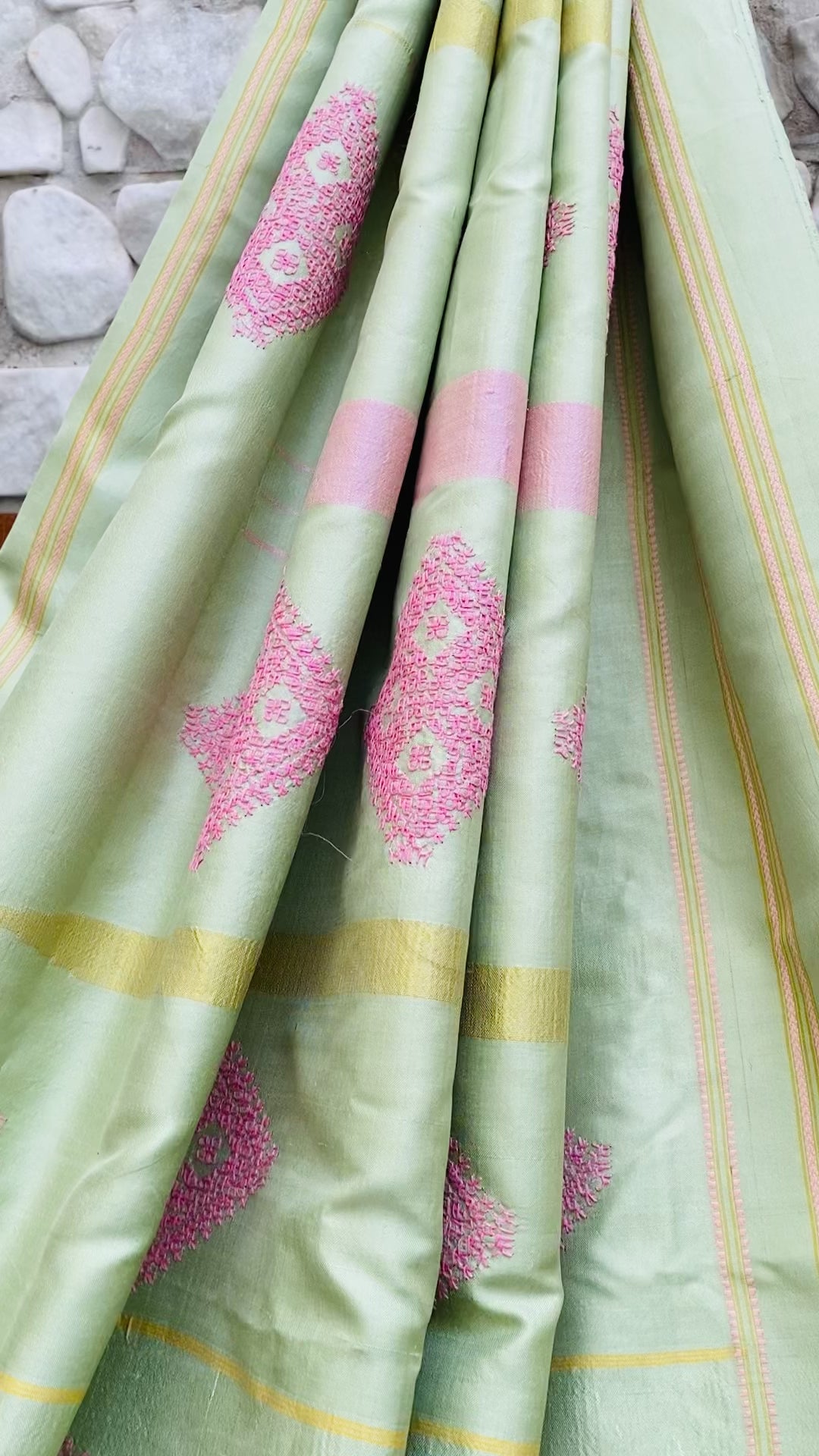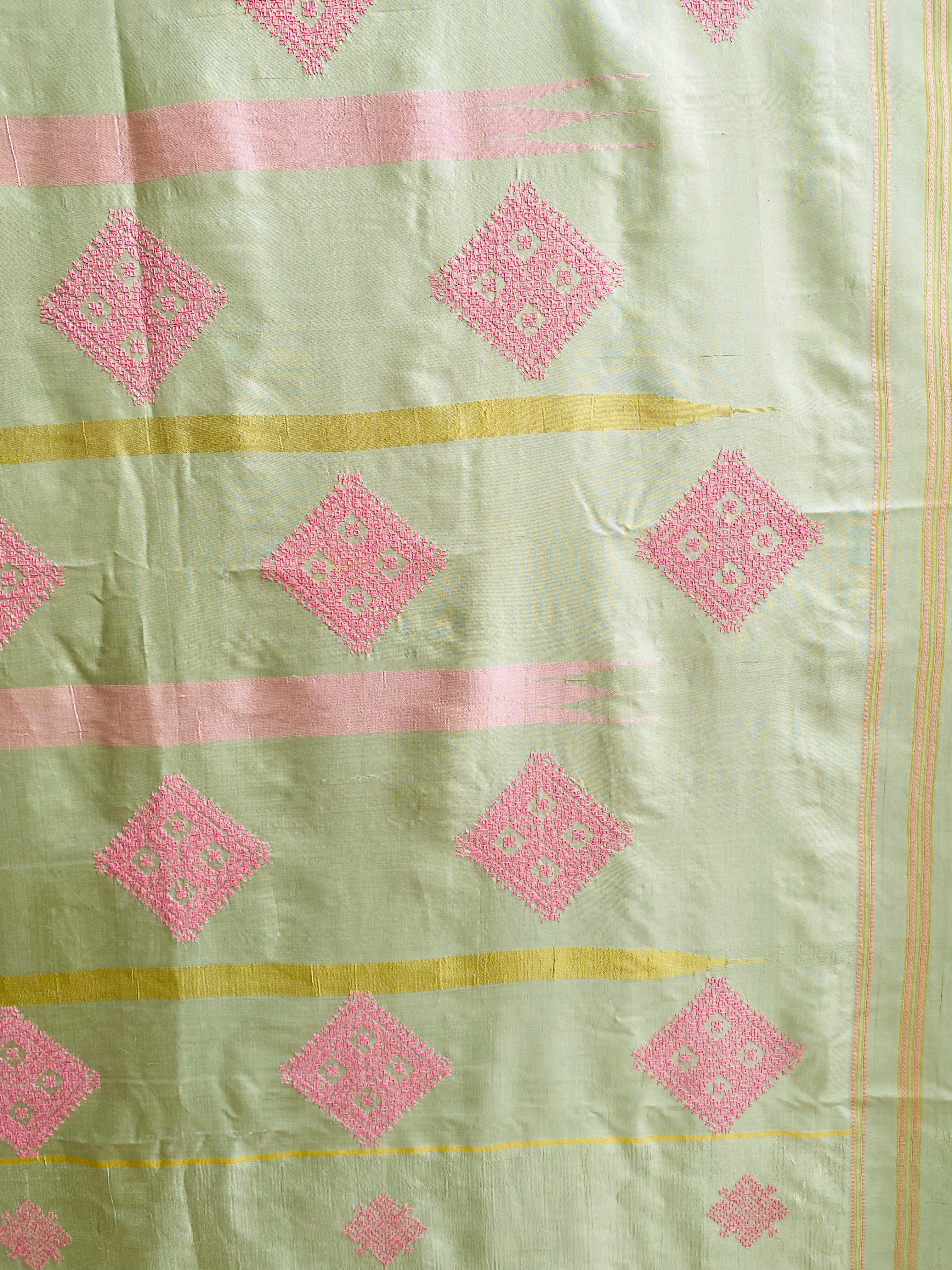 So easy to wear and so light, this unique piece is woven on handloom (pitloom) and made of 100% mulberry silk, this saree sports a Gadi-Dadi border and quintessential tope teni pallu. To make this all the more brilliant, you will find stunningly done Kasuti hand embroidery through the body of the saree. KaleNele works hand in hand with a NGO based on Dharward to train women from distressed backgrounds on Kasuti and provide them an opportunity to a sustainable livelihood to build their lives onwards and upwards. This comes with a coordinated pure mulberry silk Ilkal blouse fabric of 1 meter.