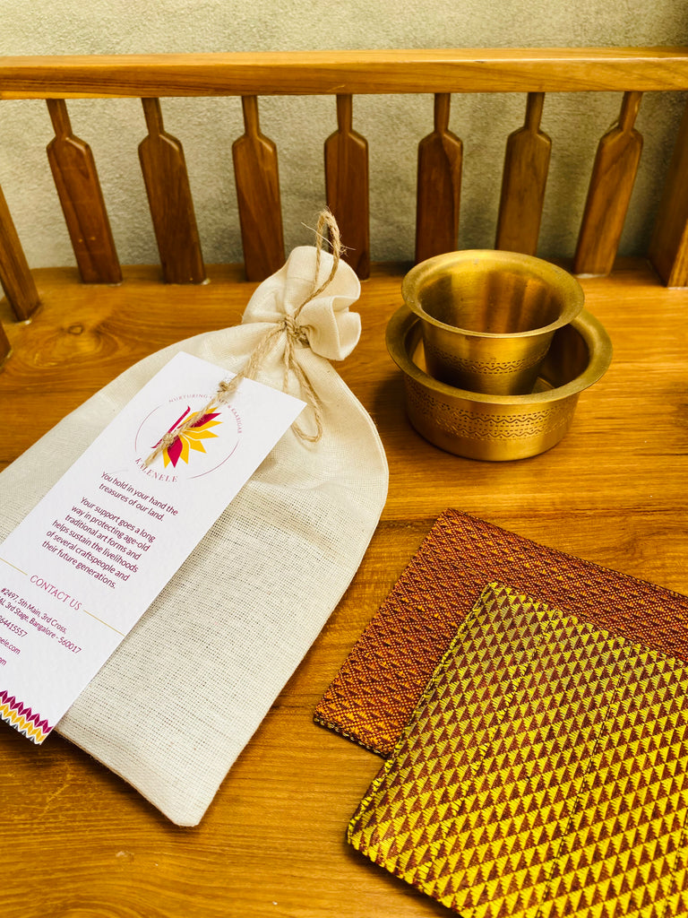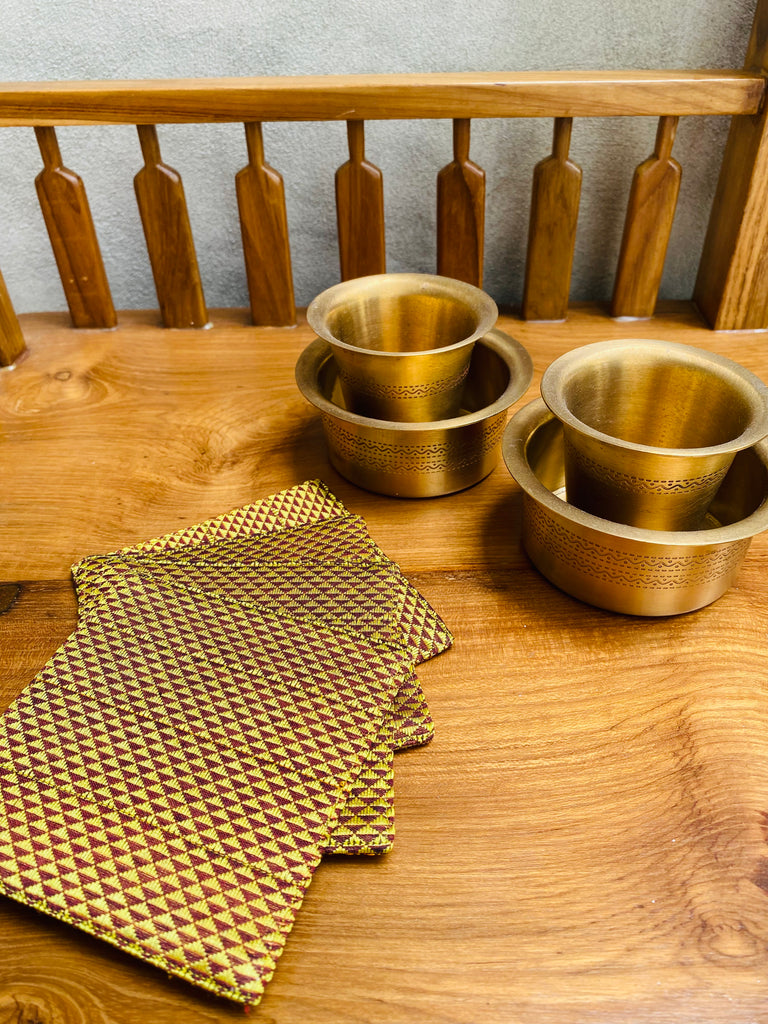 Woven in the timeless Khunn traditional weave, these cotton coasters celebrate the joy of colour and craft. Designed with two contrasting sides, each coaster is fully reversible and finished with a clean topstitch for added strength and beauty. A small but meaningful way to bring artisanal warmth to your coffee table, dining space, or gifting. Lightweight yet durable, they add a touch of colour and modern craft to any setting — everyday essentials with a thoughtful, handmade edge.