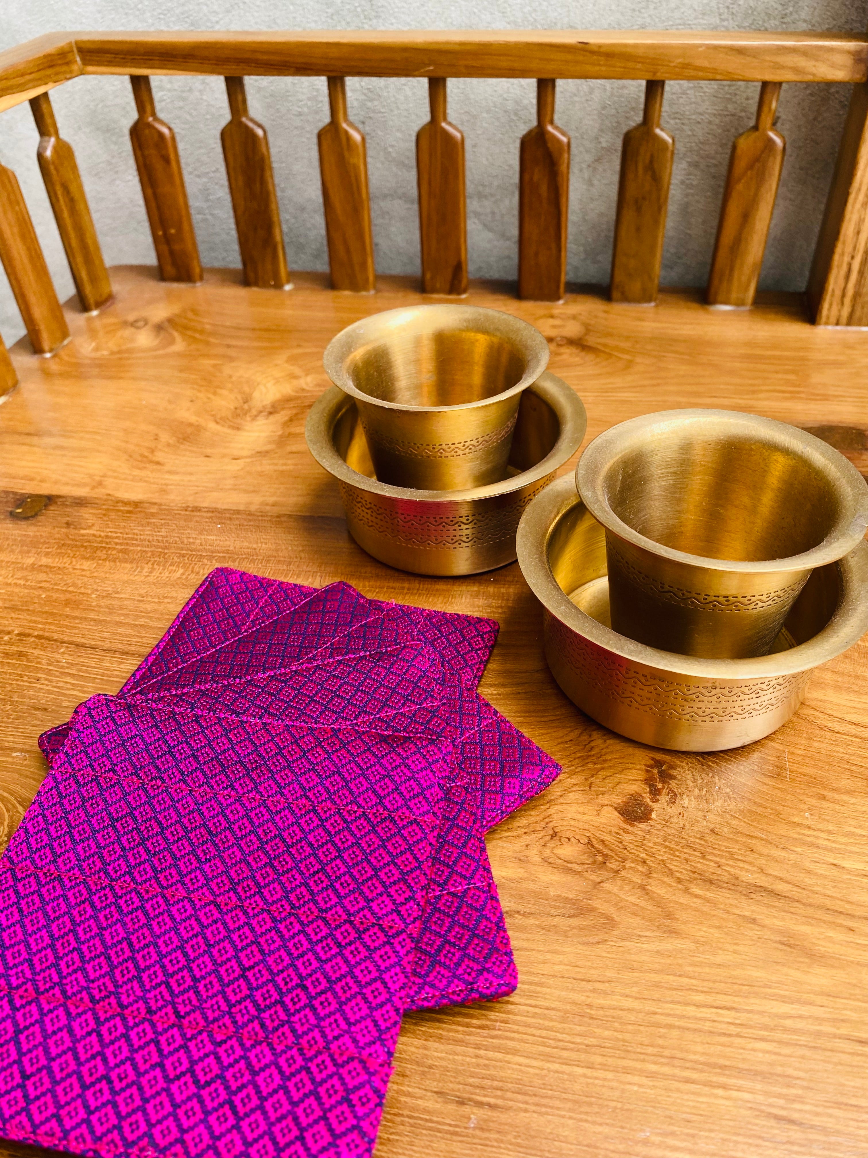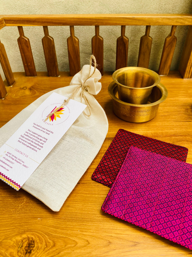Woven in the timeless Khunn traditional weave, these cotton coasters celebrate the joy of colour and craft. Designed with two contrasting sides, each coaster is fully reversible and finished with a clean topstitch for added strength and beauty. A small but meaningful way to bring artisanal warmth to your coffee table, dining space, or gifting. Lightweight yet durable, they add a touch of colour and modern craft to any setting — everyday essentials with a thoughtful, handmade edge.