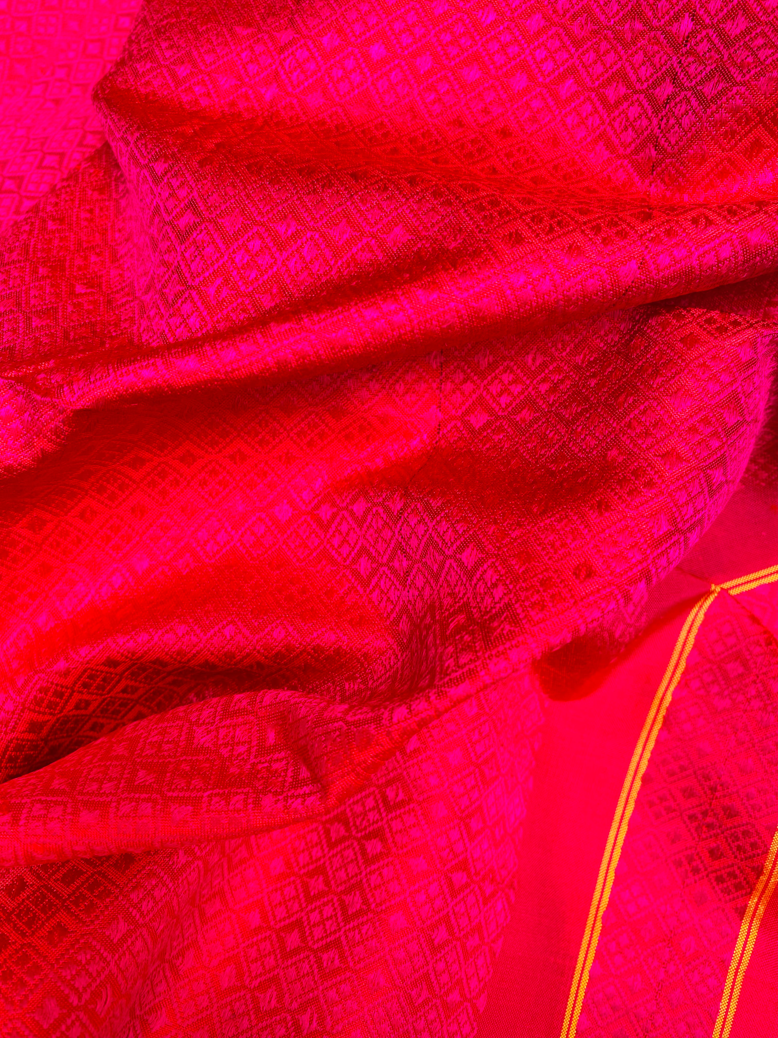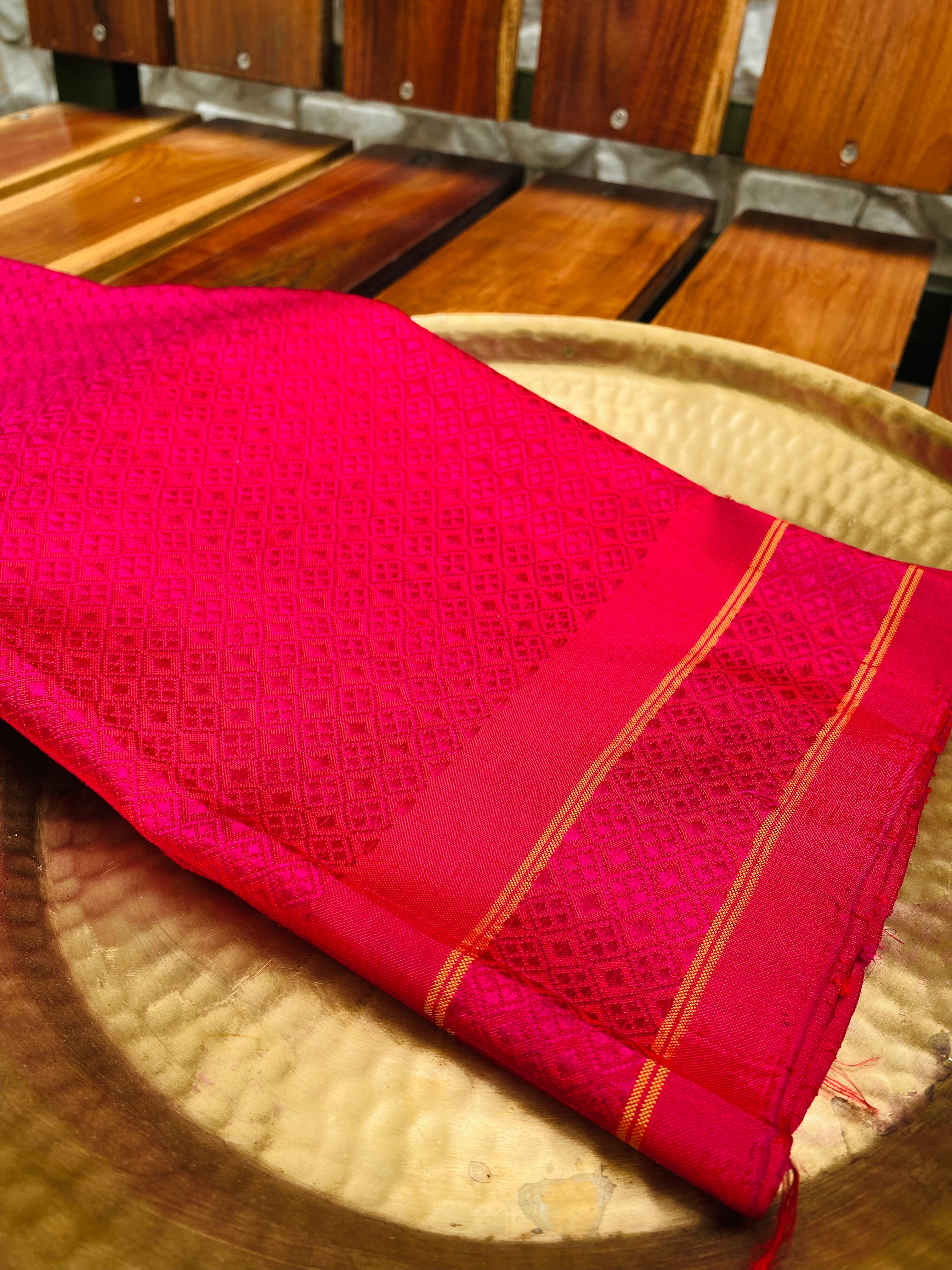 Being 100% pure mulberry silk Khunn fabric, woven on pitloom, these bear beautiful motifs, each one bearing meaning and drawing a parallel to reality, of the Ratha (chariot), Sooji Mallige (Jasmine) and Chrysanthemum, that come alive in bright jewel tones of Khunn fabric. The border is uniform on both sides of the yardage.