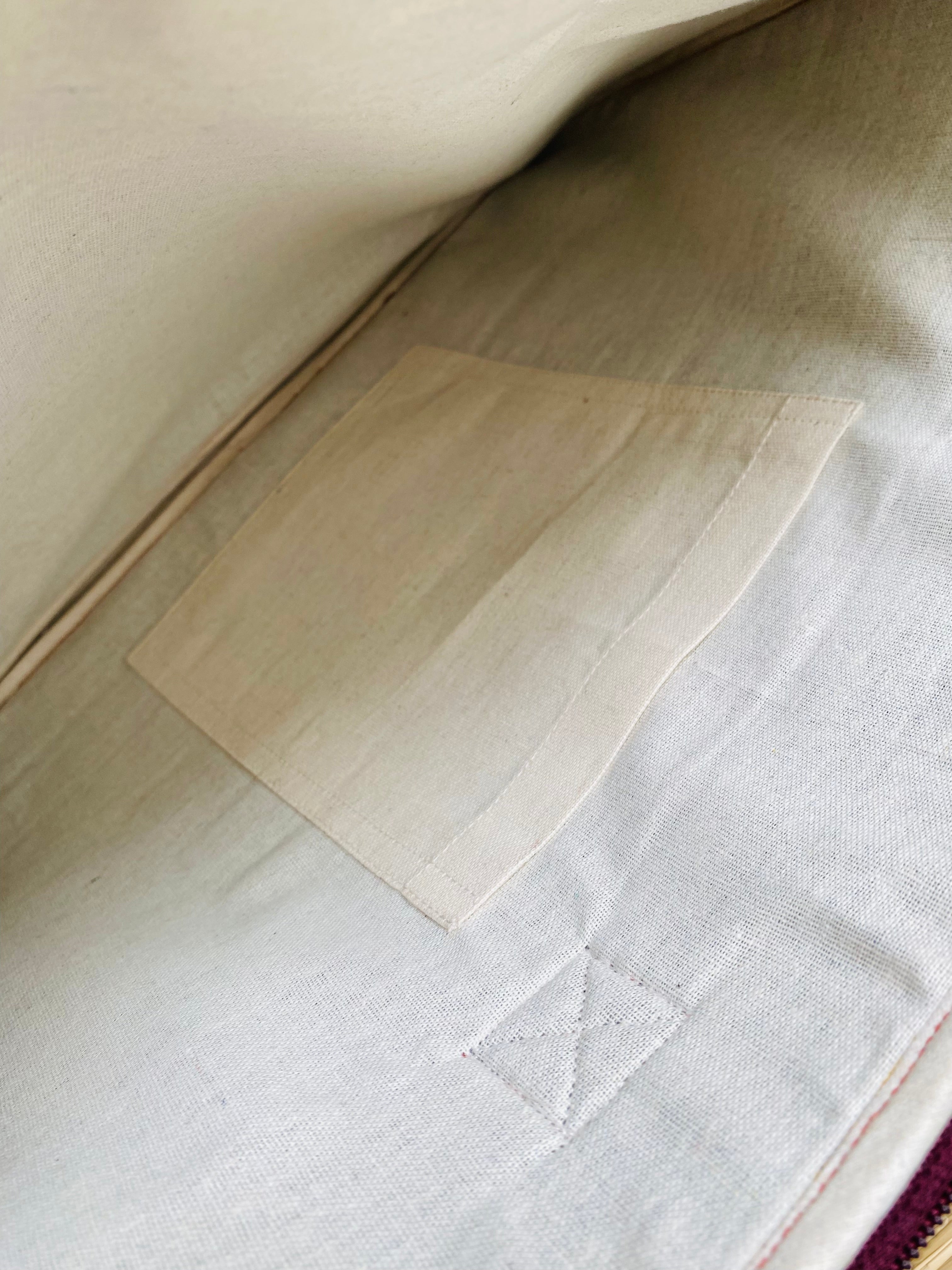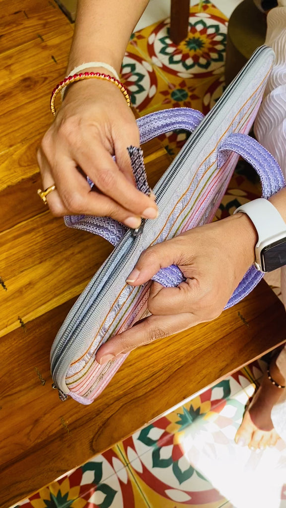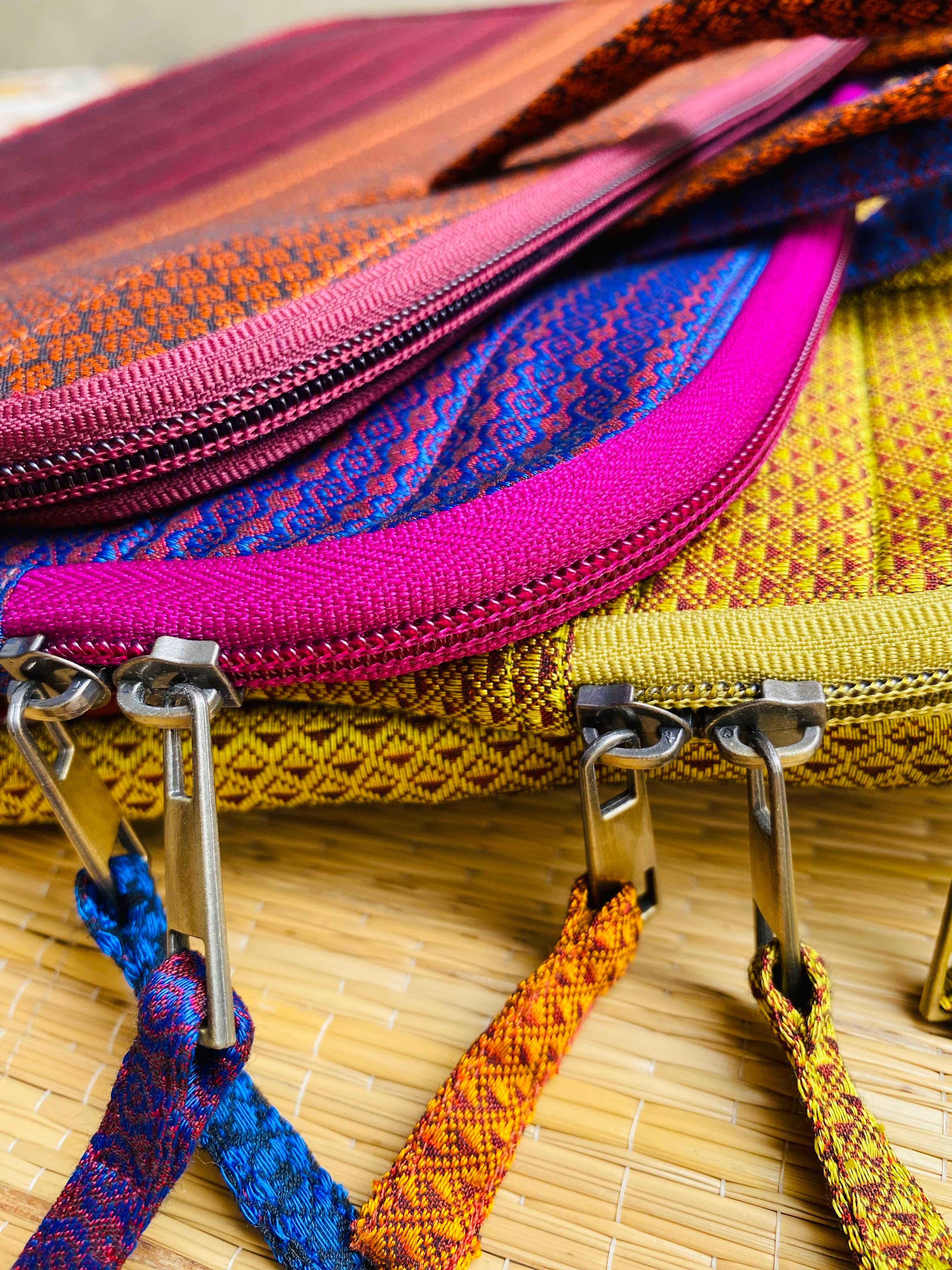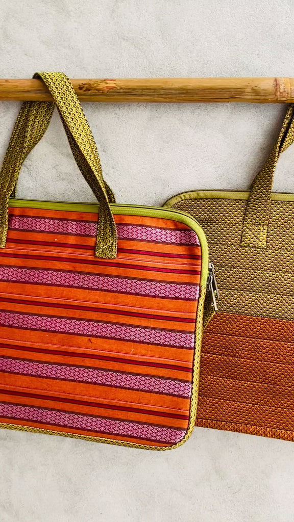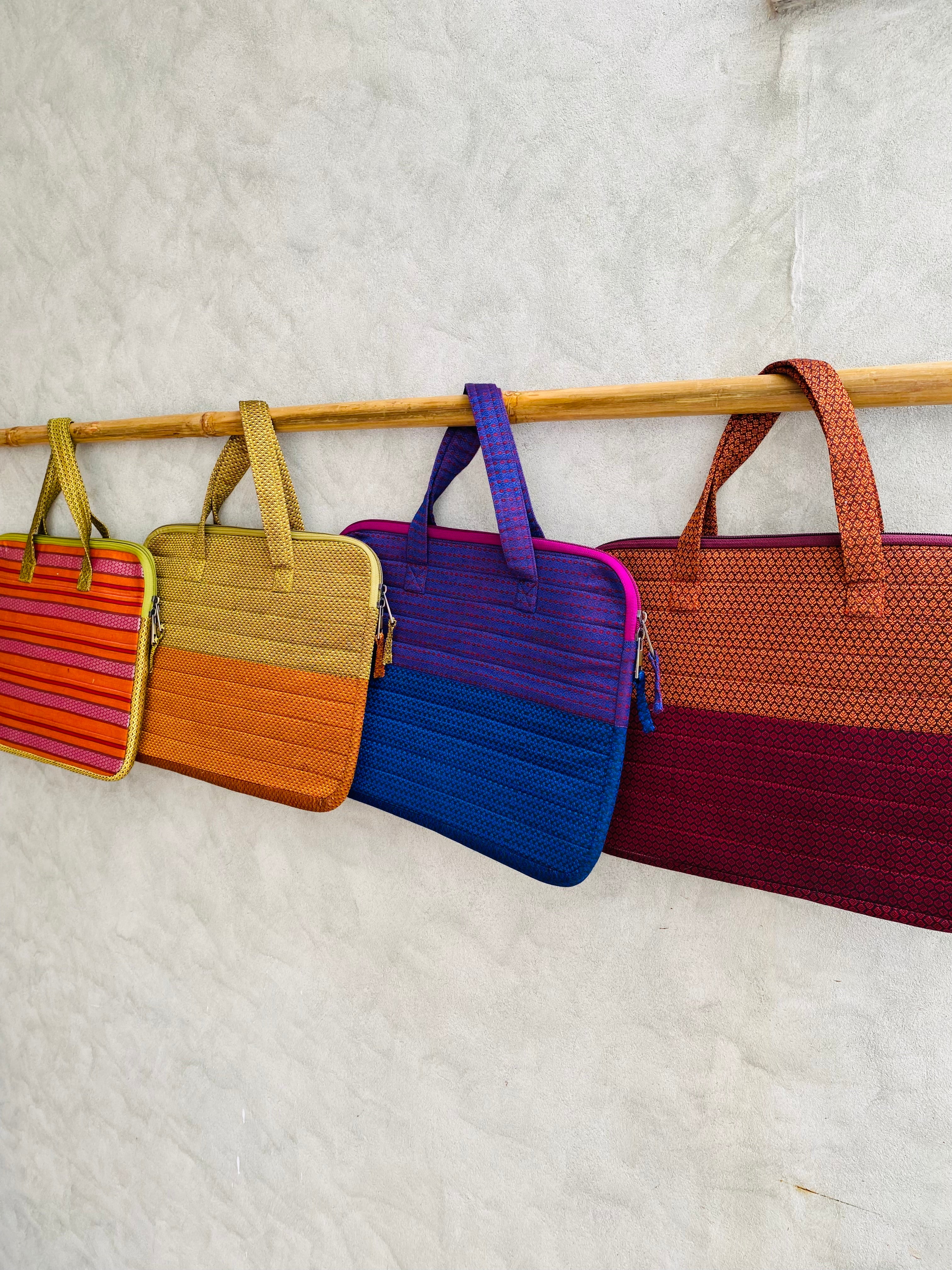 Rooted in the vibrant heritage of Khunn weaving, this laptop sleeve brings together striking contrast shades to create a bold yet refined design. The textured fabric gives it character, while the clean construction ensures durability and comfort. Spacious, functional and beautifully crafted—your ideal companion for work days or travel to carry along your laptop, phone, chargers, a notebook with all your other little must-haves.