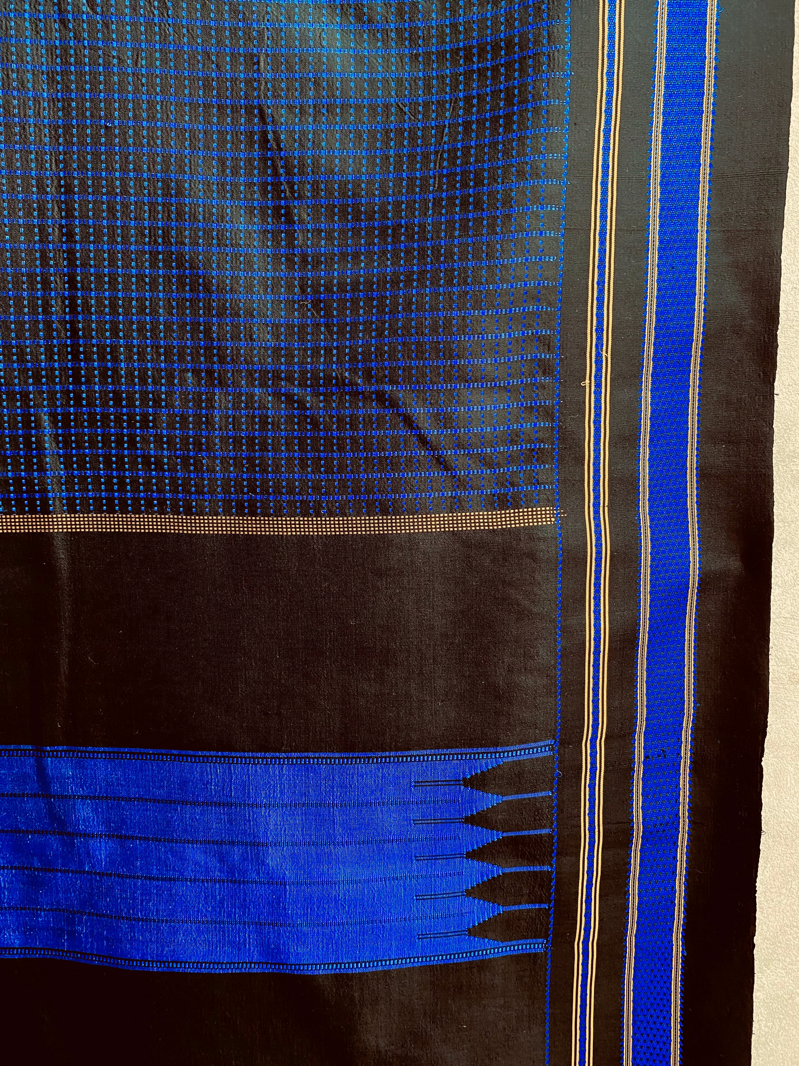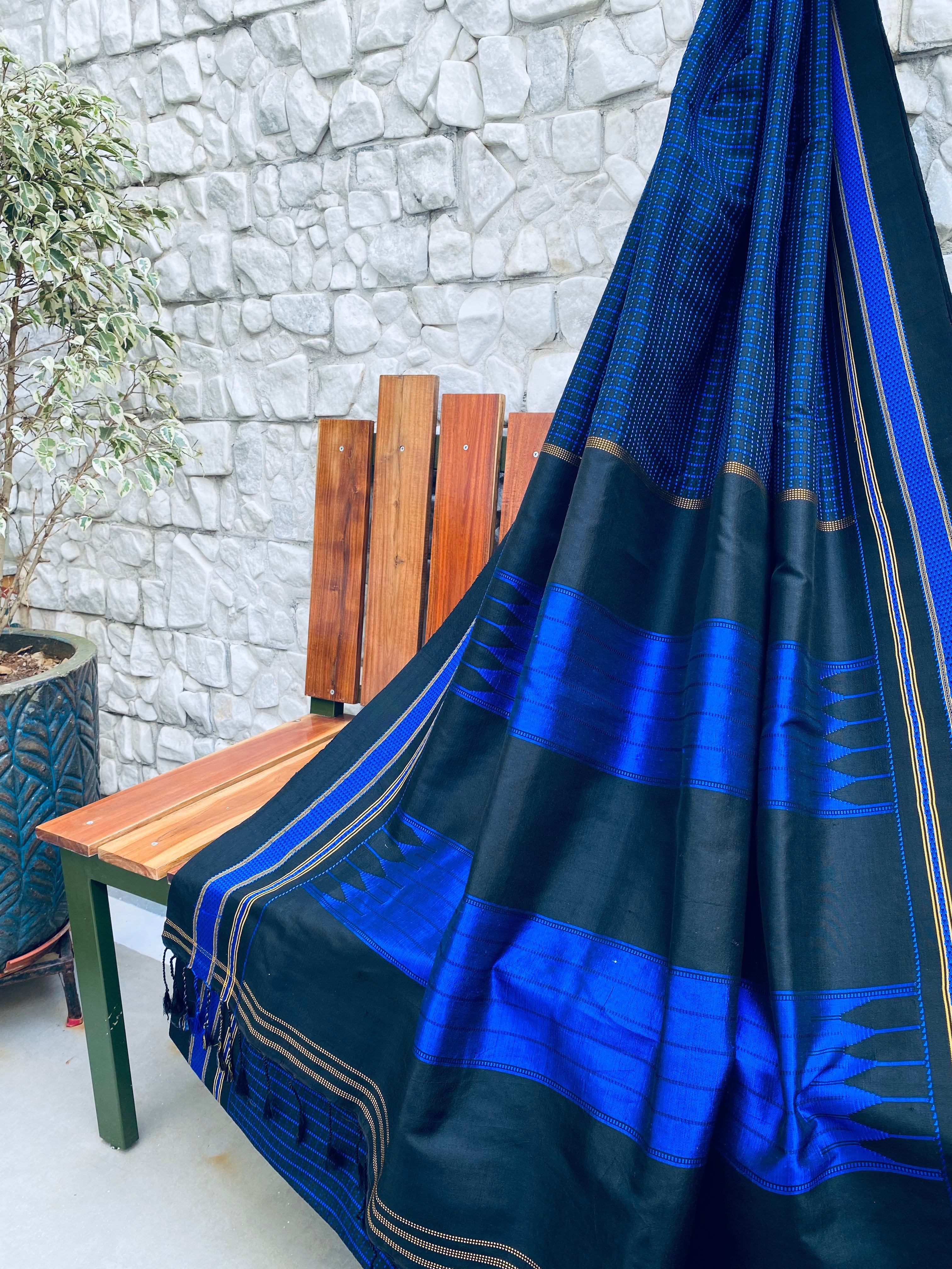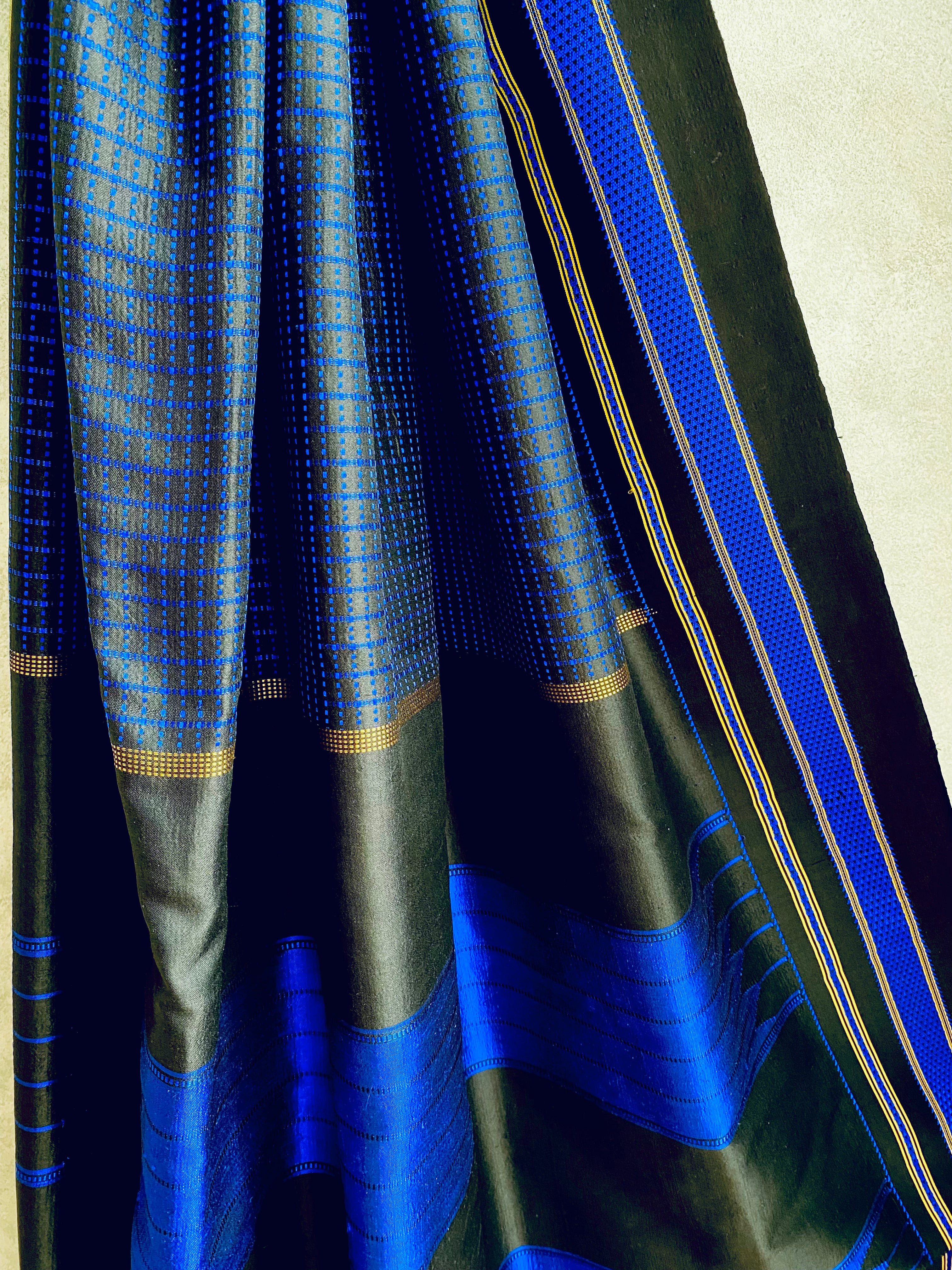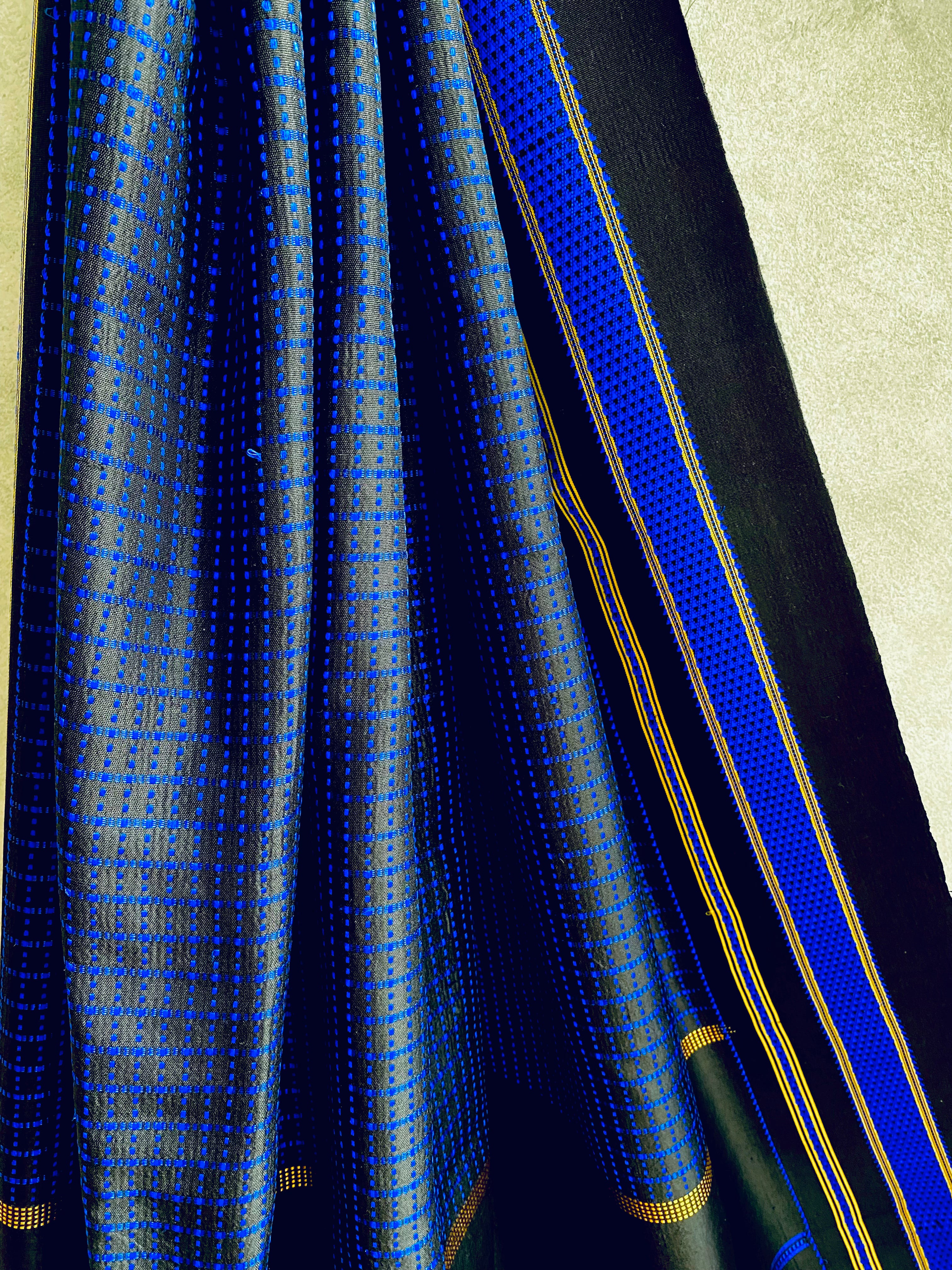 “Chathuranga”, in Sanskrit, roughly translates to “four limbs”, which refers to the ancient army divisions of infantry, cavalry, elephantry, and chariotry in a game known to be the ancestor of chess. The Chaduranga Chikki saree is considered to be the pinnacle of Ilkal weaving. The design is said to have been inspired by the game of dice played between the Pandavas and Kauravas in the great Indian epic of Mahabharata. Today, there are but a few weavers who can create an authentic Chaduranga Chikki. The hard work put in by the skilled weaver over two weeks per saree is clearly seen in the exquisiteness of each of them.