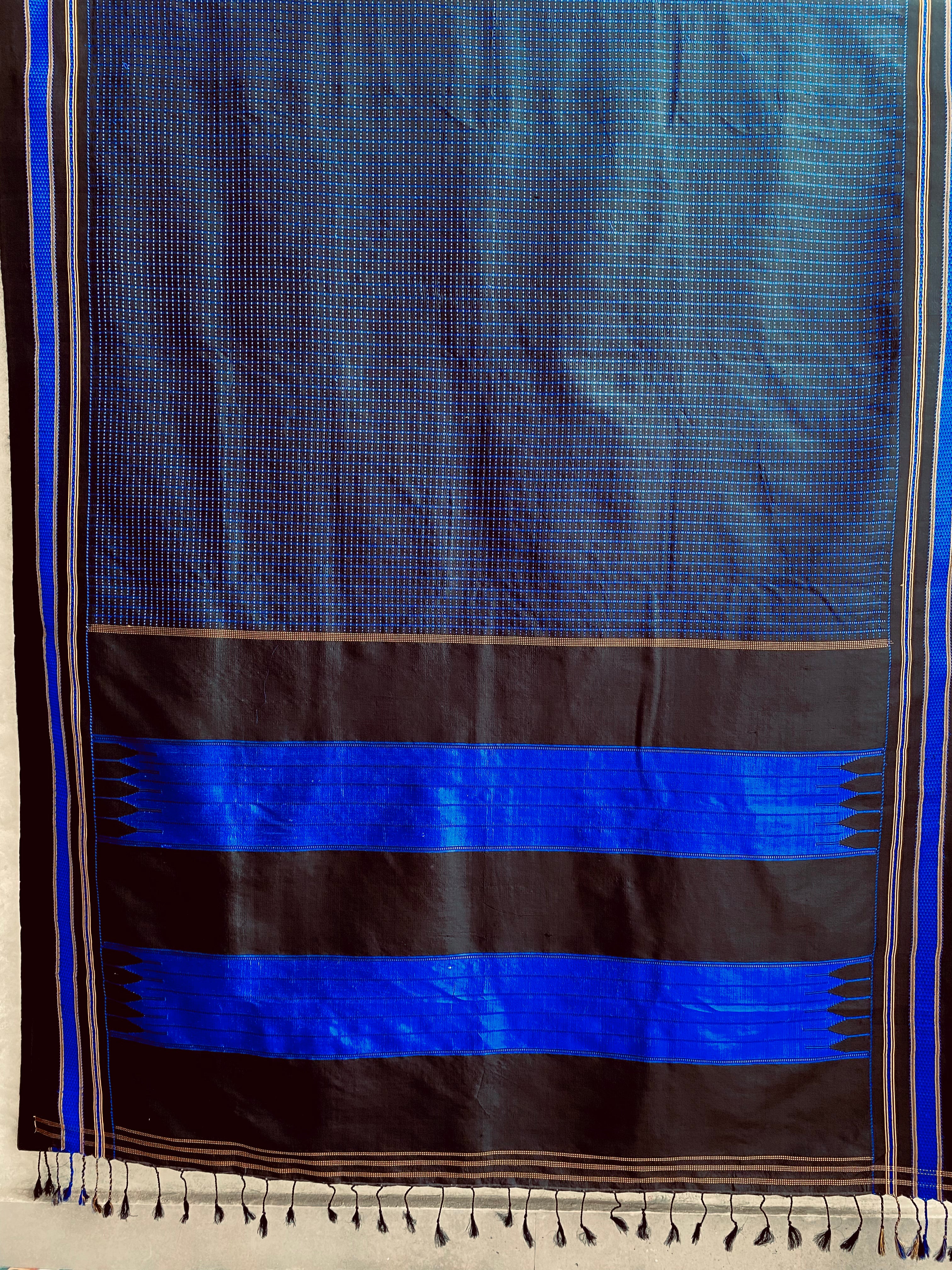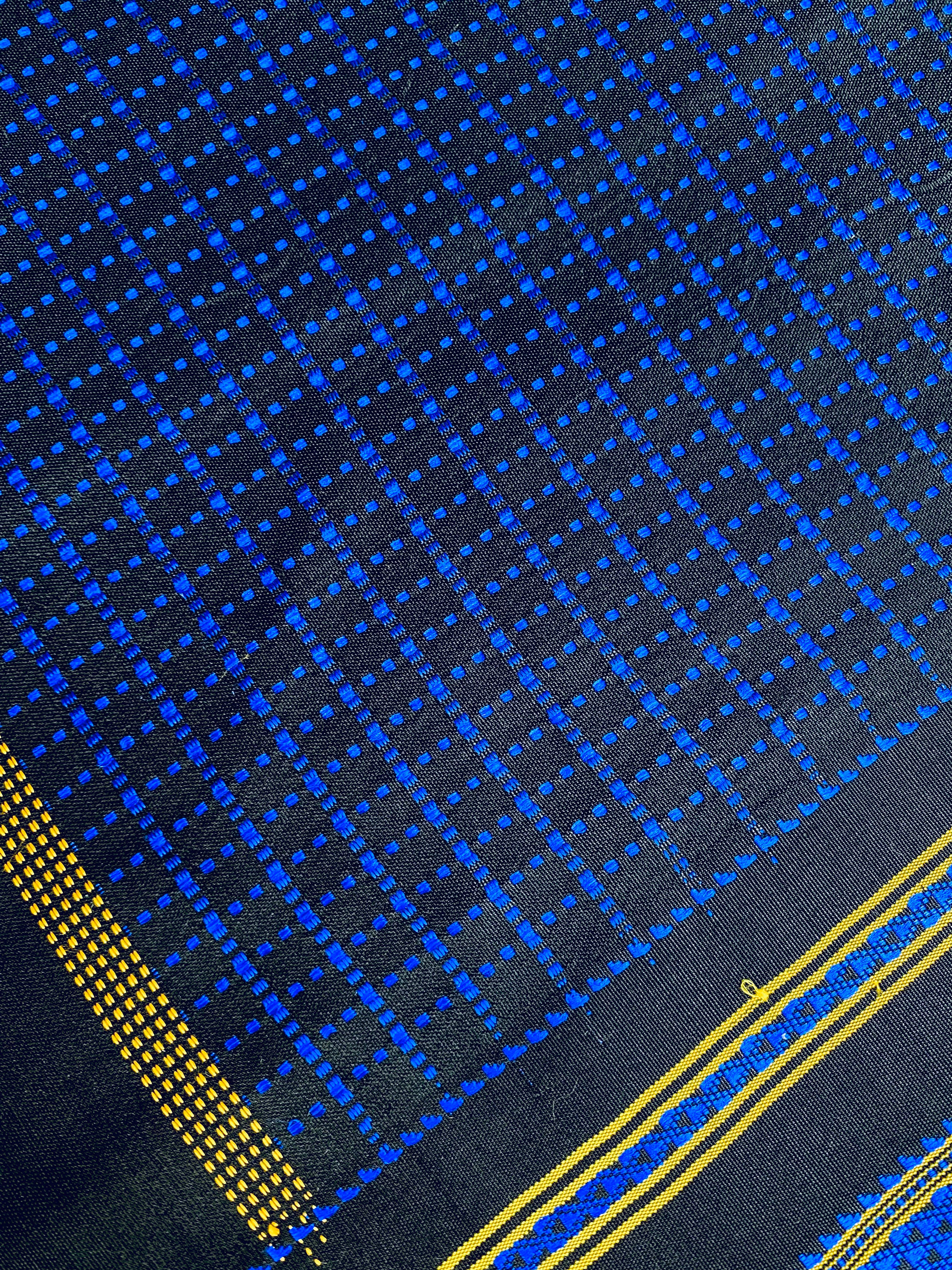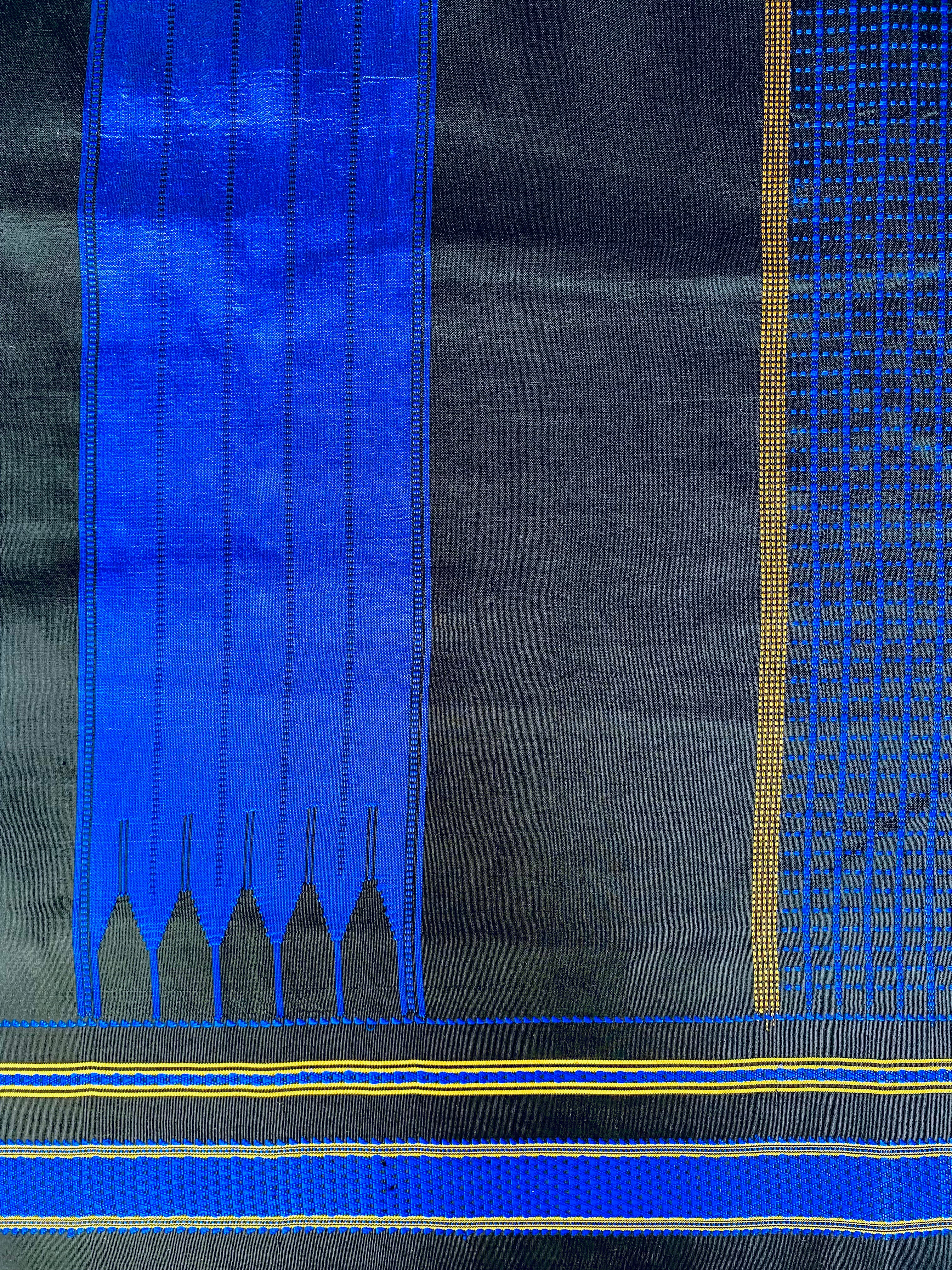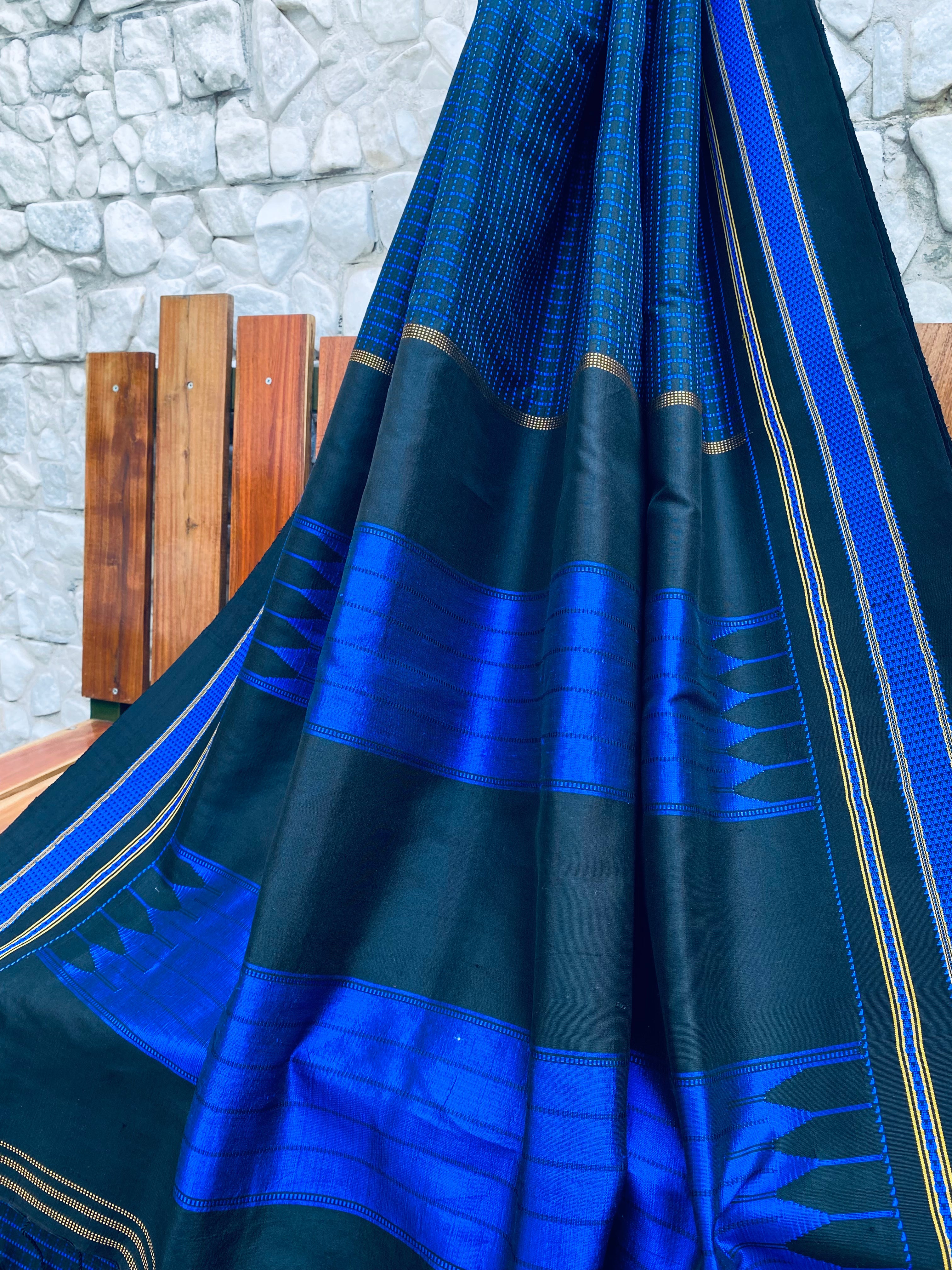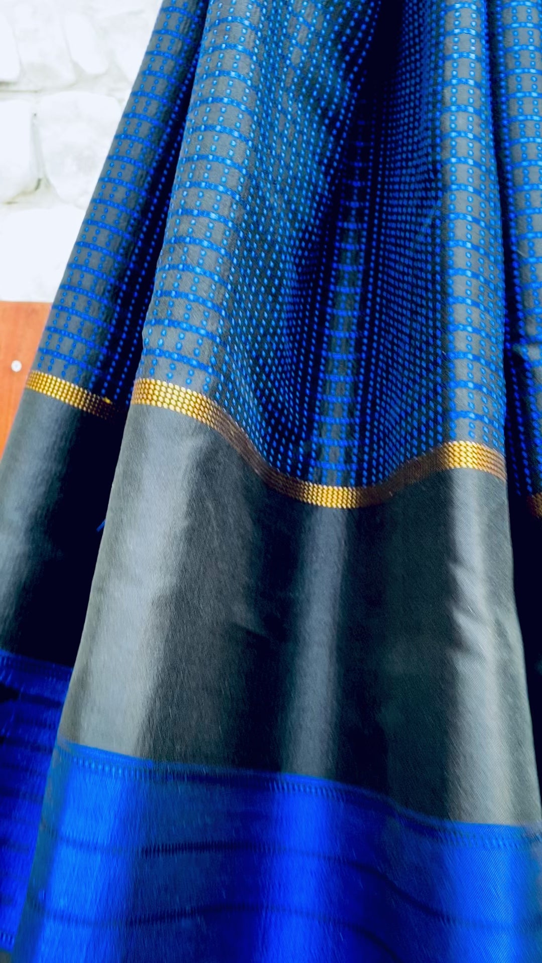 “Chathuranga”, in Sanskrit, roughly translates to “four limbs”, which refers to the ancient army divisions of infantry, cavalry, elephantry, and chariotry in a game known to be the ancestor of chess. The Chaduranga Chikki saree is considered to be the pinnacle of Ilkal weaving. The design is said to have been inspired by the game of dice played between the Pandavas and Kauravas in the great Indian epic of Mahabharata. Today, there are but a few weavers who can create an authentic Chaduranga Chikki. The hard work put in by the skilled weaver over two weeks per saree is clearly seen in the exquisiteness of each of them.
