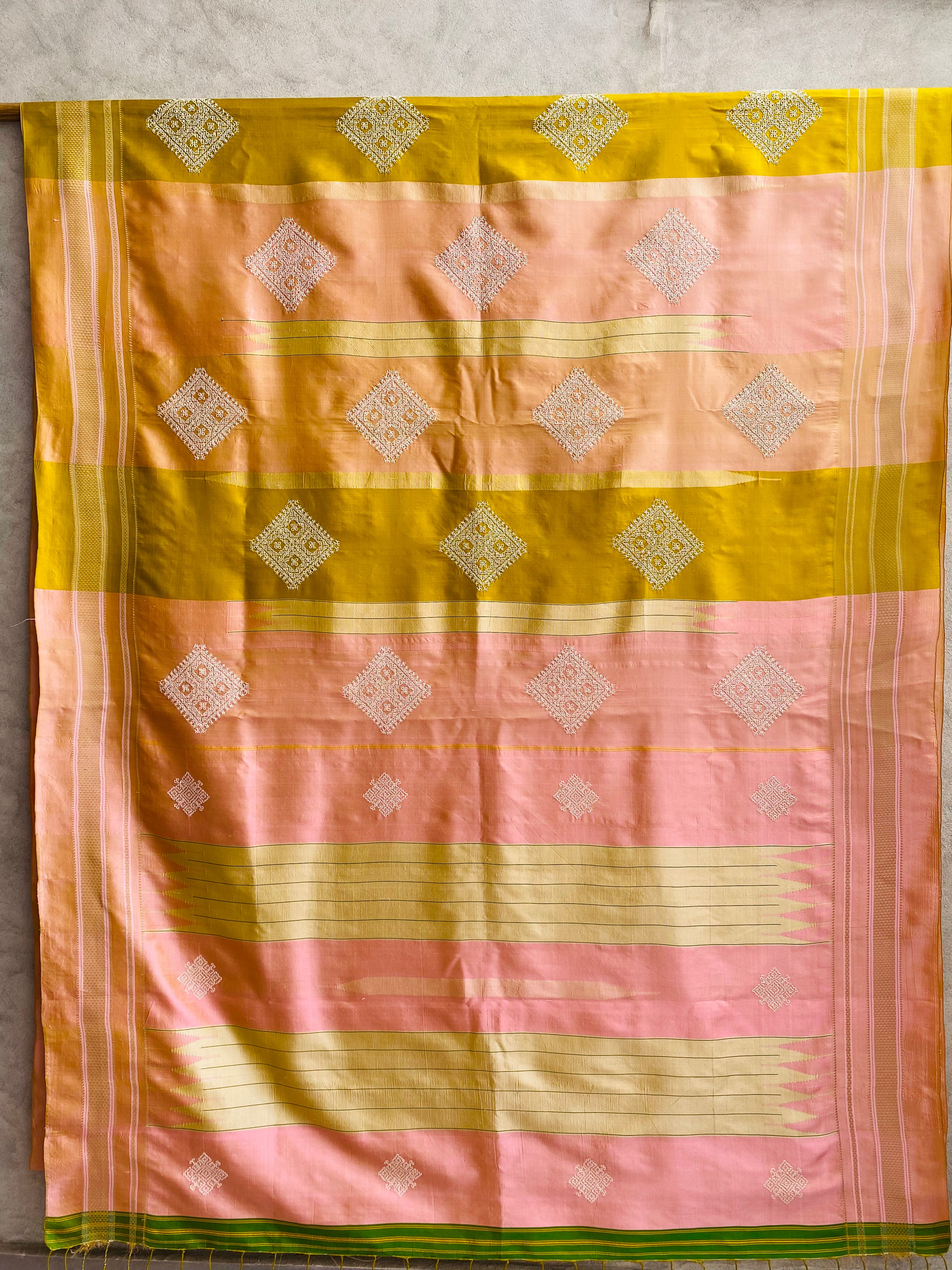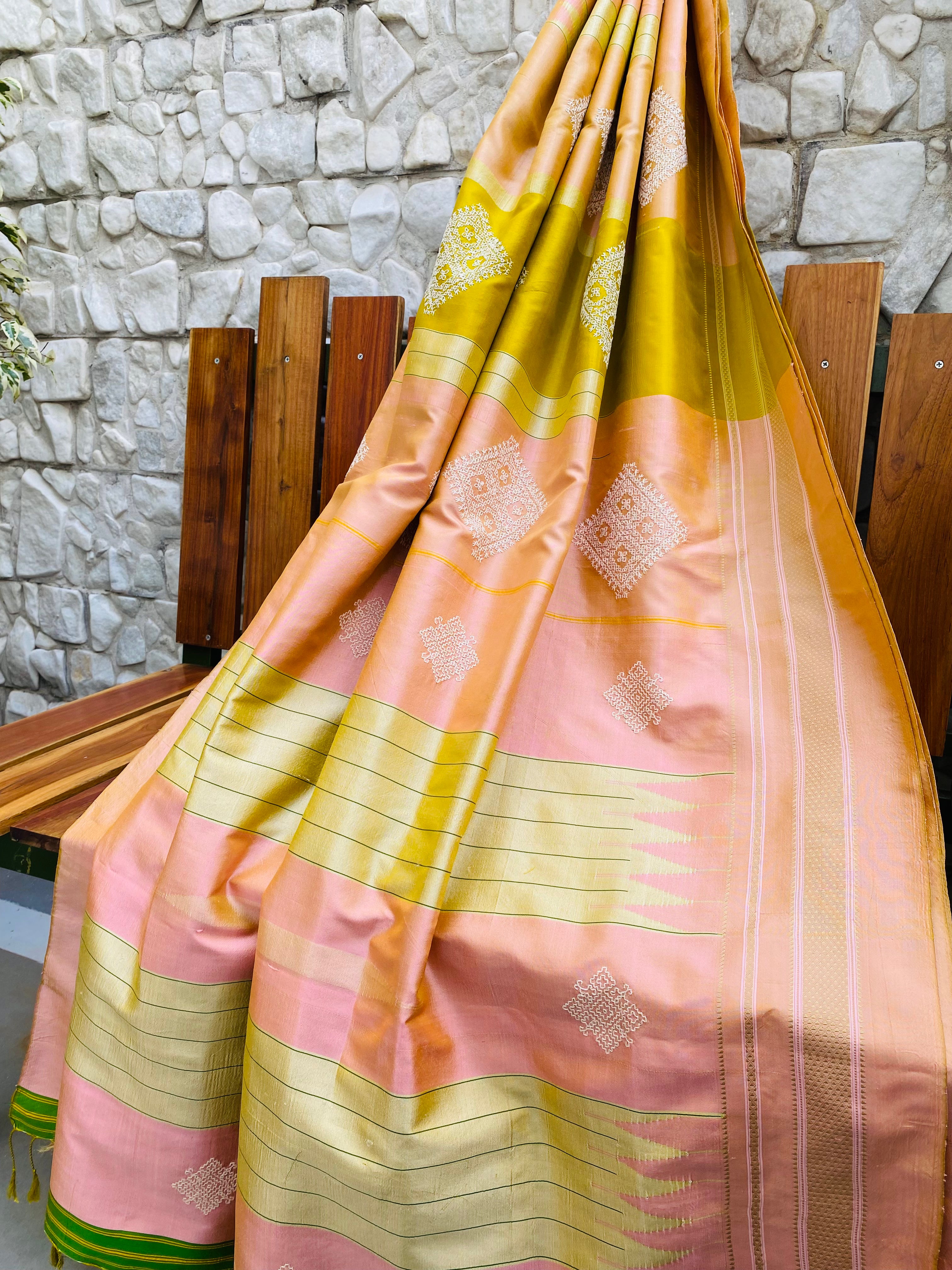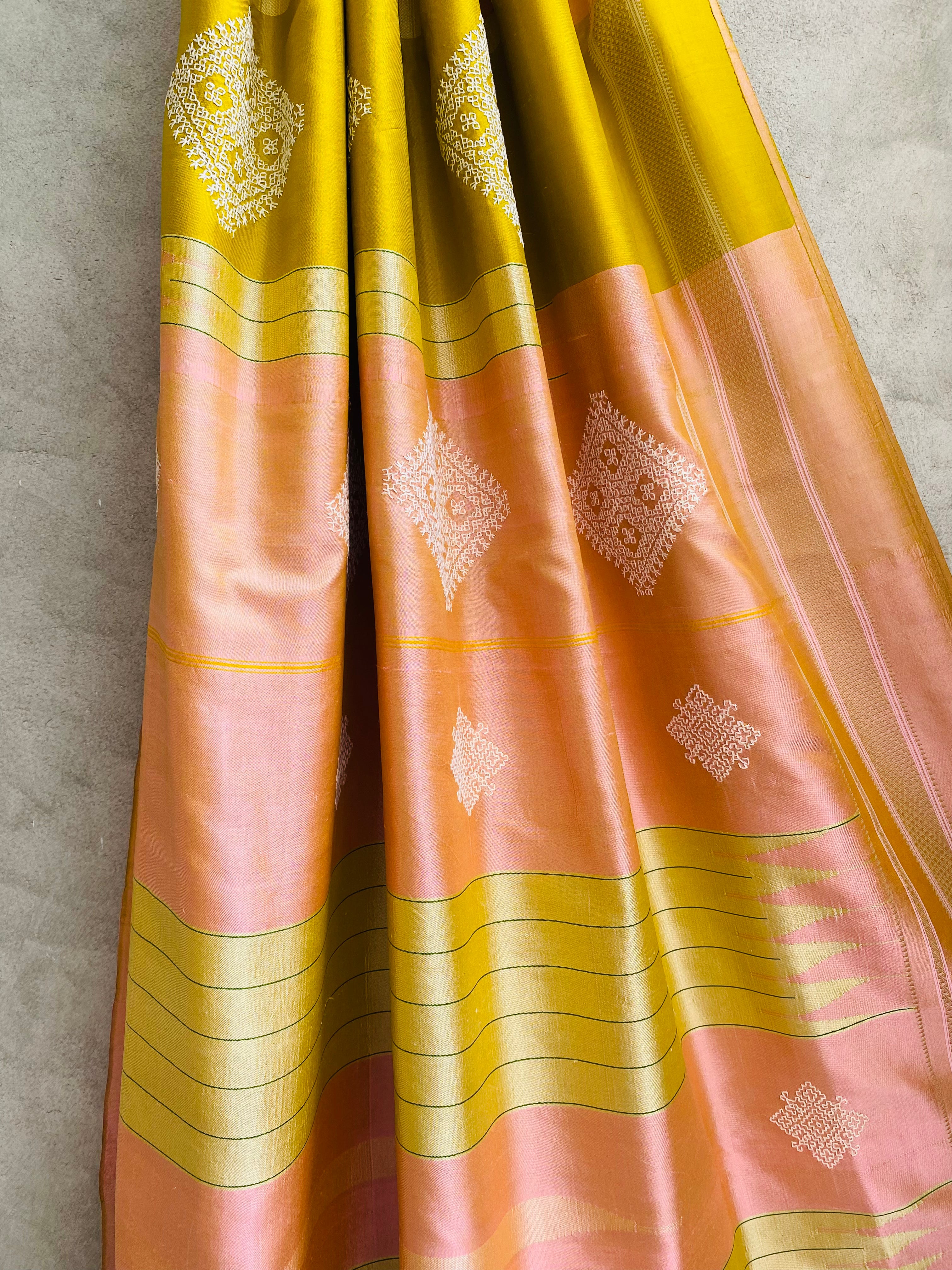 Imagine the Jugalbandi between the weaver and the designer, both on equal footing, a slow build-up and the tempo rising, reaching a crescendo to finally create this gem. The designer's vision, passion to reassure the traditional weaves, techniques and reimagining them in a new look and the weaver's ability to execute with skill and finesse and bring to life the imaginations, bringing to you an exceptionally amazing drape in the form of the lightweight Ilkal saree!