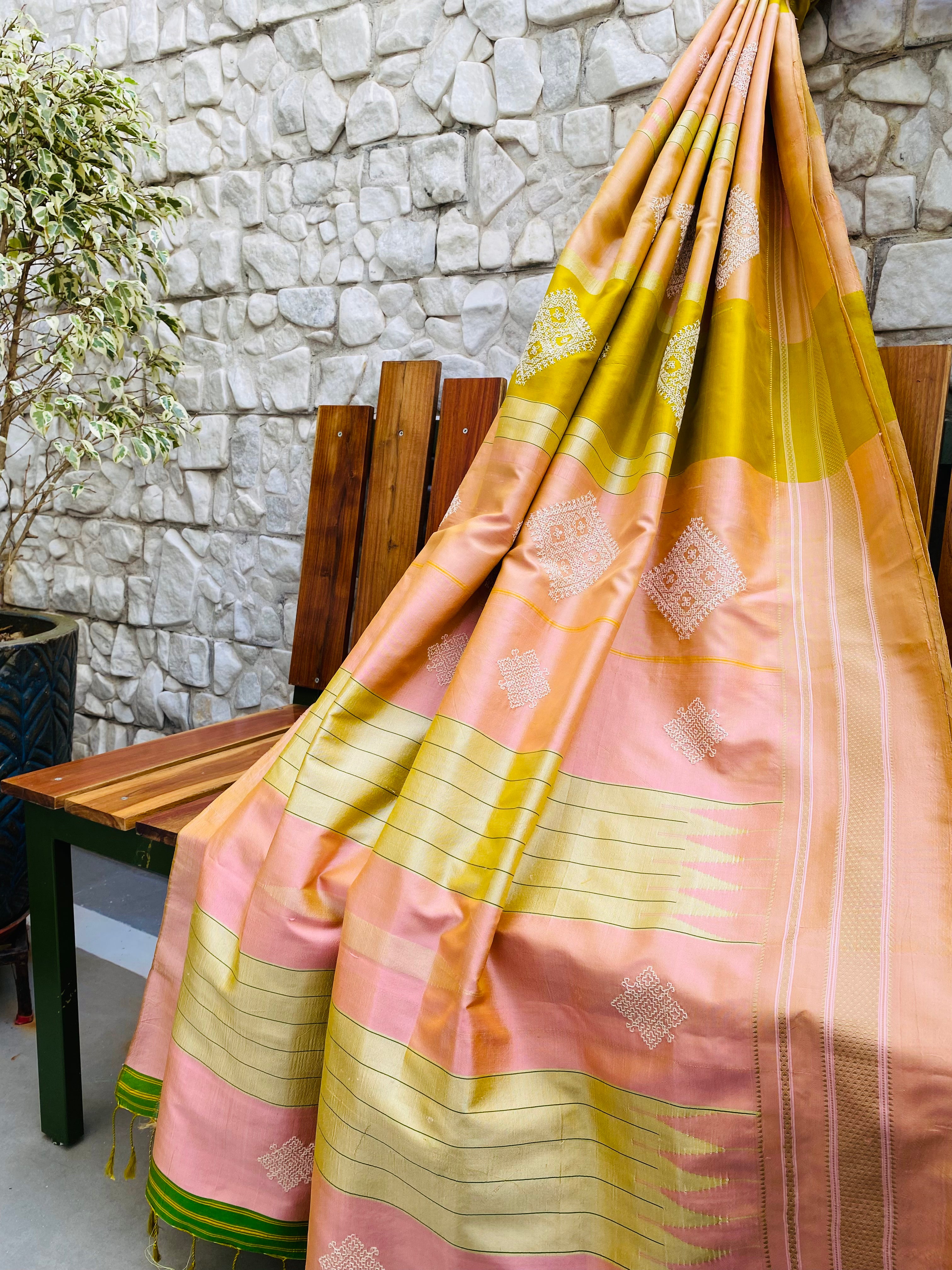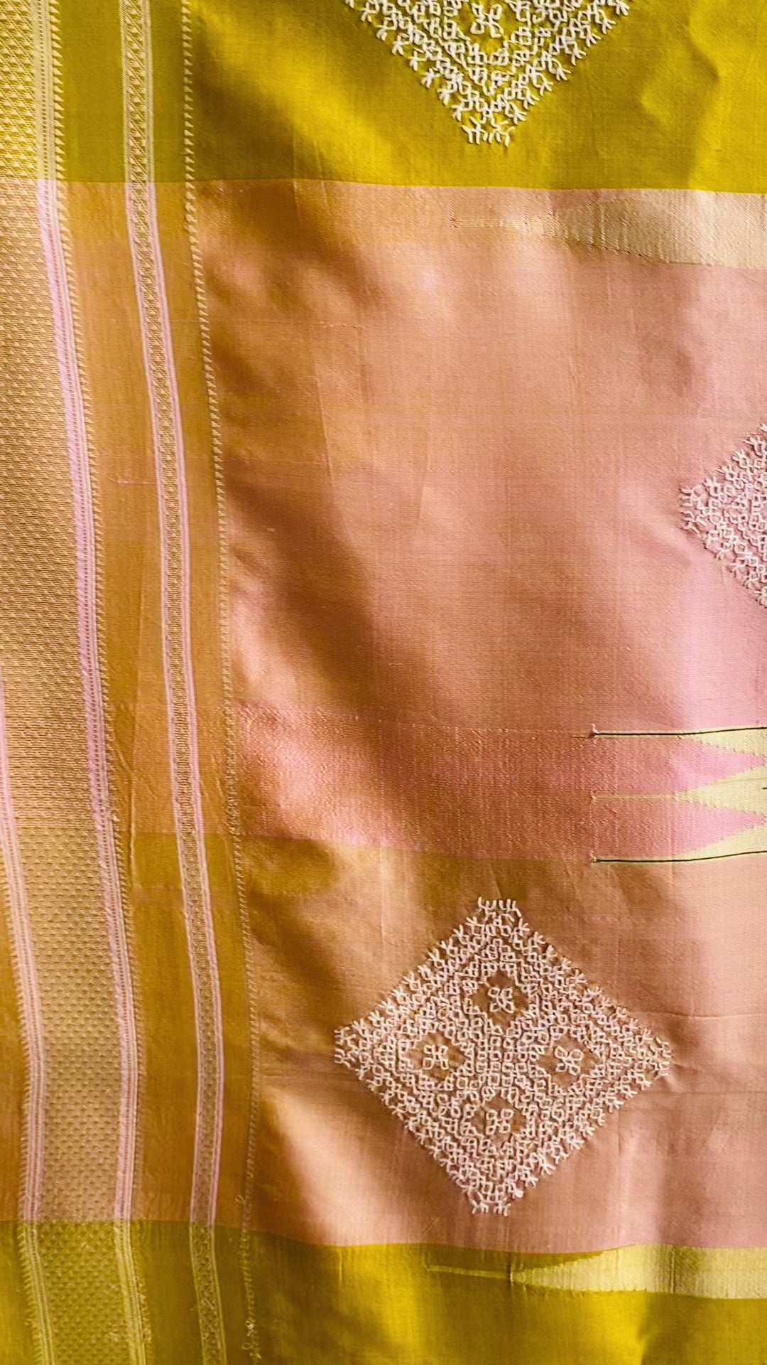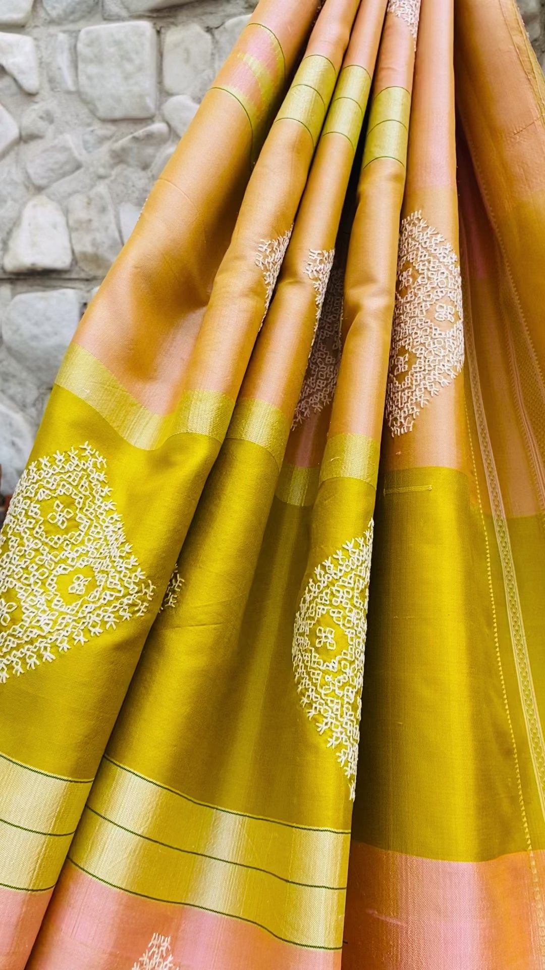 So easy to wear and so light, this unique piece is woven on handloom (pitloom) and made of 100% mulberry silk, this saree sports a Gadi-Dadi border and quintessential tope teni pallu. To make this all the more brilliant, you will find stunningly done Kasuti hand embroidery through the body of the saree. KaleNele works hand in hand with a NGO based on Dharward to train women from distressed backgrounds on Kasuti and provide them an opportunity to a sustainable livelihood to build their lives onwards and upwards. This comes with a coordinated pure mulberry silk Ilkal blouse fabric of 1 meter.