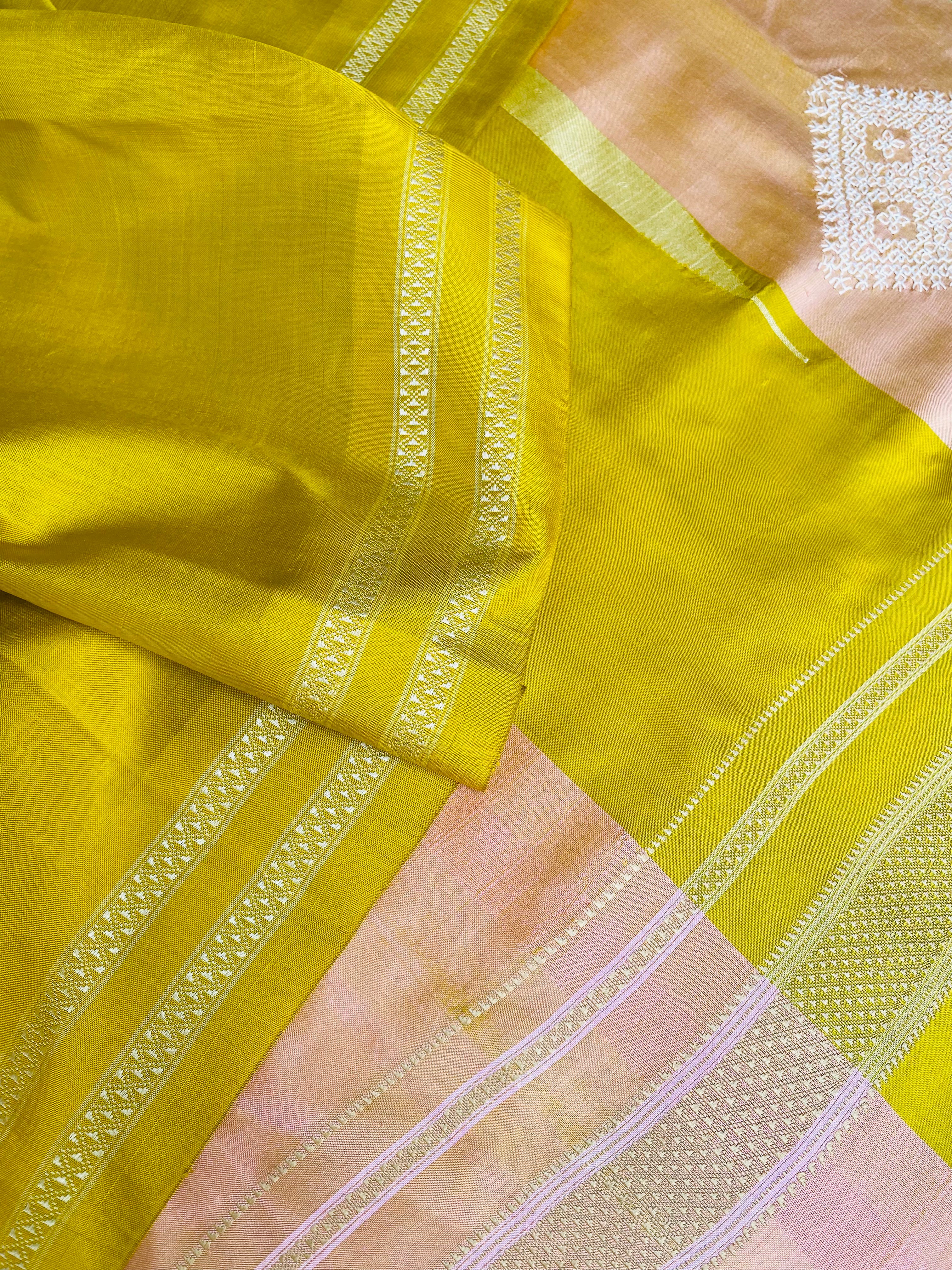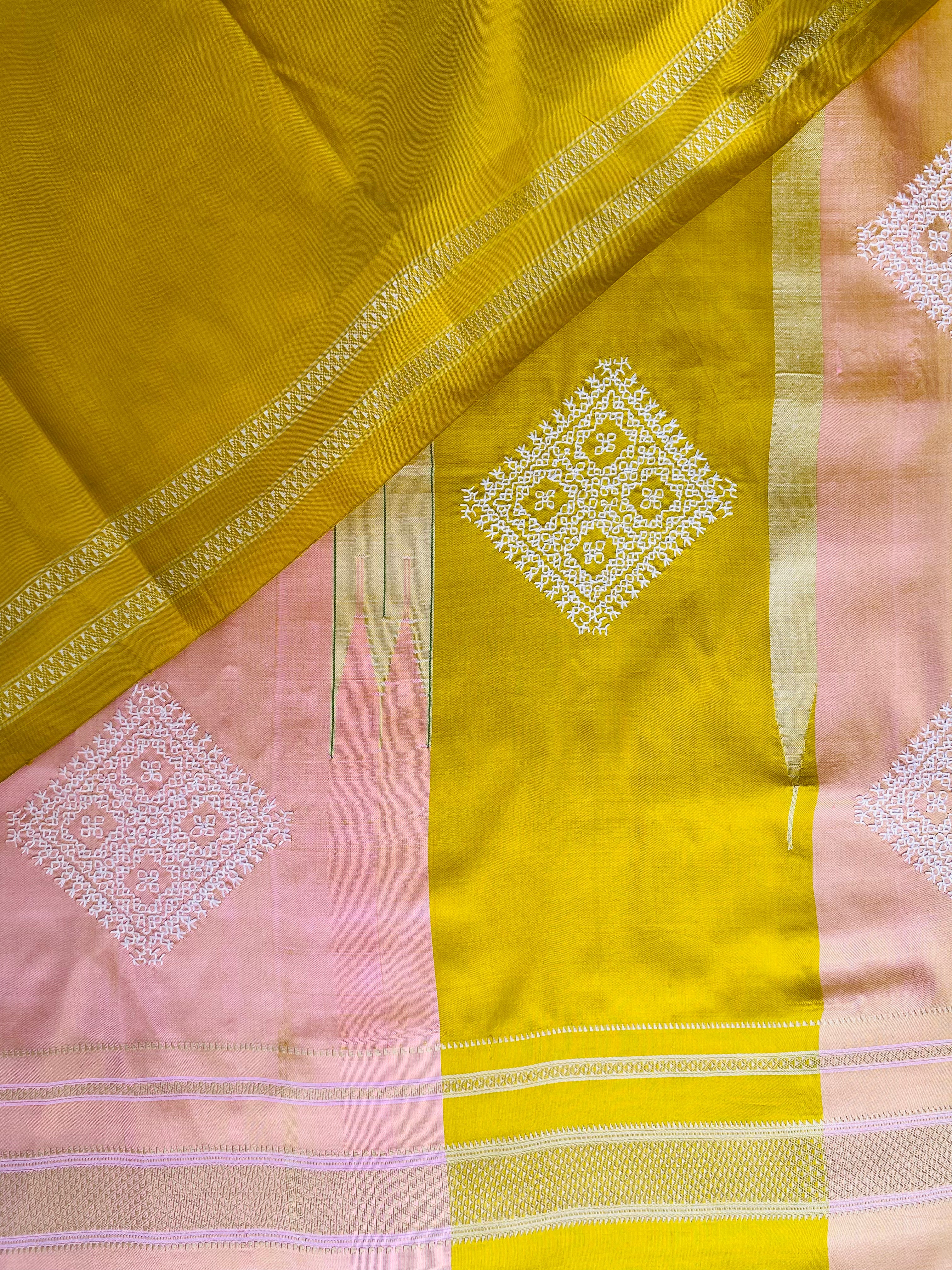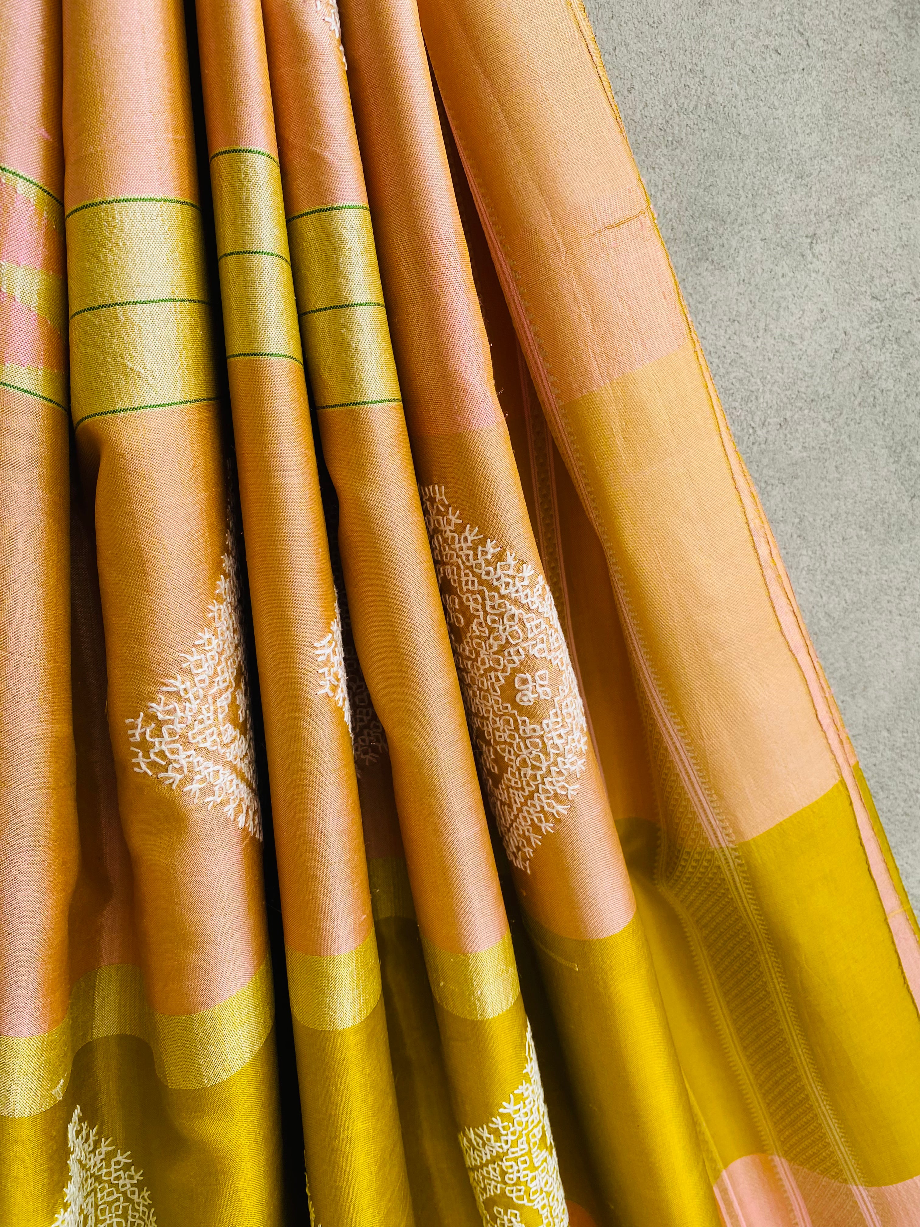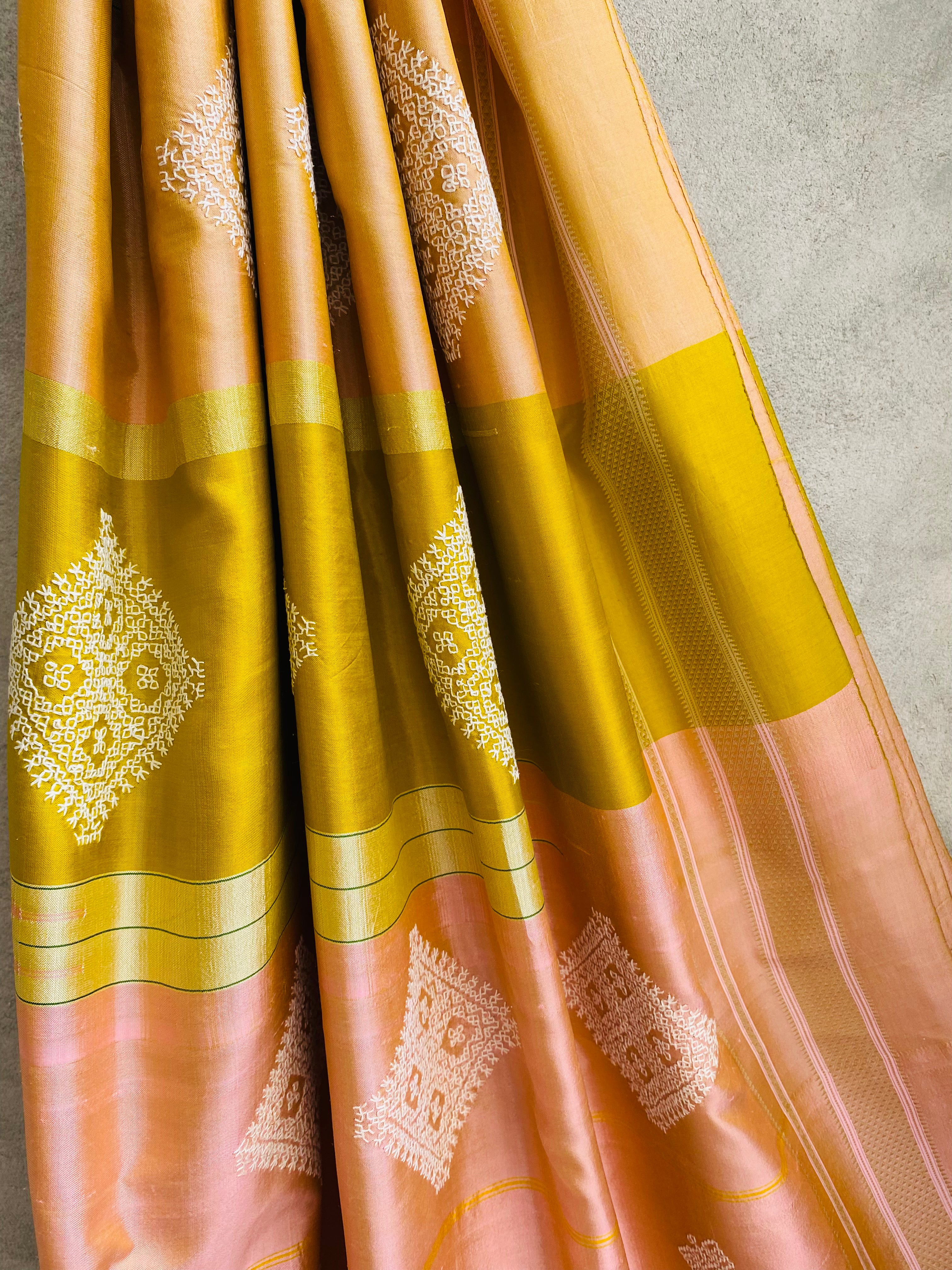 So easy to wear and so light, this unique piece is woven on handloom (pitloom) and made of 100% mulberry silk, this saree sports a Gadi-Dadi border and quintessential tope teni pallu. To make this all the more brilliant, you will find stunningly done Kasuti hand embroidery through the body of the saree. KaleNele works hand in hand with a NGO based on Dharward to train women from distressed backgrounds on Kasuti and provide them an opportunity to a sustainable livelihood to build their lives onwards and upwards. This comes with a coordinated pure mulberry silk Ilkal blouse fabric of 1 meter.