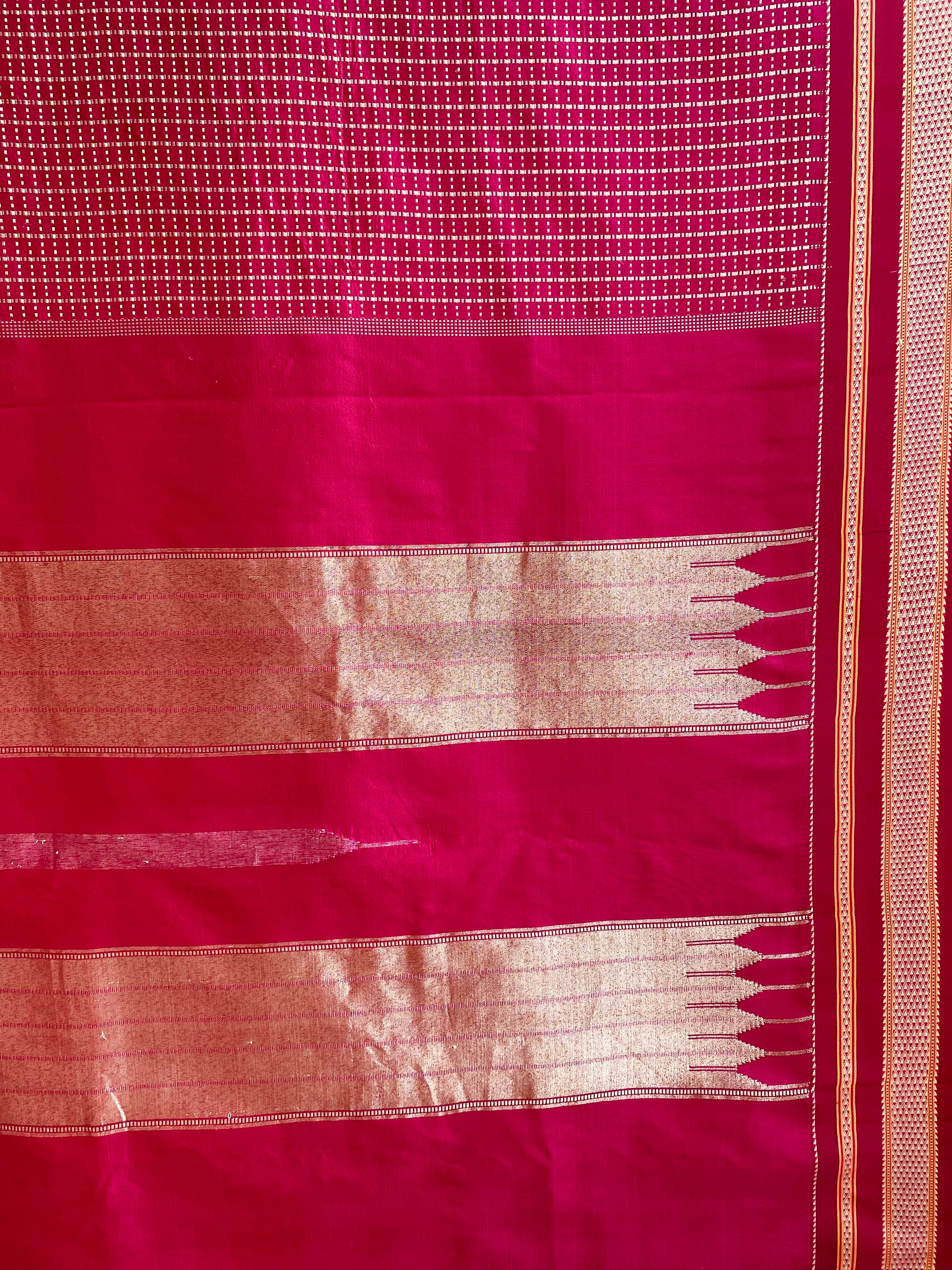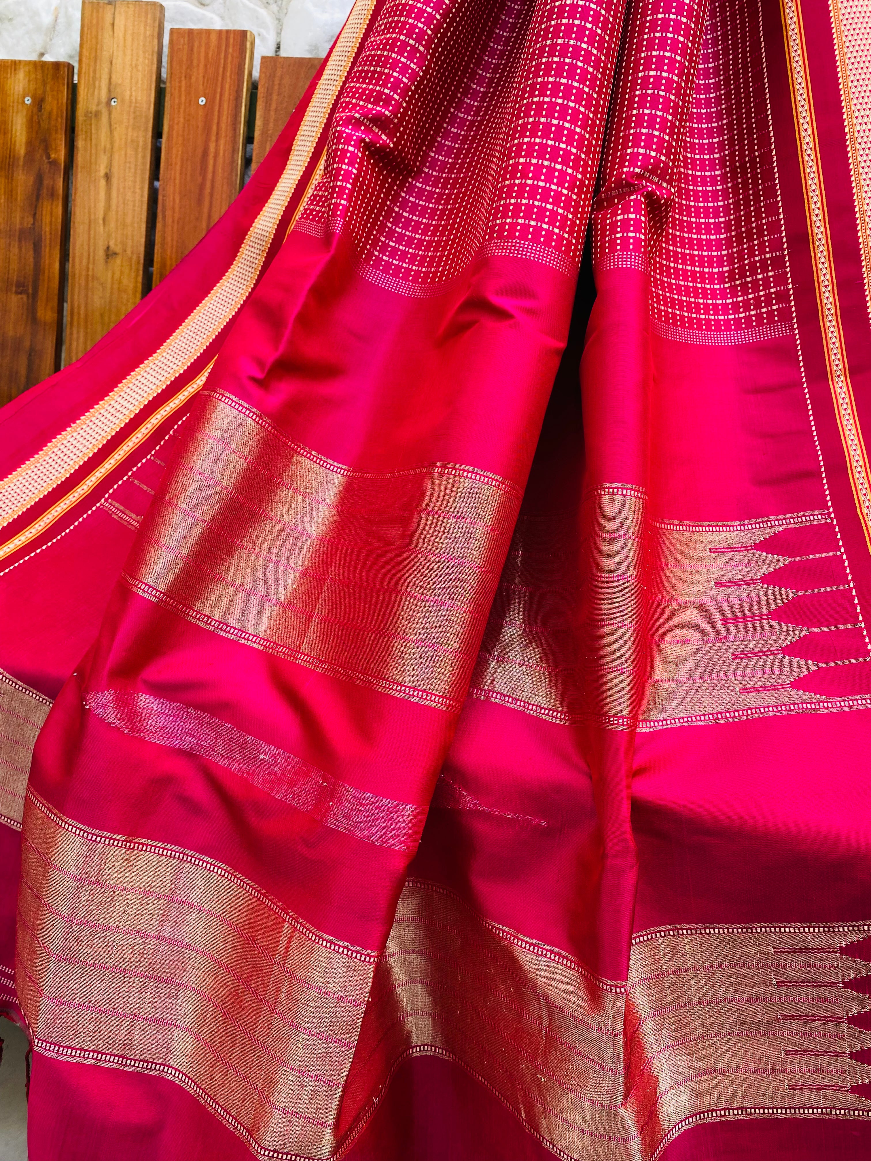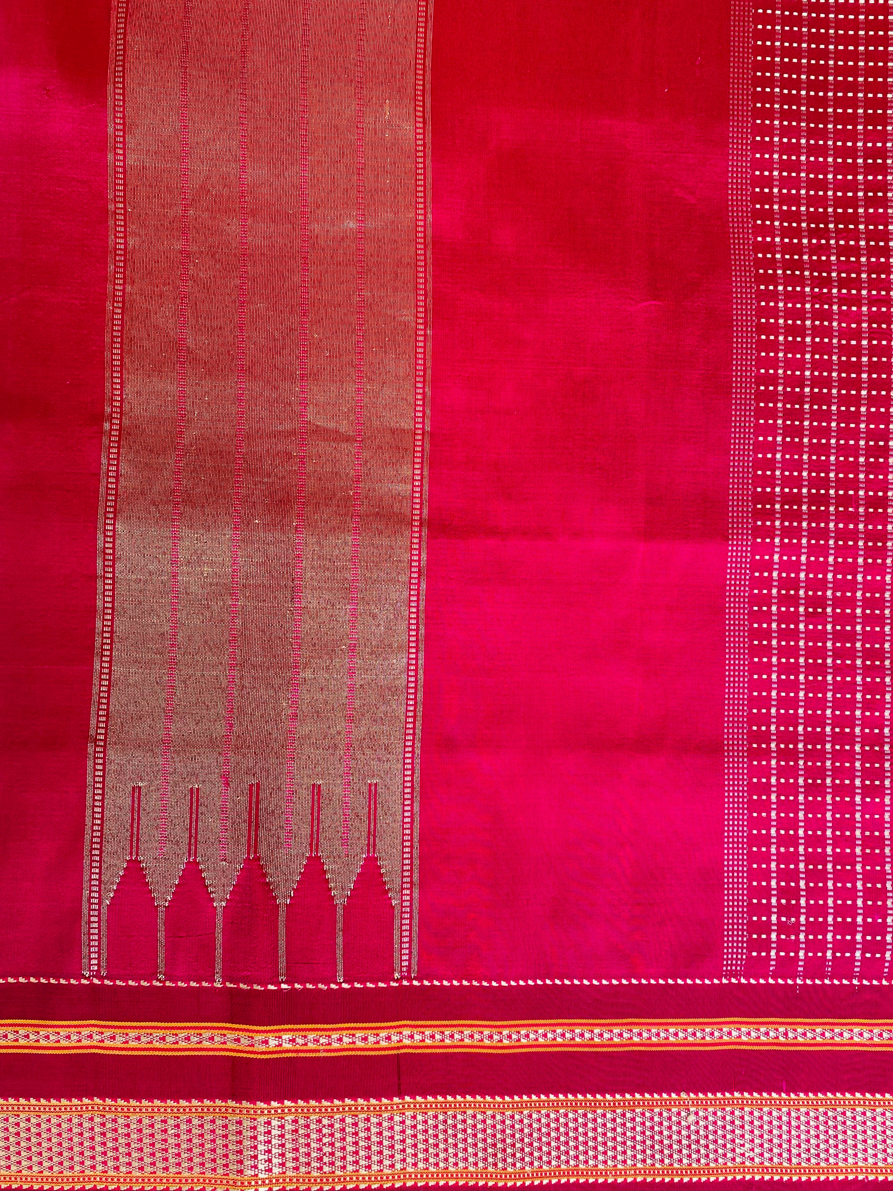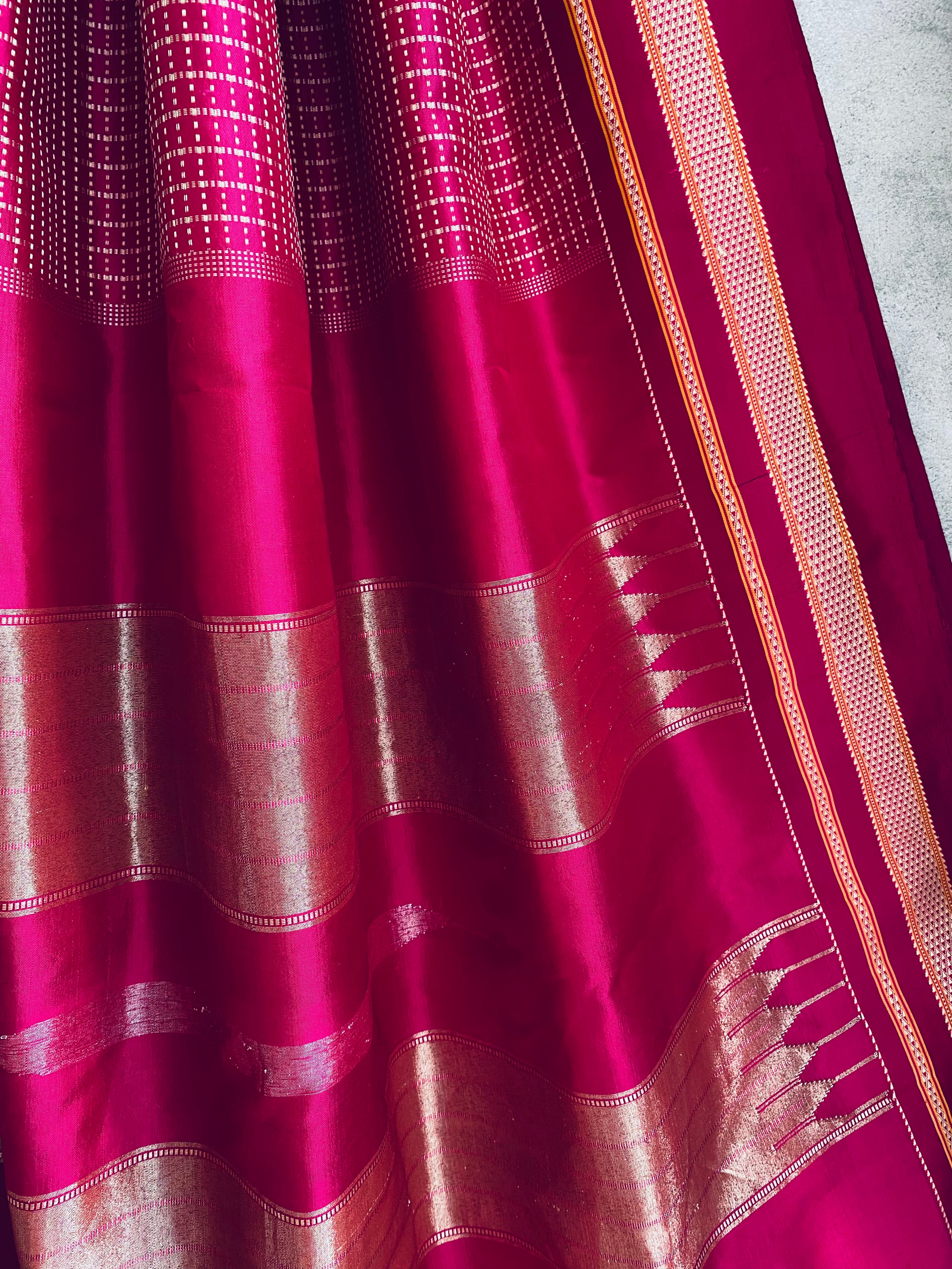 Woven on handloom (pitloom) and made of 100% mulberry silk, this saree sports a Pharaspet border and quintessential tope teni pallu made of pure zari.