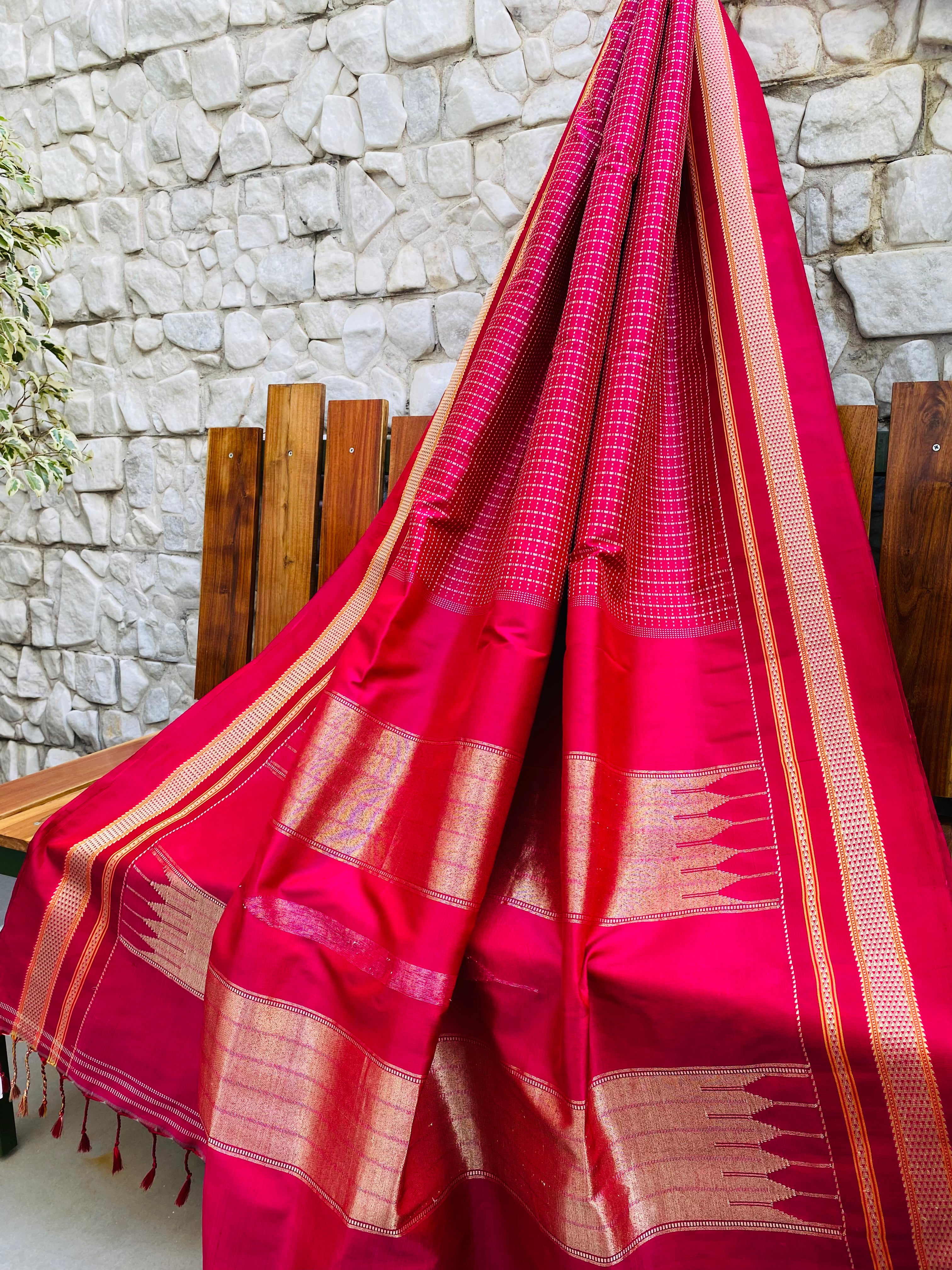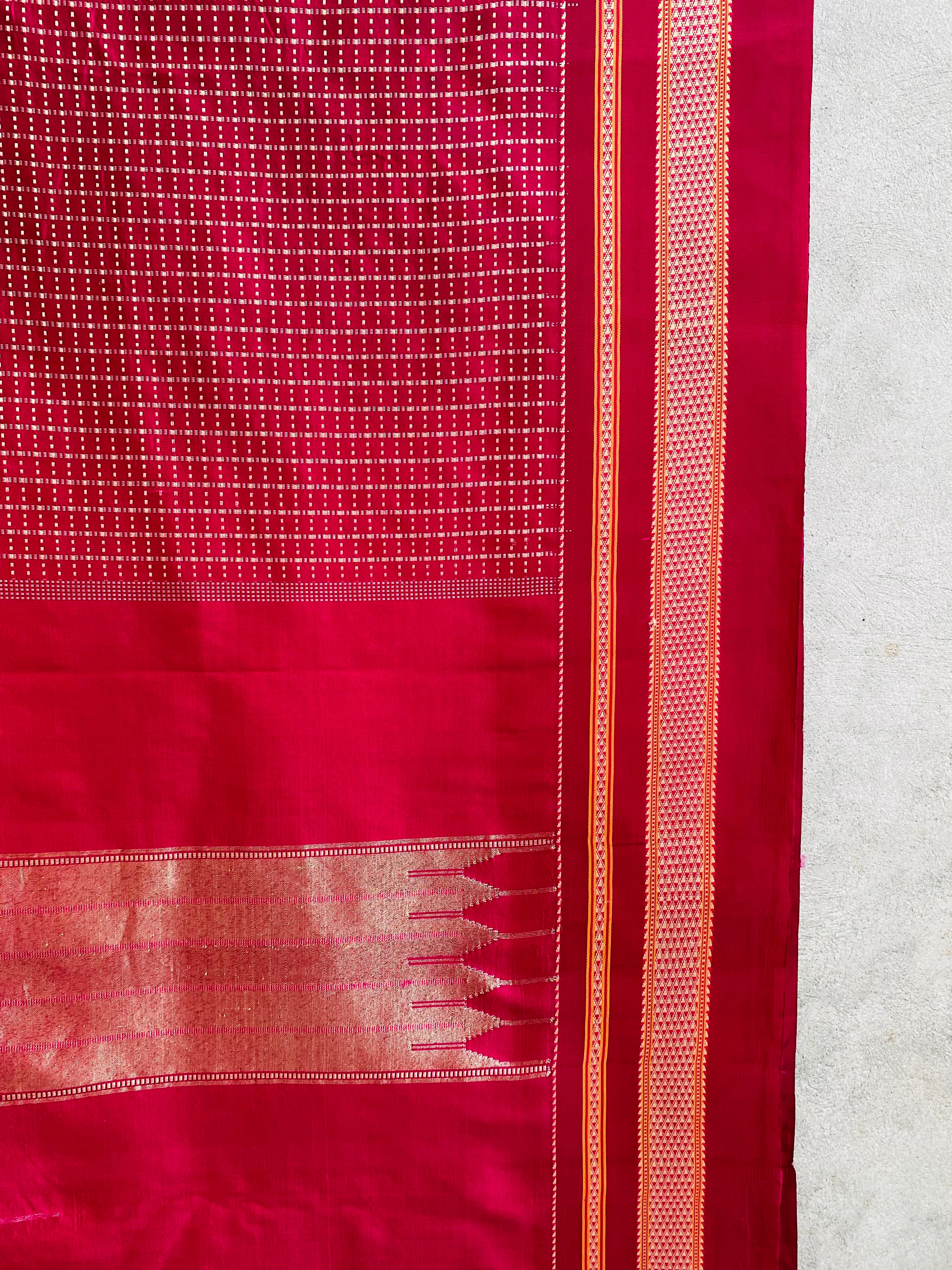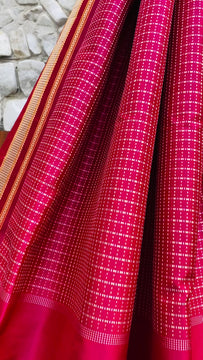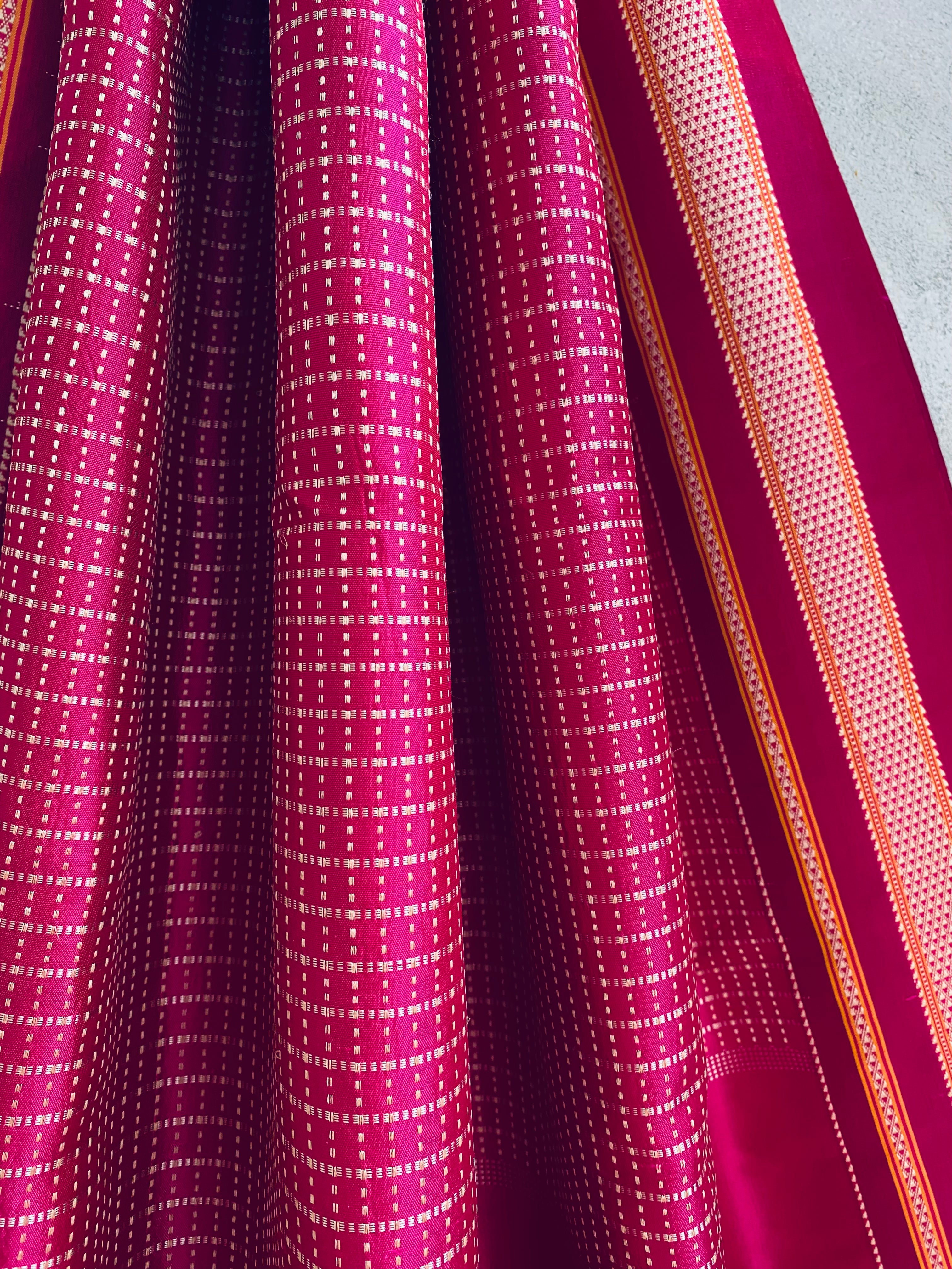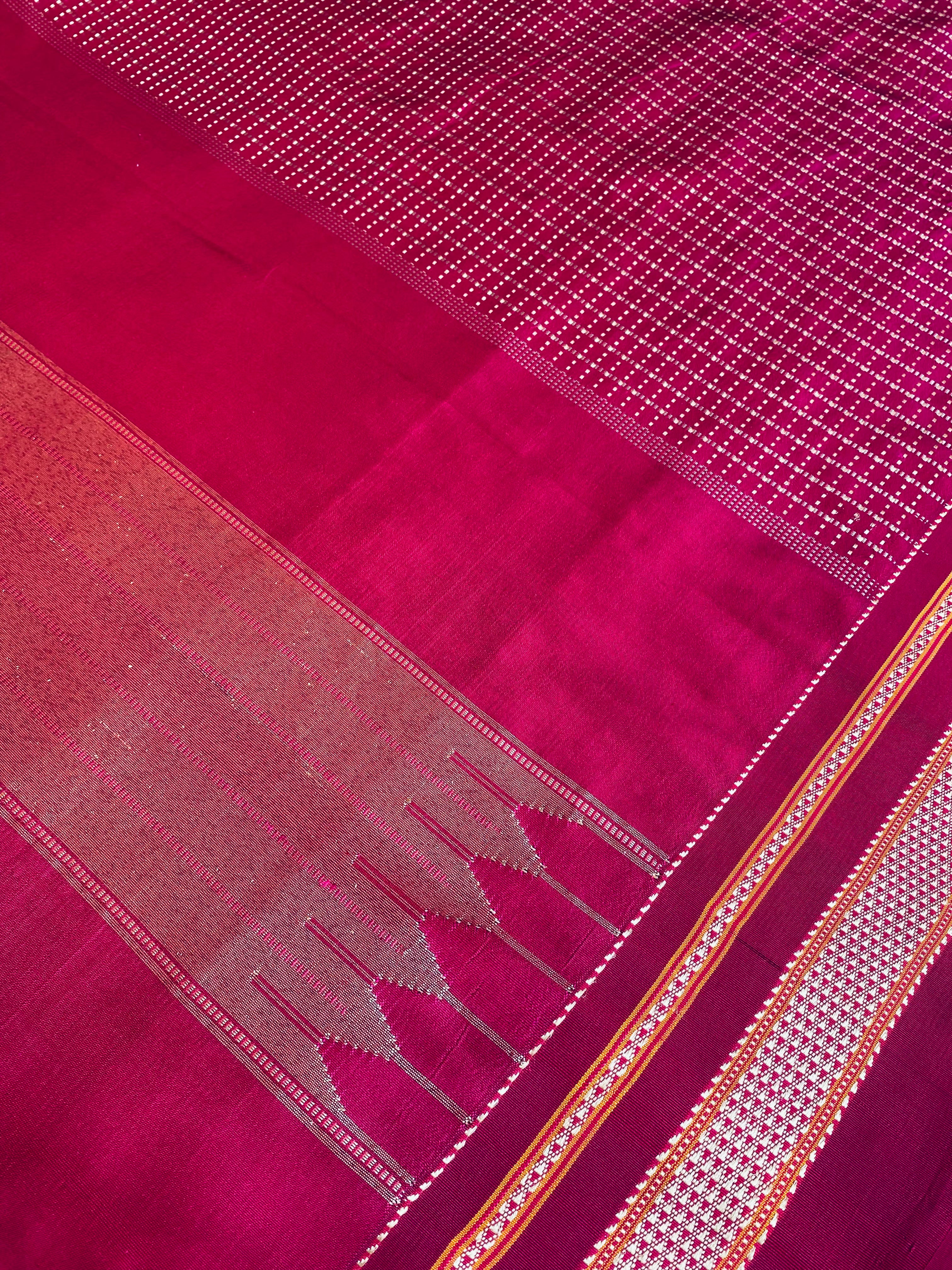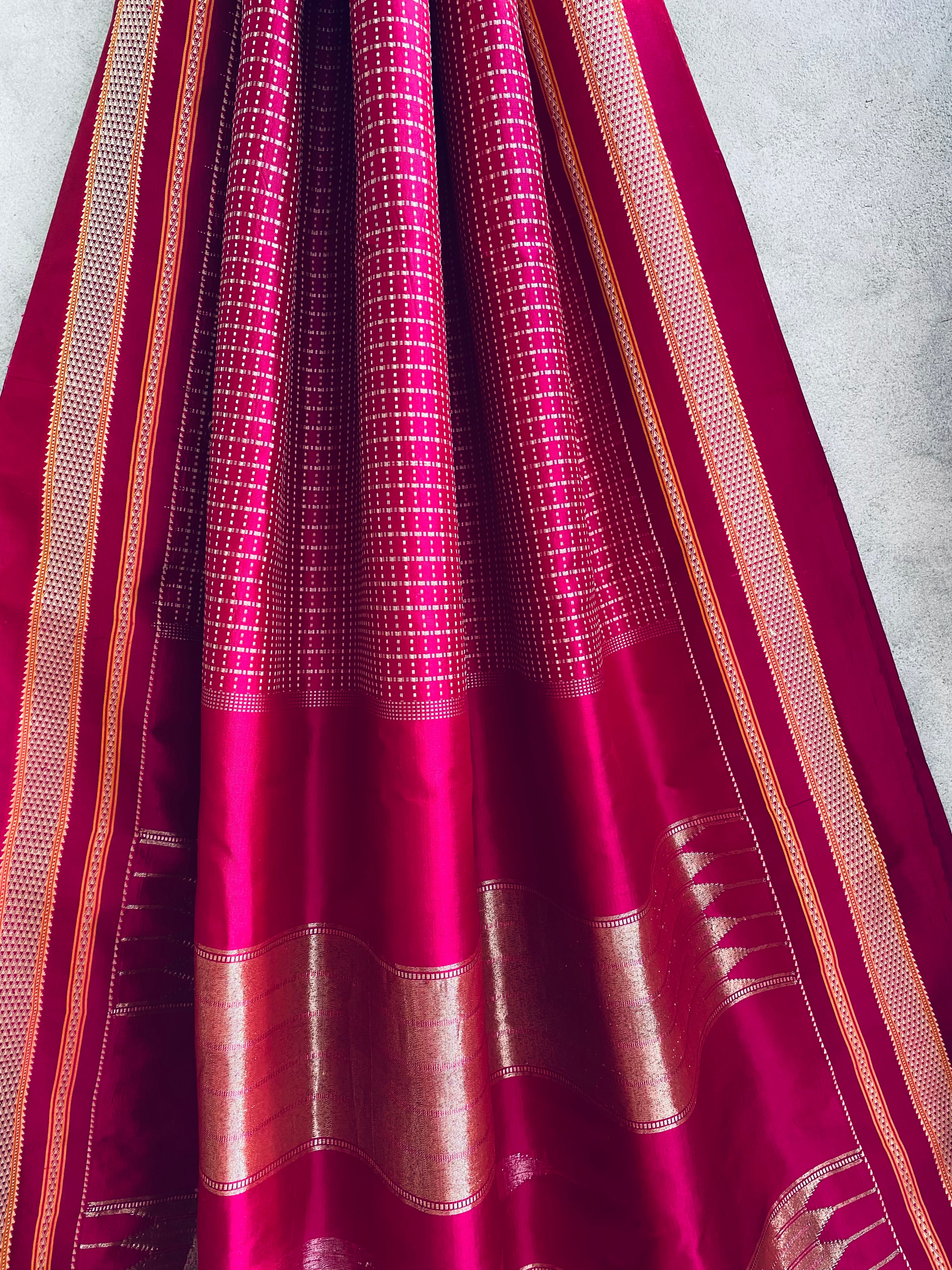 “Chathuranga”, in Sanskrit, roughly translates to “four limbs”, which refers to the ancient army divisions of infantry, cavalry, elephantry, and chariotry in a game known to be the ancestor of chess. The Chaduranga Chikki saree is considered to be the pinnacle of Ilkal weaving. The design is said to have been inspired by the game of dice played between the Pandavas and Kauravas in the great Indian epic of Mahabharata. Today, there are but a few weavers who can create an authentic Chaduranga Chikki. The hard work put in by the skilled weaver over two weeks per saree is clearly seen in the exquisiteness of each of them.