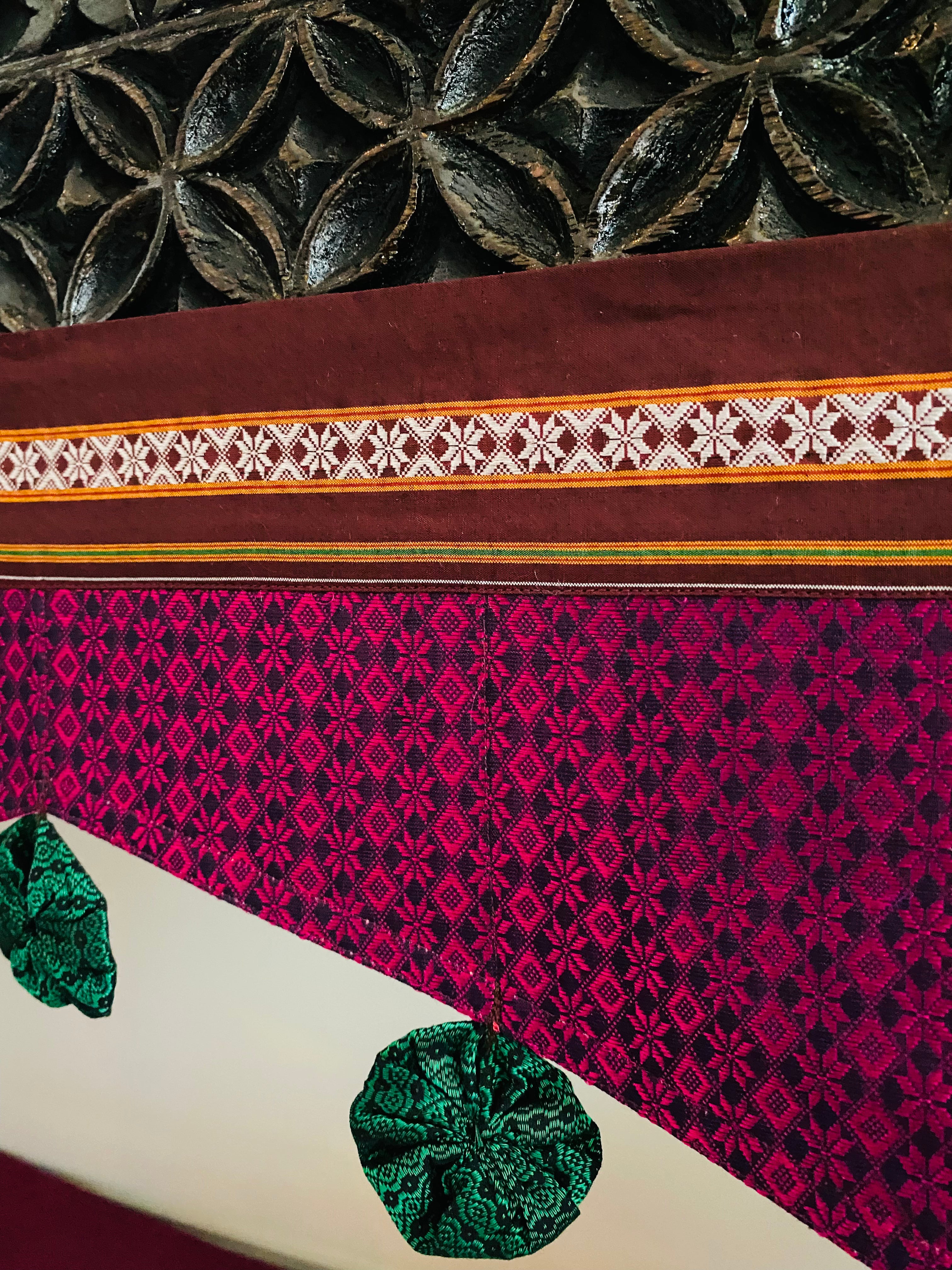 Care: Flat hand wash, flat dry in shade. Iron with thin cotton fabric covering the Toran.