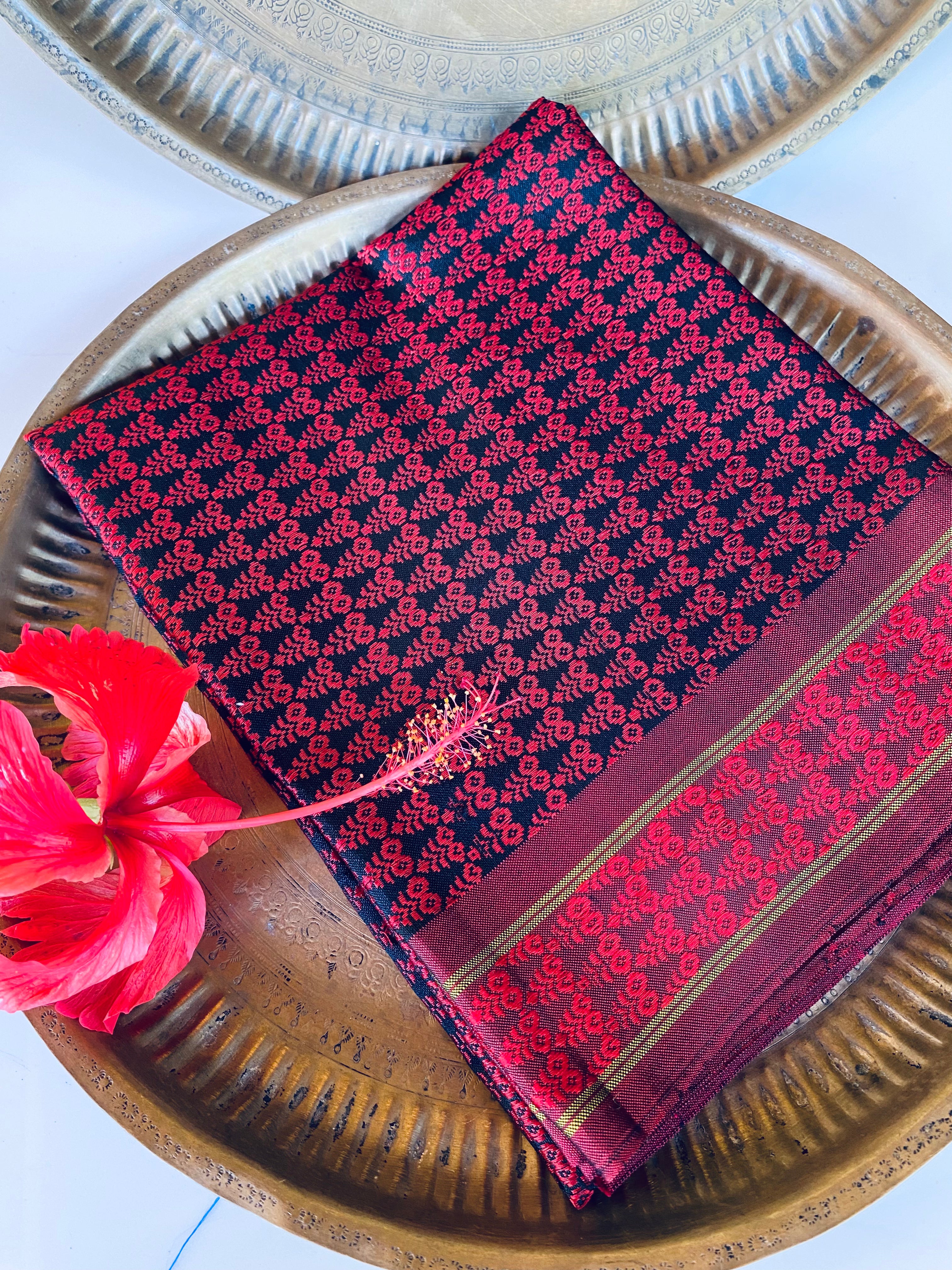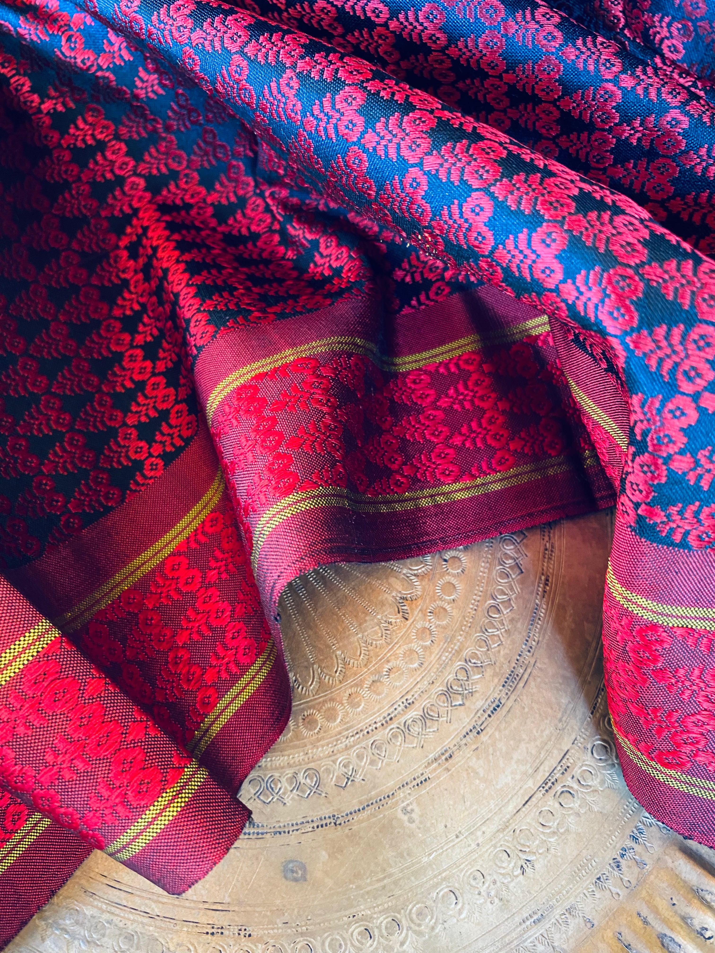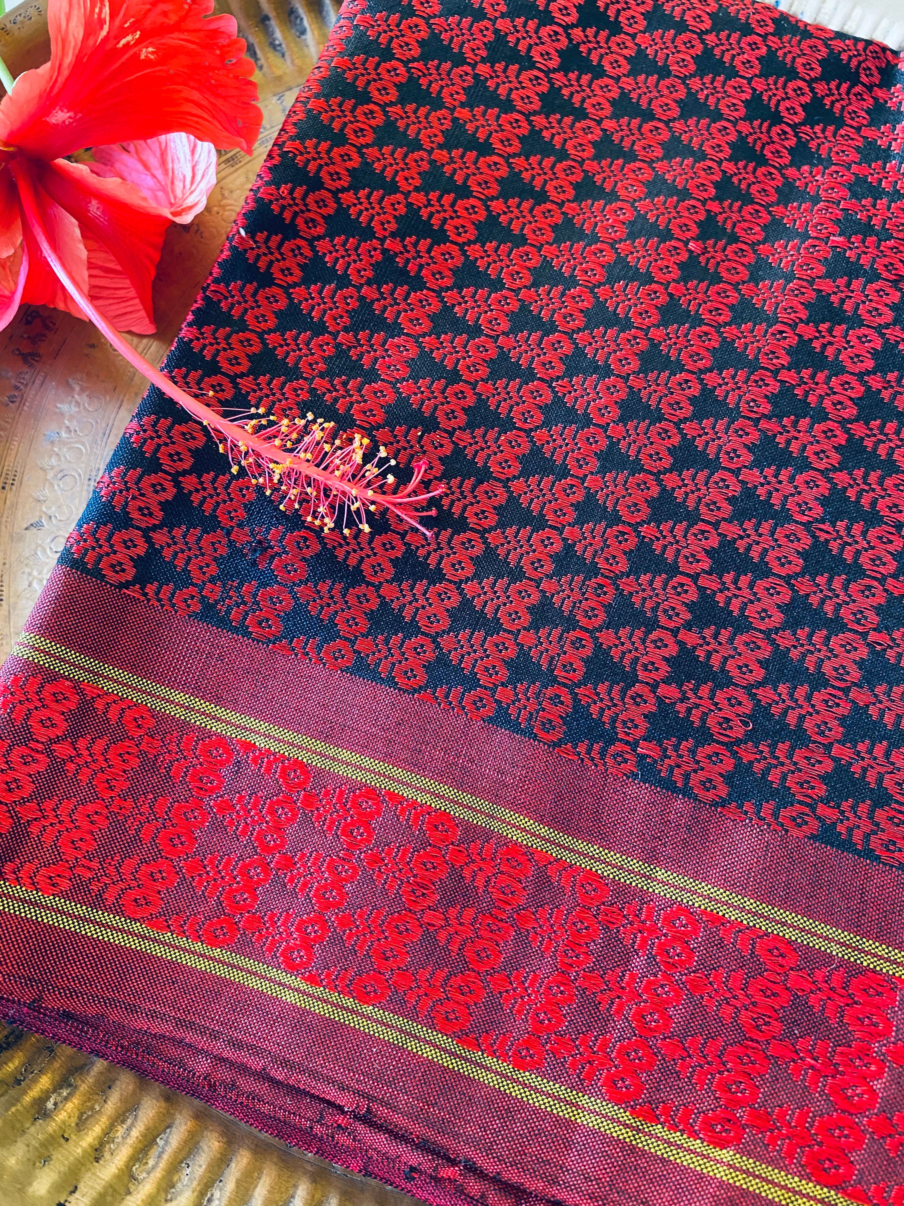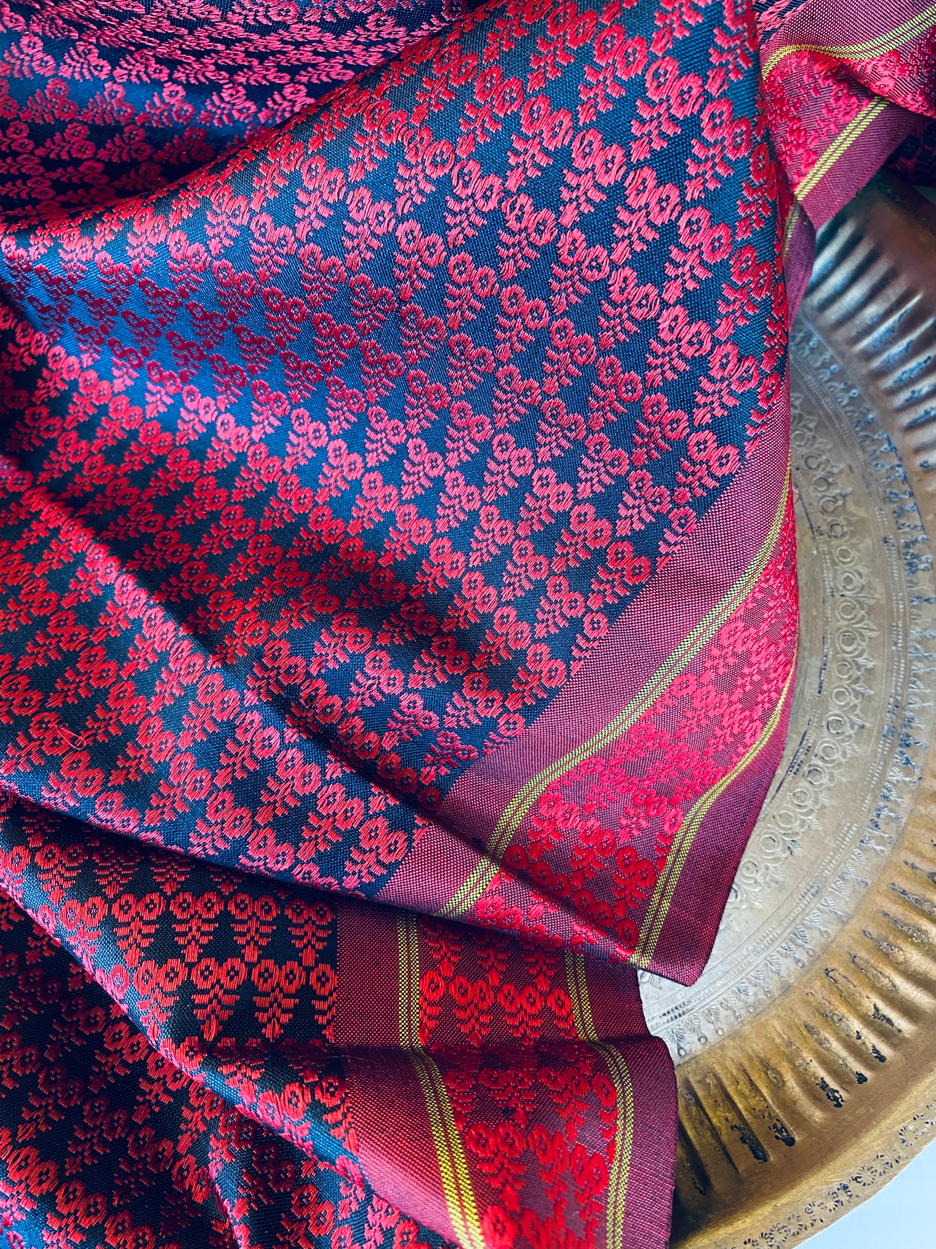 Being 100% pure mulberry silk Khunn fabric, woven on pitloom, these bear beautiful motifs, each one bearing meaning and drawing a parallel to reality, of the Ratha (chariot), Sooji Mallige (Jasmine) and Chrysanthemum, that come alive in bright jewel tones of Khunn fabric. The border is uniform on both sides of the yardage.