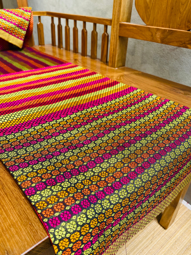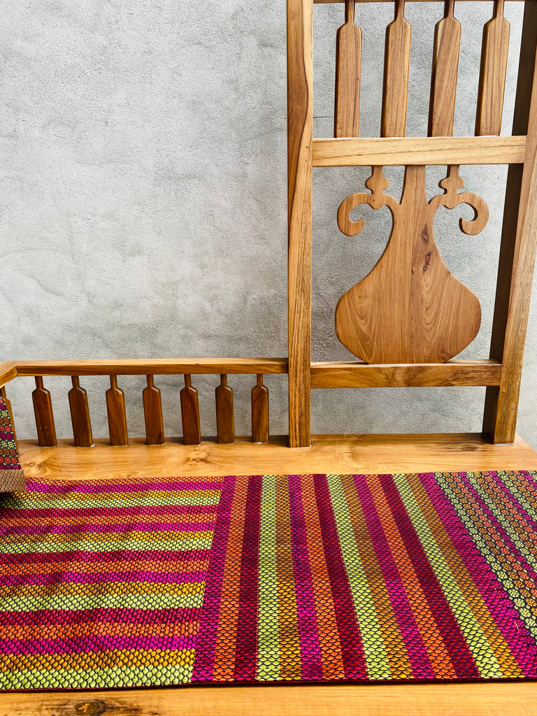 The “Aananda” collection — a celebration of happy colours and festive spirit. Yarns are dyed together and woven into two distinct fabrics, then patched to perfection to create each runner. Crafted in deep, rich tones and finished with fine topstitching, every detail reflects impeccable craftsmanship. This handcrafted table runner brings the joy of festivity to your home, with rich textures and vibrant weaves that echo the spirit of togetherness. Multiple vertical panels of different weaves are brought together to form this stunning piece that comes in both the 5 feet and 7 feet variation.