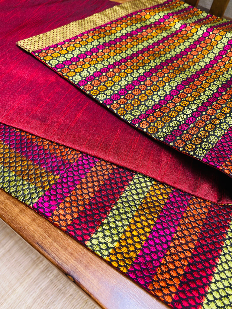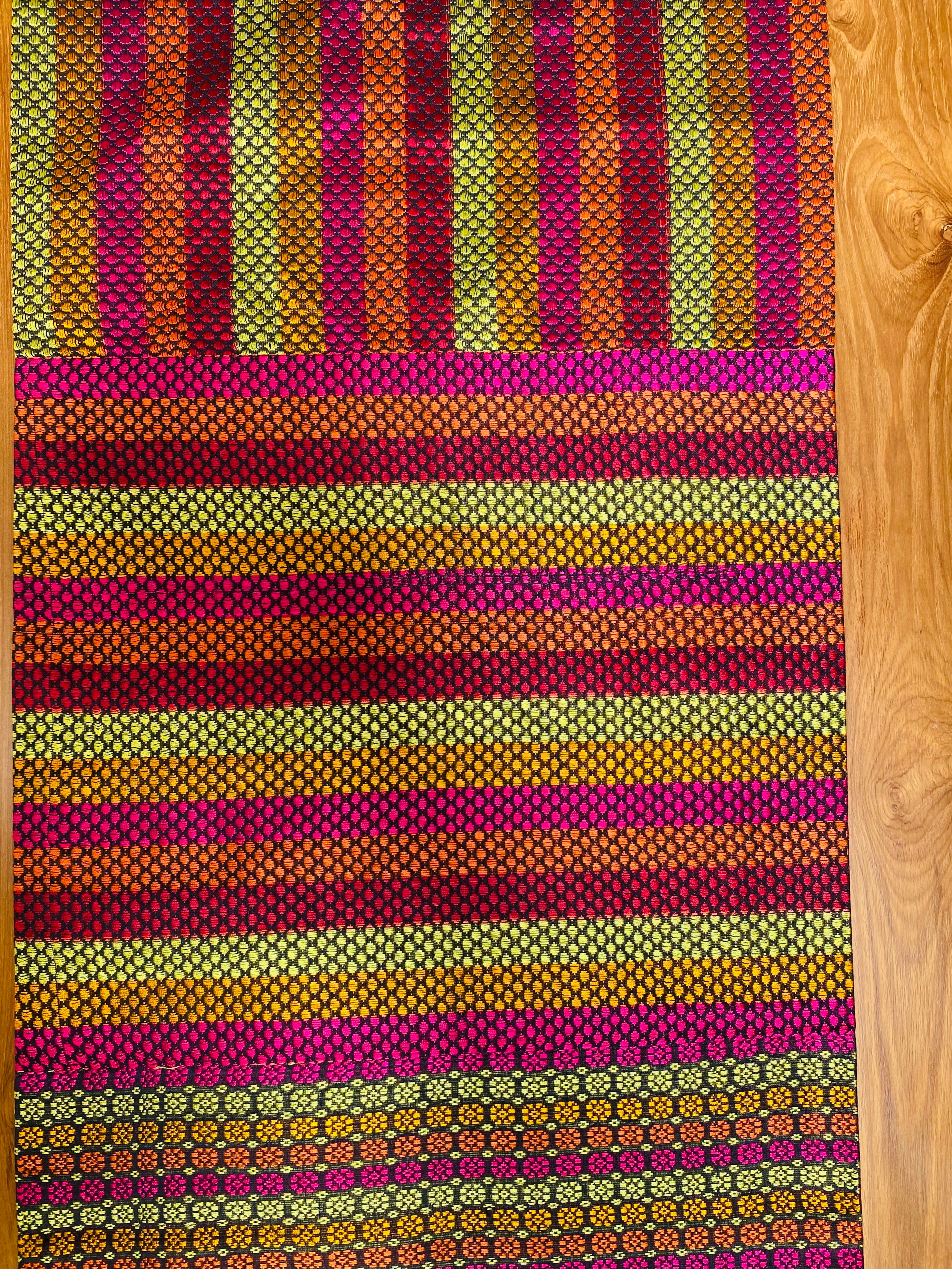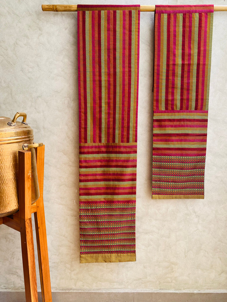 The “Aananda” collection — a celebration of happy colours and festive spirit. Yarns are dyed together and woven into two distinct fabrics, then patched to perfection to create each runner. Crafted in deep, rich tones and finished with fine topstitching, every detail reflects impeccable craftsmanship. This handcrafted table runner brings the joy of festivity to your home, with rich textures and vibrant weaves that echo the spirit of togetherness. Multiple vertical panels of different weaves are brought together to form this stunning piece that comes in both the 5 feet and 7 feet variation.