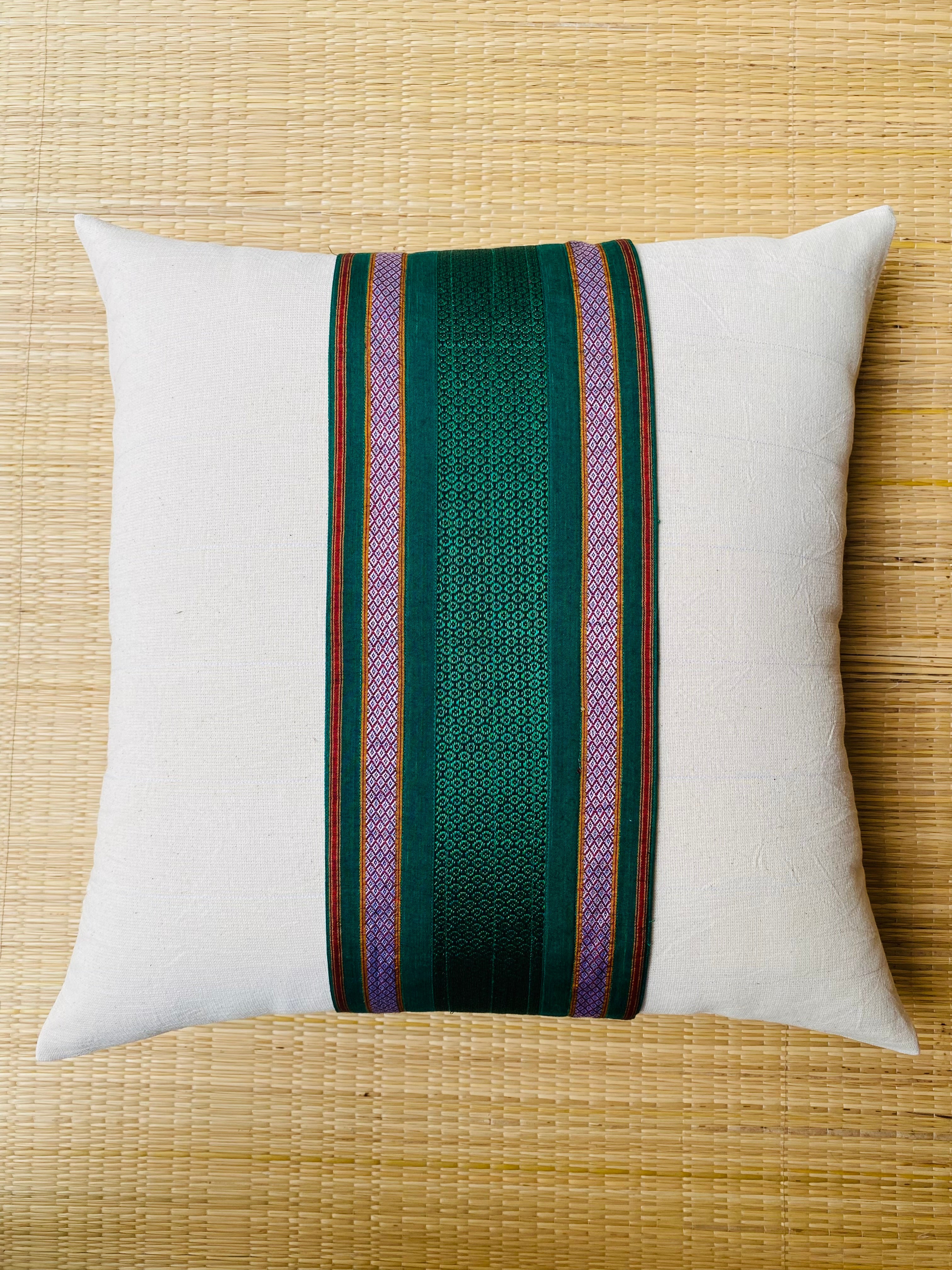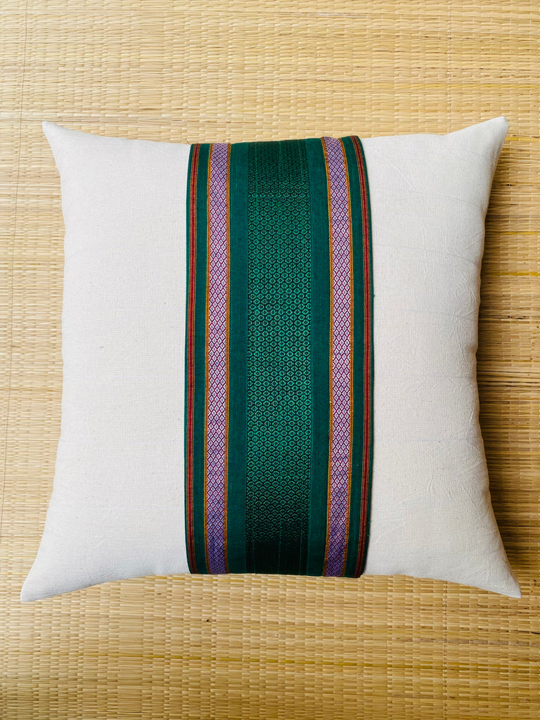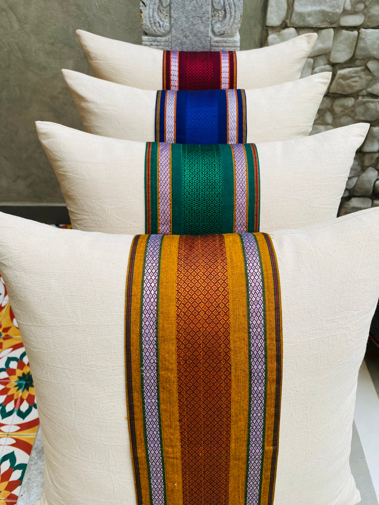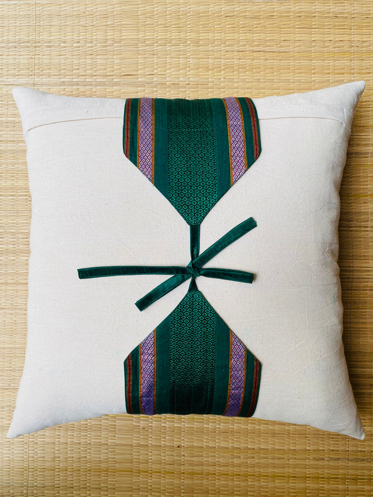 The "Varnaah Mekhala" - The 18x18 cushion covers of this collection feature a base of Kora cotton with a subtle texture. 'Mekhala', an elegant Khunn fabric belt, detailed with a contrasting border, sits beautifully against the pristine off-white base. The tie-back design allows you to adjust the fit for a snug look.