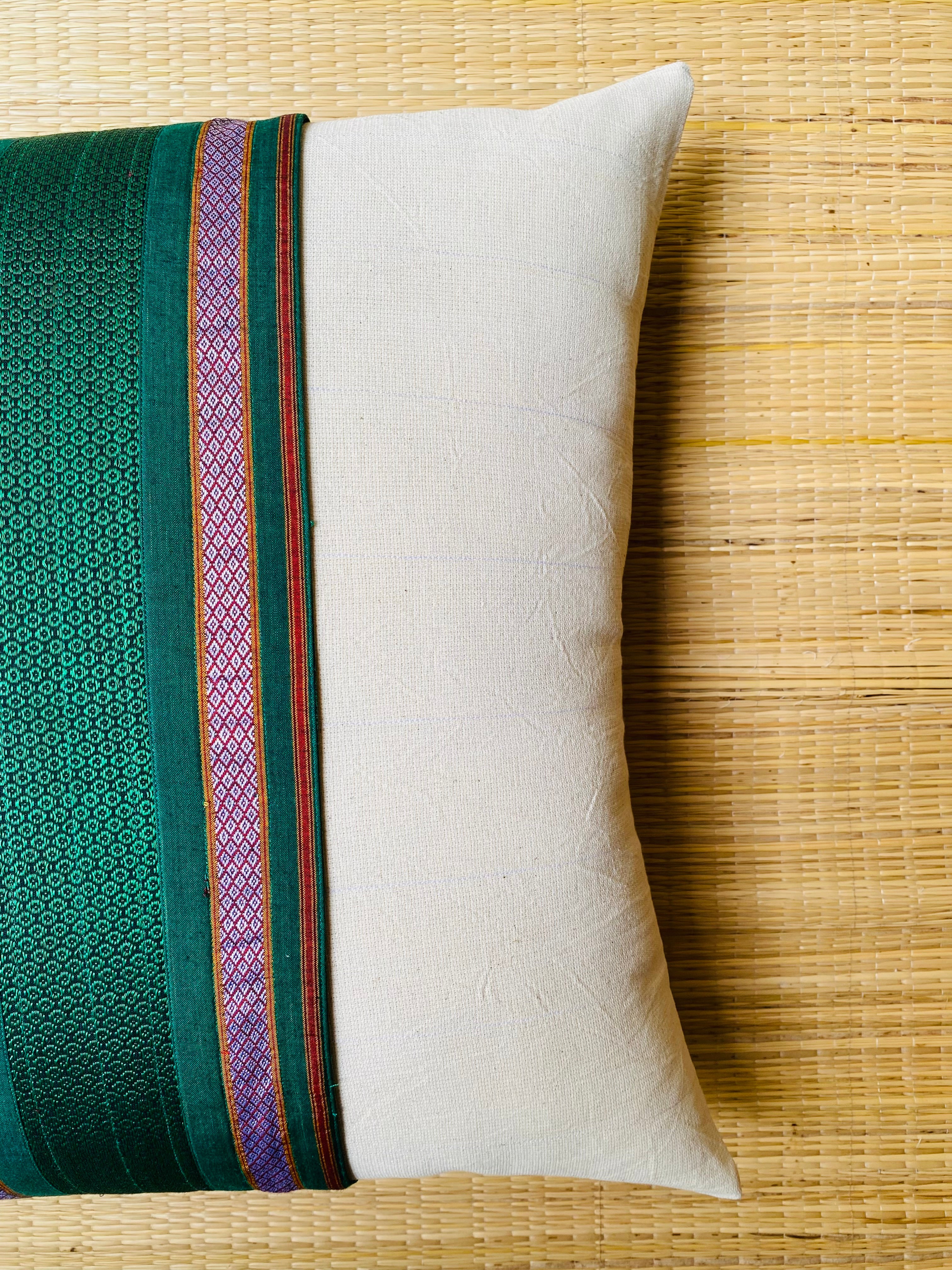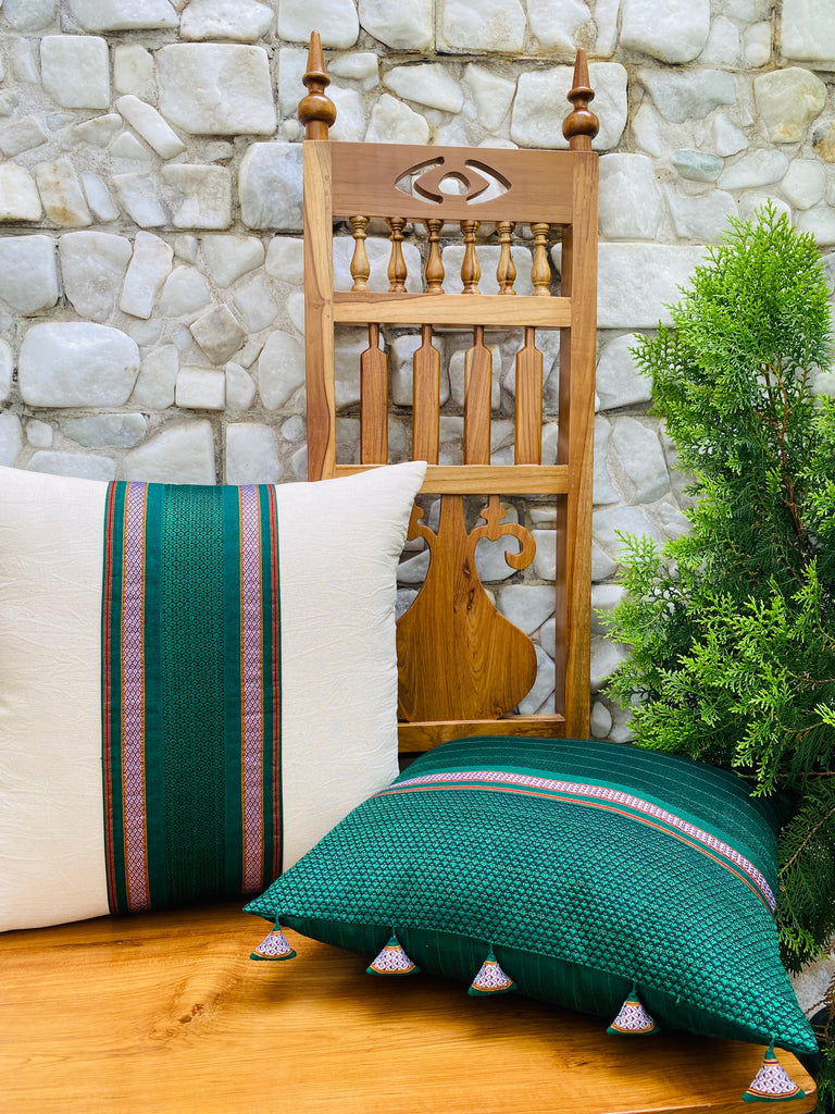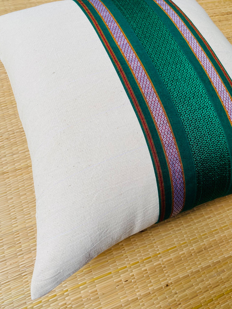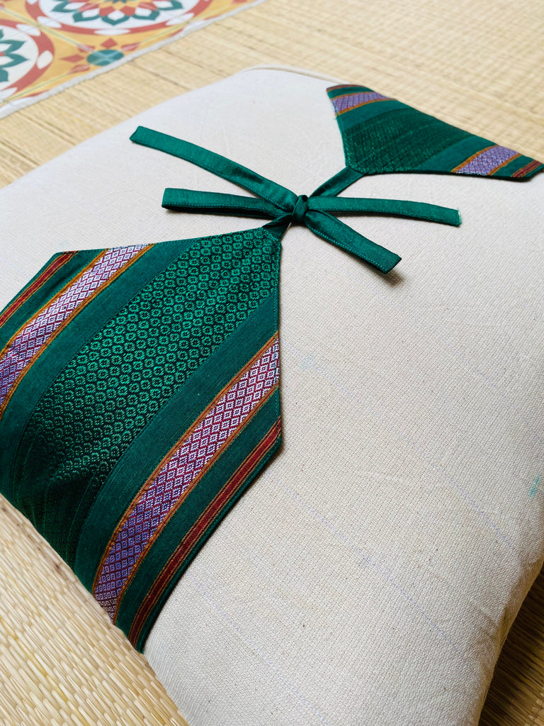 The "Varnaah Mekhala" - The 18x18 cushion covers of this collection feature a base of Kora cotton with a subtle texture. 'Mekhala', an elegant Khunn fabric belt, detailed with a contrasting border, sits beautifully against the pristine off-white base. The tie-back design allows you to adjust the fit for a snug look.