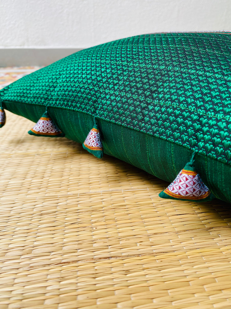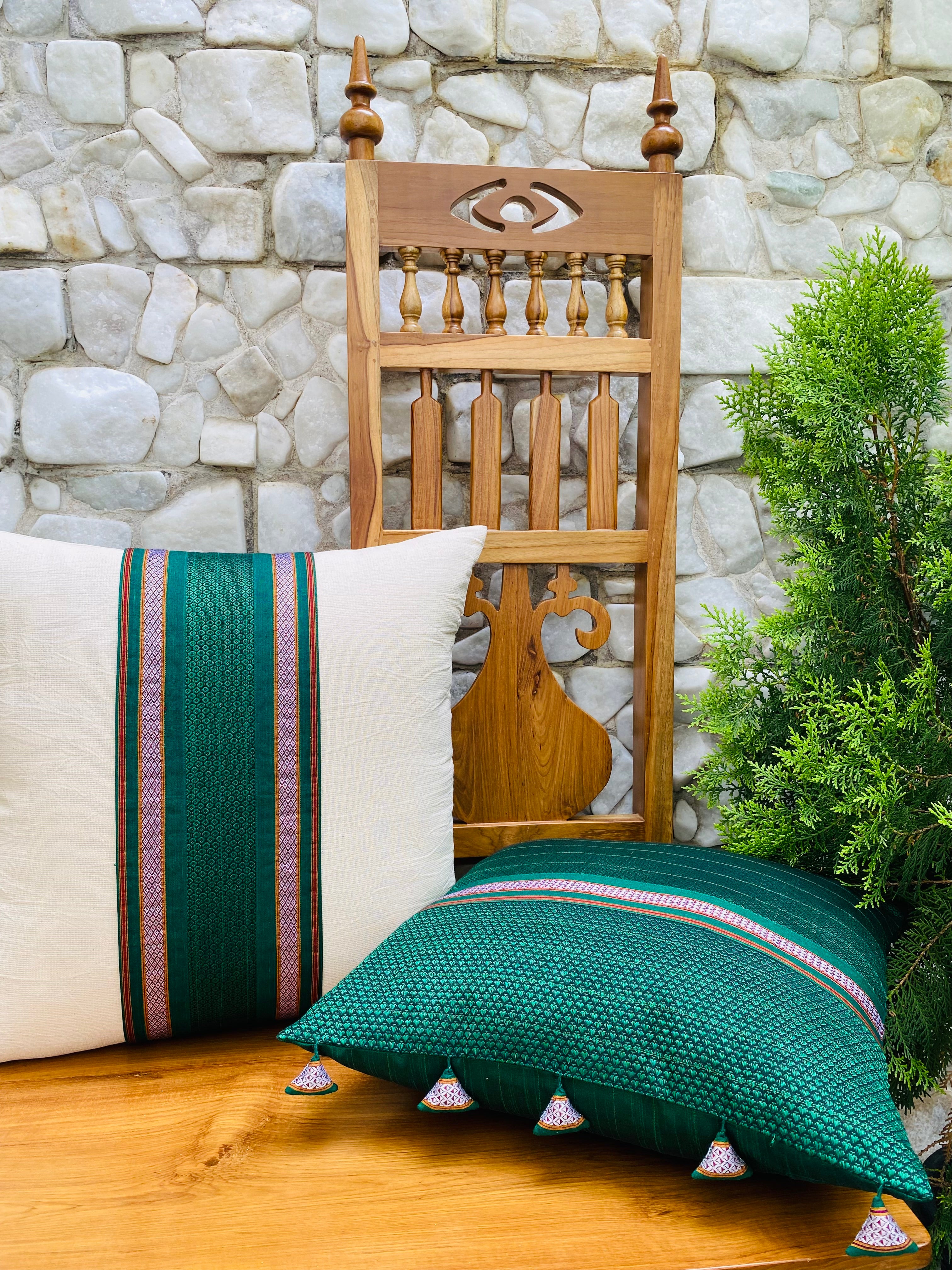 Our colour block 16x16 cushion covers that coordinate well with these 18x18s are crafted using two different weaves of Khunn fabric in the same colour family, bordered elegantly in matching tones. Designed to blend seamlessly across collections, these pieces come together in vibrant colour stacks — topstitched to perfection. Each cushion features delicate gubbis (meaning sparrows in the language Kannada), made by a group of women artisans from Honavar, bringing both beauty and livelihood into every piece. These gubbis are then handstitched by our extremely skilled kaarigars to dangle beautifully from the edge of the cushion cover.