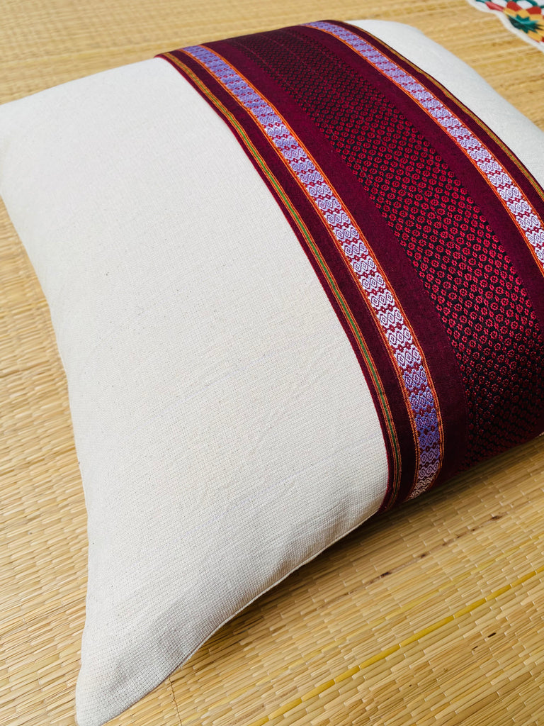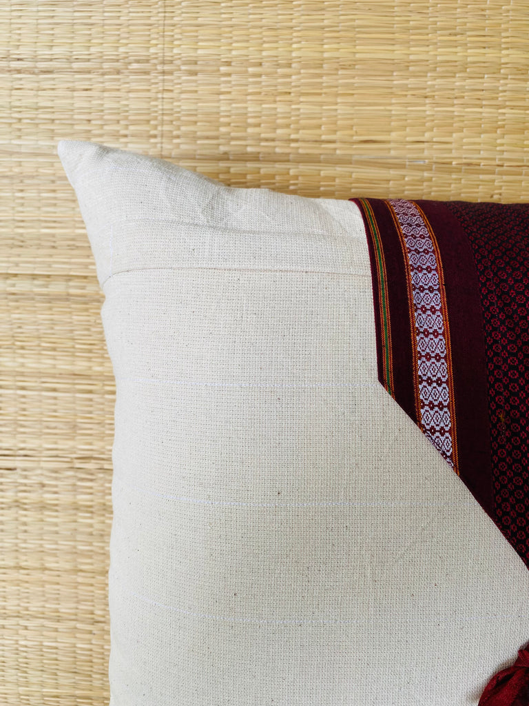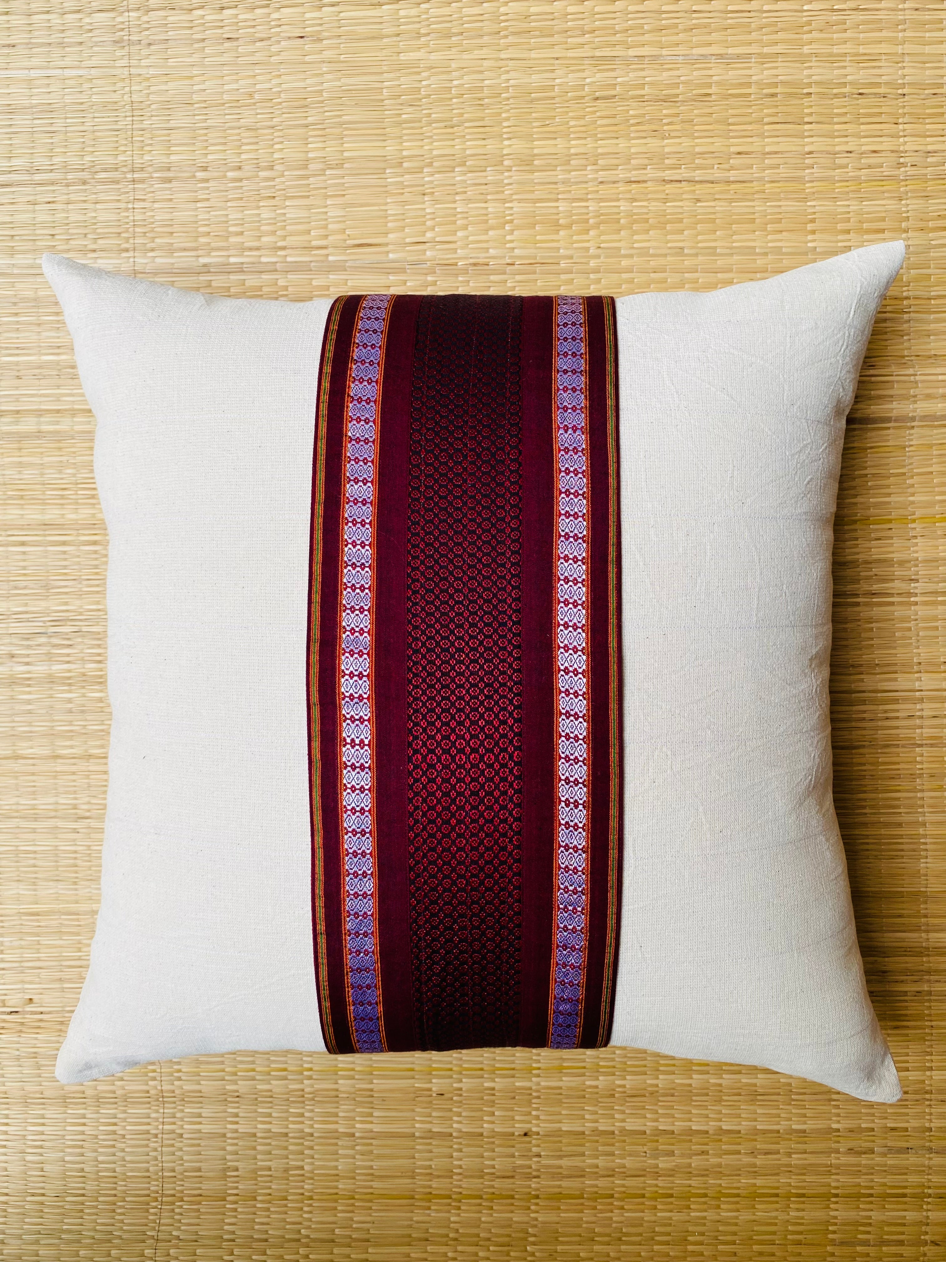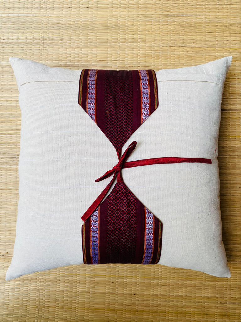 The "Varnaah Mekhala" - The 18x18 cushion covers of this collection feature a base of Kora cotton with a subtle texture. 'Mekhala', an elegant Khunn fabric belt, detailed with a contrasting border, sits beautifully against the pristine off-white base. The tie-back design allows you to adjust the fit for a snug look.