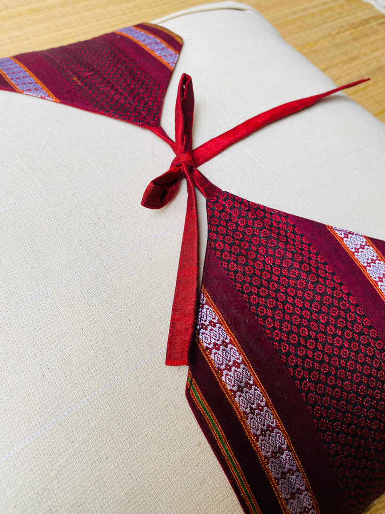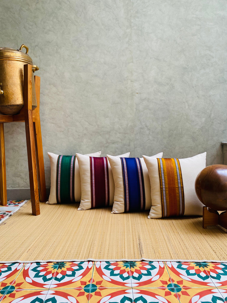 Our colour block 16x16 cushion covers that coordinate well with these 18x18s are crafted using two different weaves of Khunn fabric in the same colour family, bordered elegantly in matching tones. Designed to blend seamlessly across collections, these pieces come together in vibrant colour stacks — topstitched to perfection. Each cushion features delicate gubbis (meaning sparrows in the language Kannada), made by a group of women artisans from Honavar, bringing both beauty and livelihood into every piece. These gubbis are then handstitched by our extremely skilled kaarigars to dangle beautifully from the edge of the cushion cover.