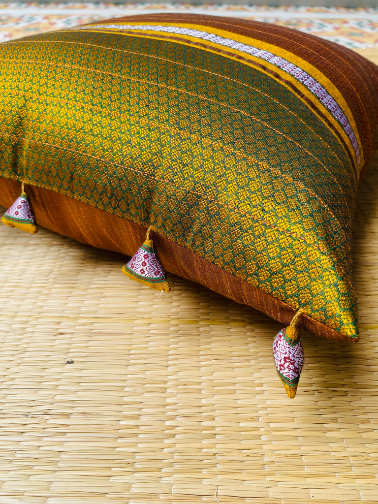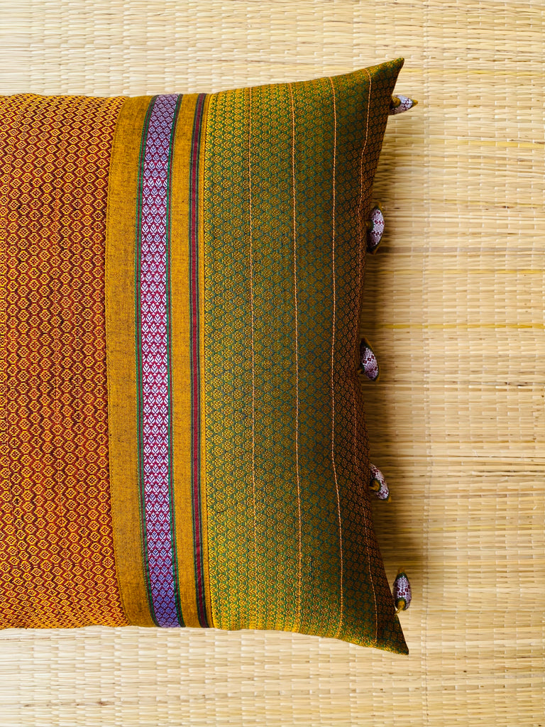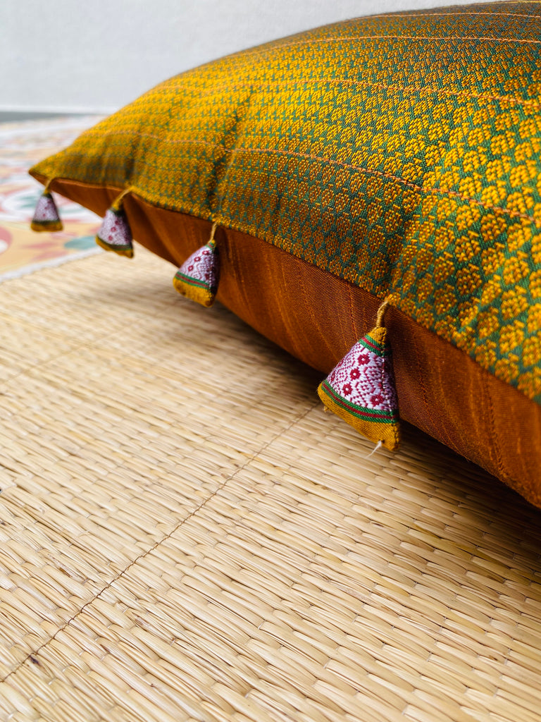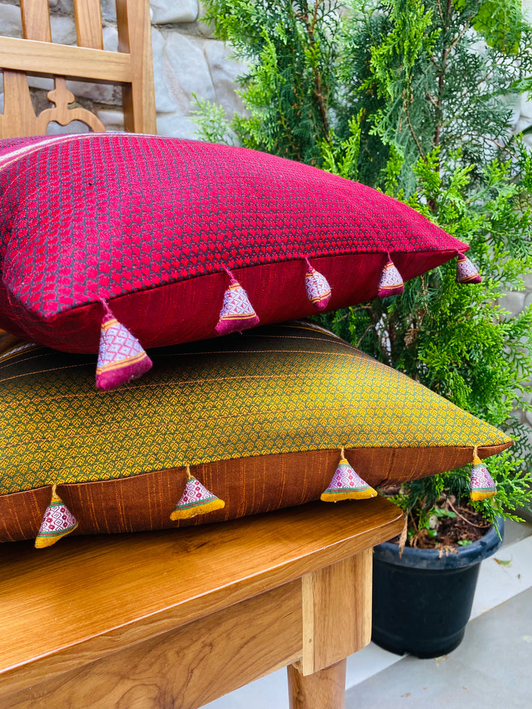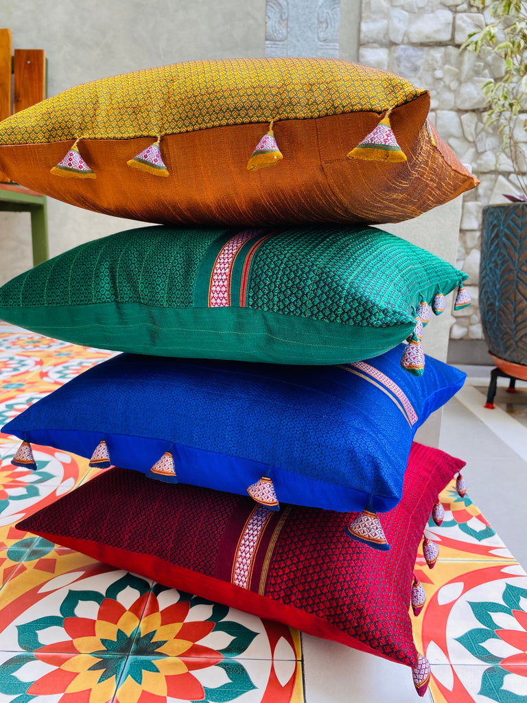 The "Varnaah" Collection - Our colour block 16x16 cushion covers are crafted using two different weaves of Khunn fabric in the same colour family, bordered elegantly in matching tones. Designed to blend seamlessly across collections, these pieces come together in vibrant colour stacks — topstitched to perfection. Each cushion features delicate gubbis (meaning sparrows in the language Kannada), made by a group of women artisans from Honavar, bringing both beauty and livelihood into every piece. These gubbis are then handstitched by our extremely skilled kaarigars to dangle beautifully from the edge of the cushion cover.