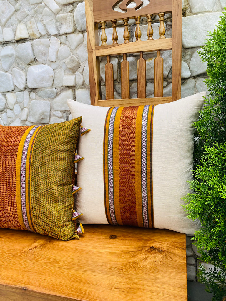 The 18x18 cushion covers of this collection feature a base of Kora cotton with a subtle texture. 'Mekhala', an elegant Khunn fabric belt, detailed with a contrasting border, sits beautifully against the pristine off-white base. The tie-back design allows you to adjust the fit for a snug look.